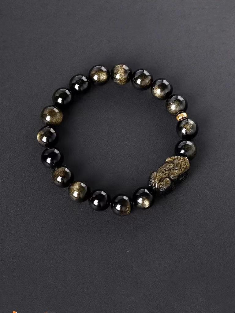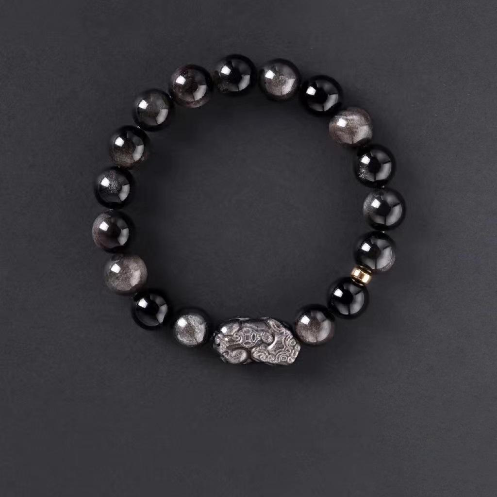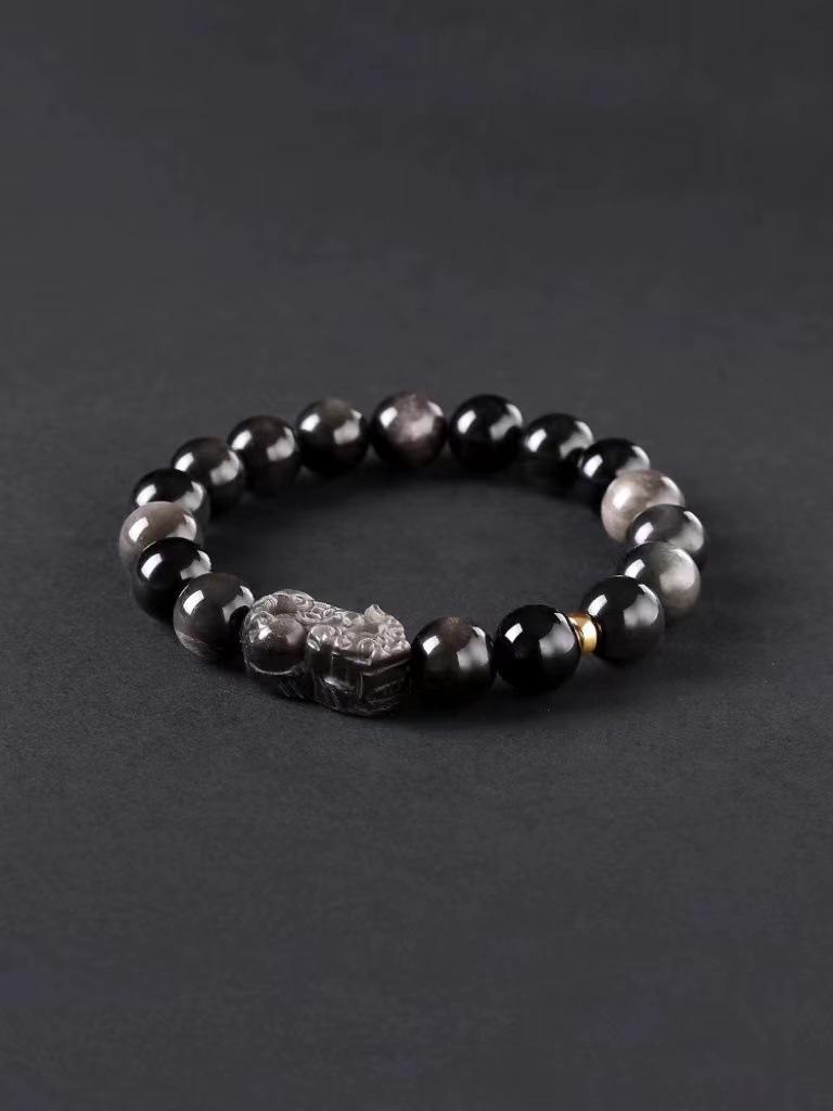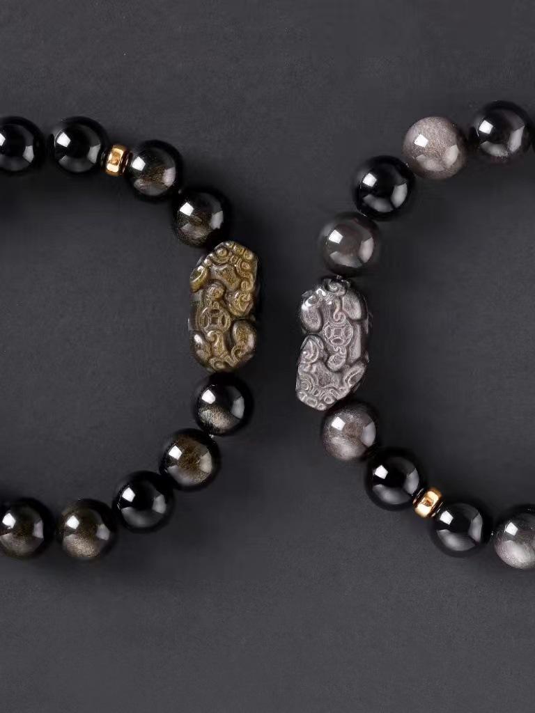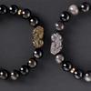 Gold obsidian pixiu 10mm, Silver obsidian pixiu 10mm, White crystal + silver obsidian pixiu 10mm