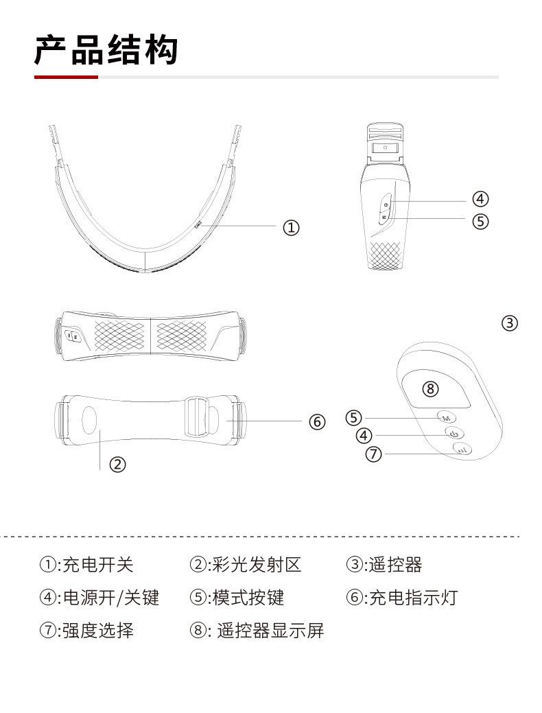 2.5 modos, 15 niveles de ajuste de intensidad; 3. Fuente de luz de cinco colores (rojo, naranja, verde, azul, púrpura),