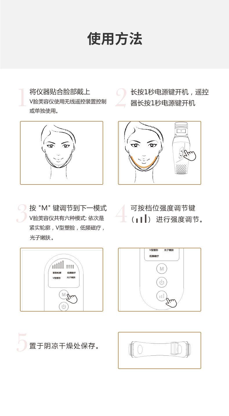 Ajuste la banda para la cabeza y úsela debajo de la barbilla para que su rostro se ajuste a la forma de V del producto. Mantenga presionado el botón de encendido durante 3 segundos para encenderlo. Mantenga presionado para seleccionar el modo. El ajuste predeterminado es 1. Presione +/- para ajustar la intensidad. El ajuste es 1-8. Mantenga presionado el botón de encendido para apagarlo.