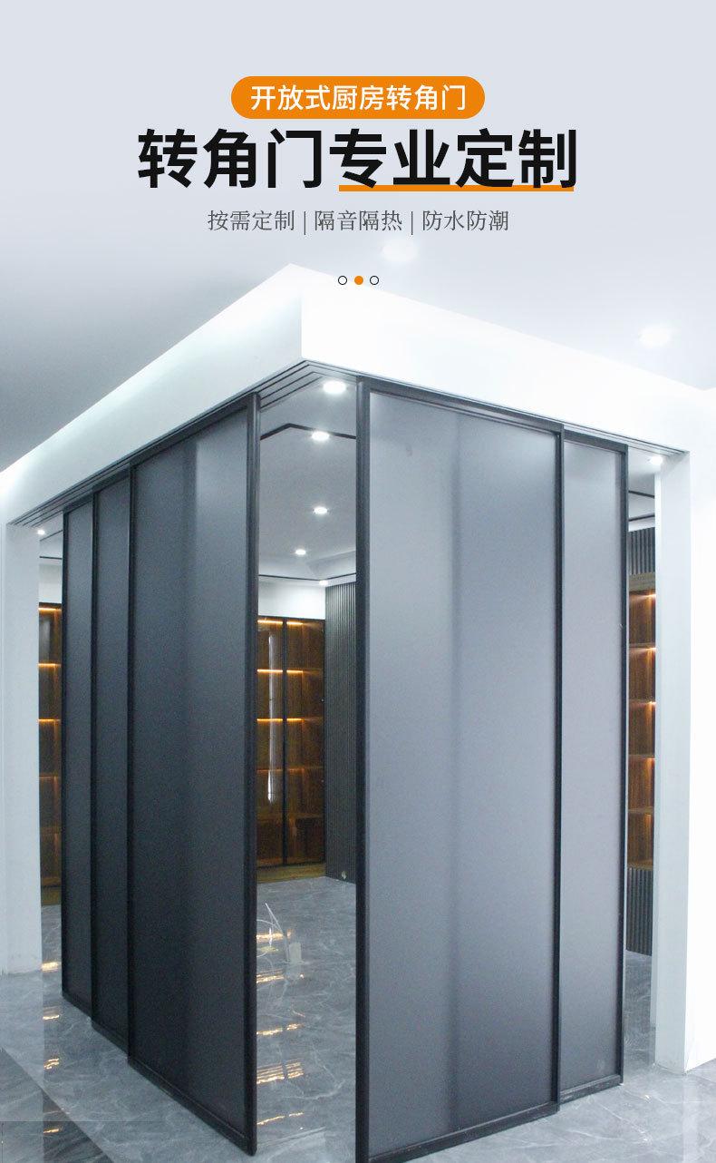Puerta de cocina abierta de aleación de aluminio personalizada, con esquina lateral estrecha, vidrio templado hueco, aislamiento acústico, puerta corrediza en forma de L
