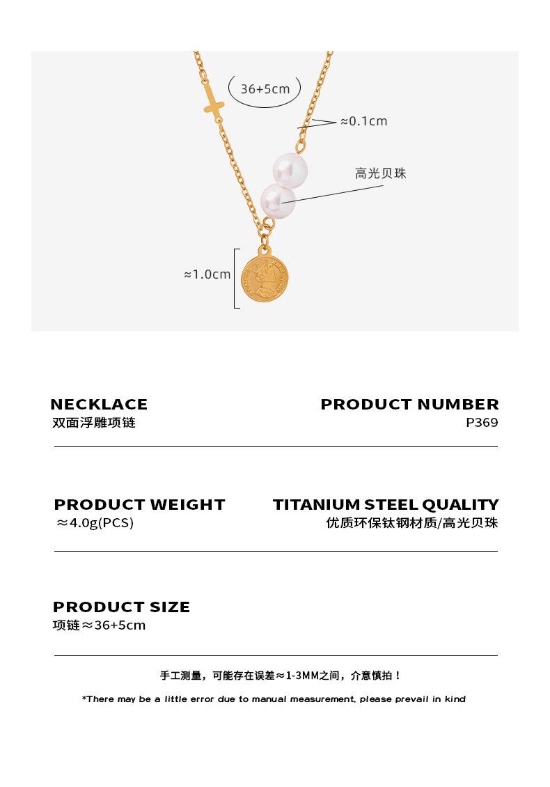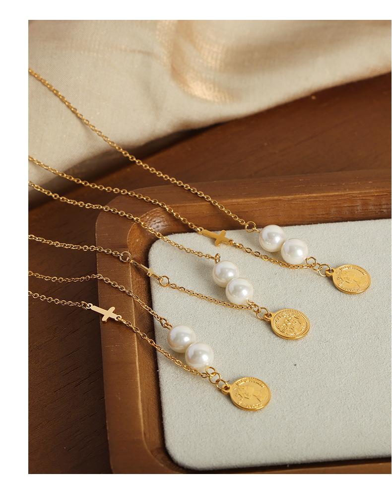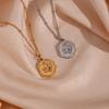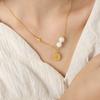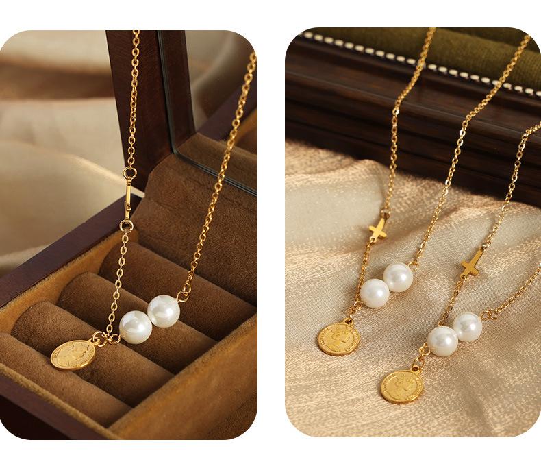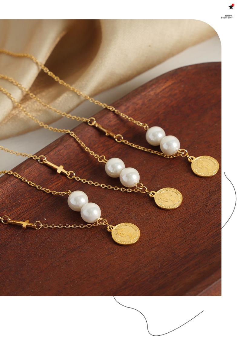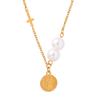 Collar colgante redondo de marca con figura en relieve a doble cara, accesorios de cruz, cadena cosida con cuentas de concha, acero de titanio, temperamento versátil, cadena para clavícula