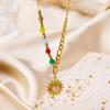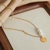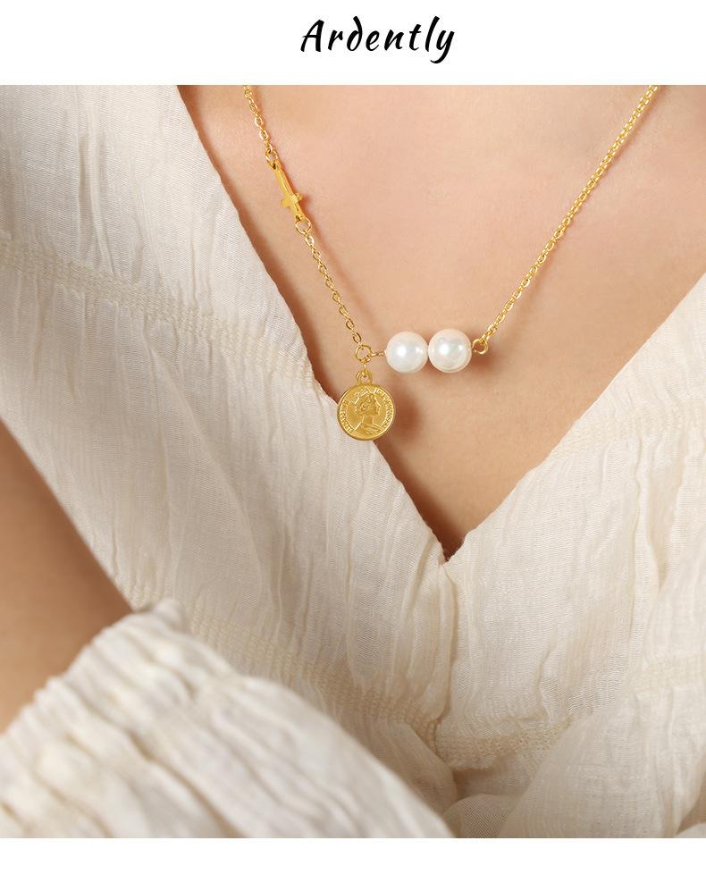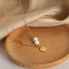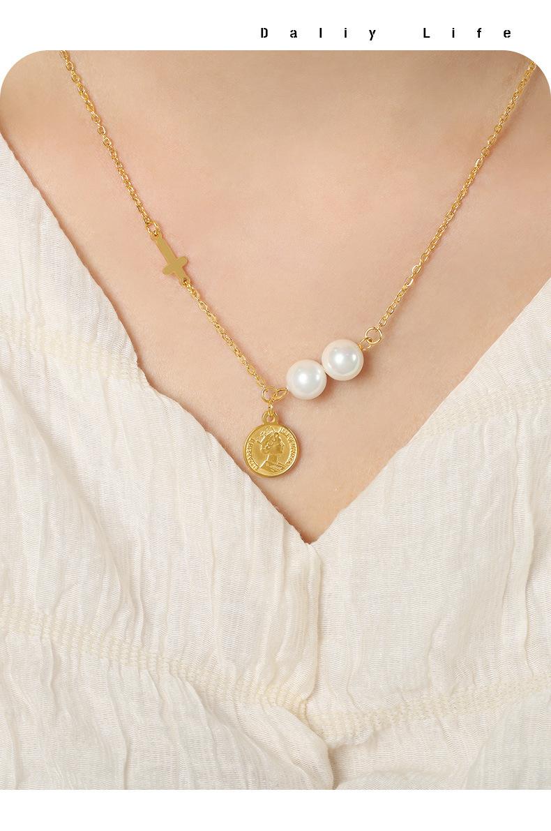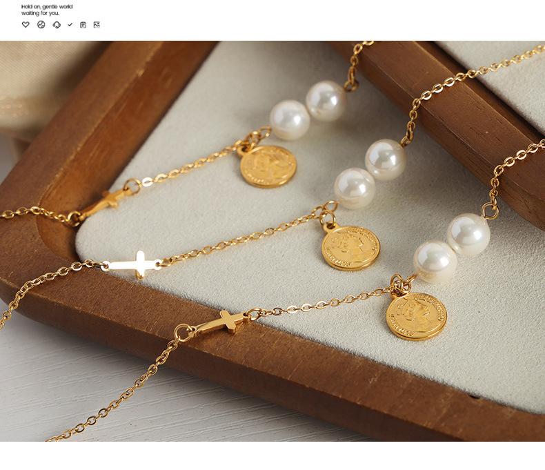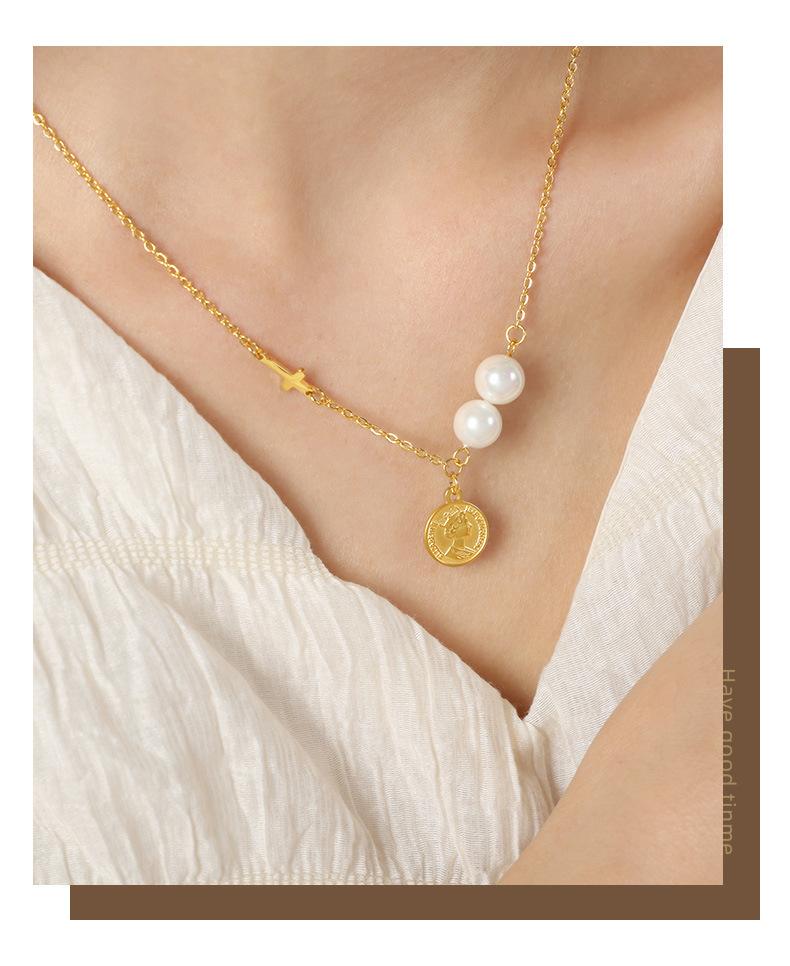 Collar colgante redondo de marca con figura en relieve a doble cara, accesorios de cruz, cadena cosida con cuentas de concha, acero de titanio, temperamento versátil, cadena para clavícula
