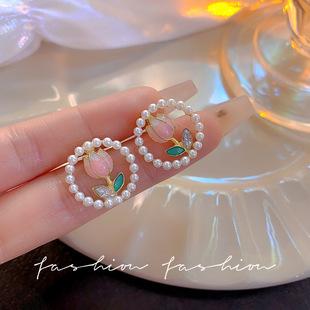 Pendientes de tulipán para mujer, bonitos y dulces pendientes de flores rosas, diseño de nicho, pequeños pendientes de perlas frescas de alta gama.
