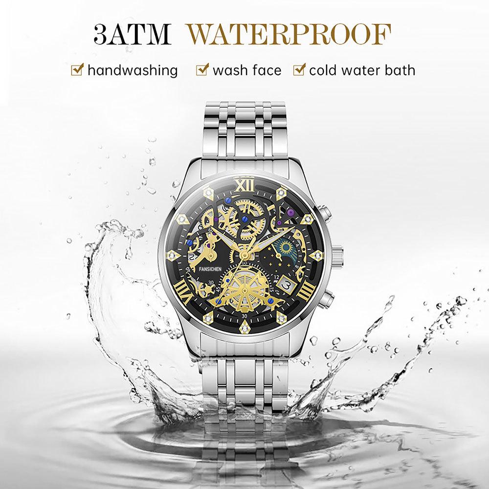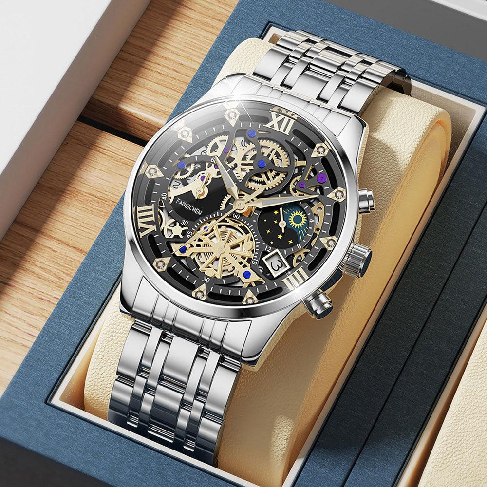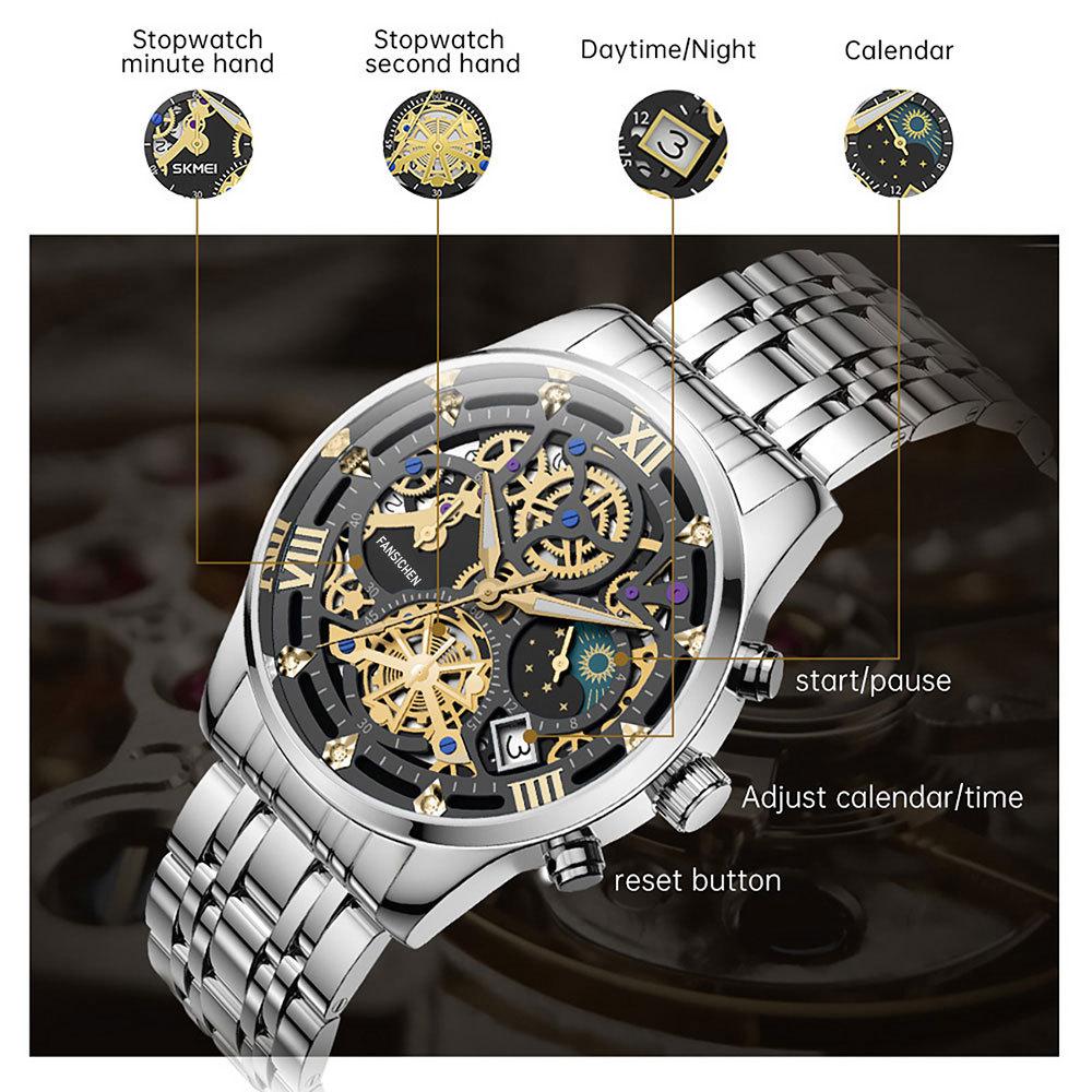 Reloj de Hombre Richard Calendario Hueco Reloj de Cuarzo Acero Inoxidable Multifuncional Seis Agujas Resistente al Agua Negocios Impermeable
