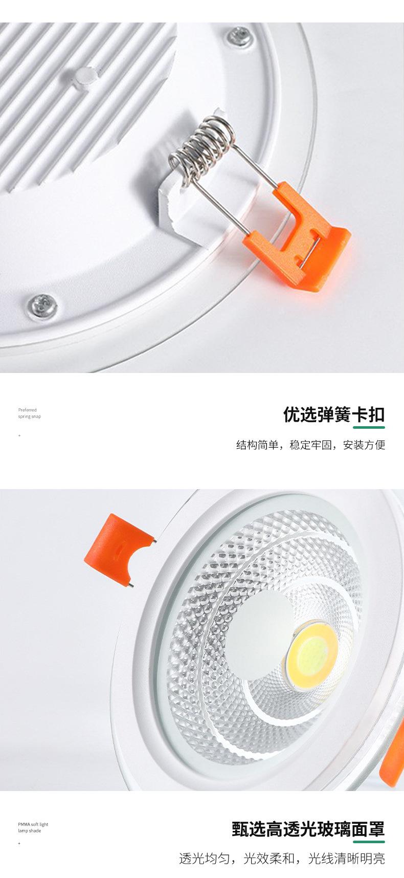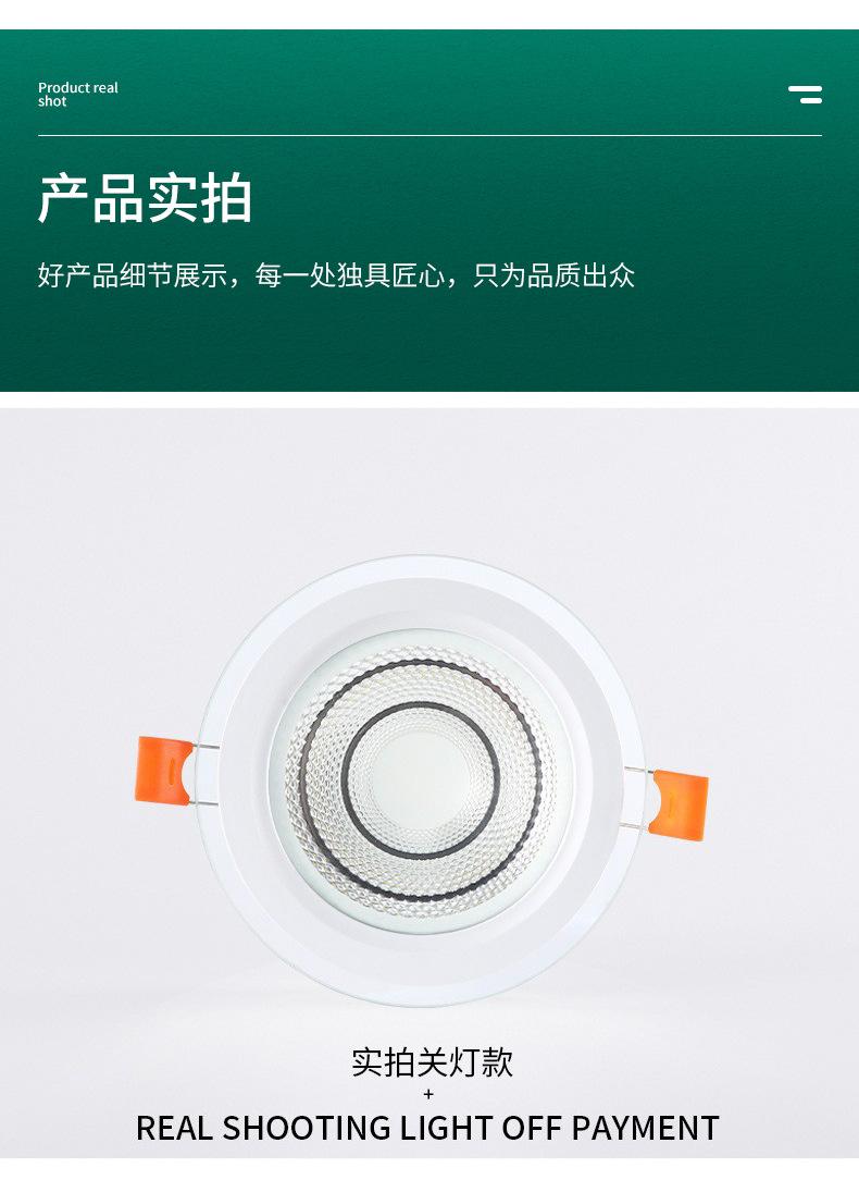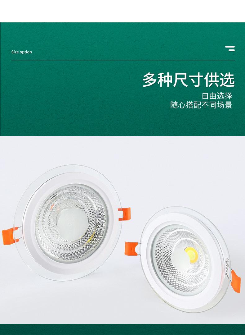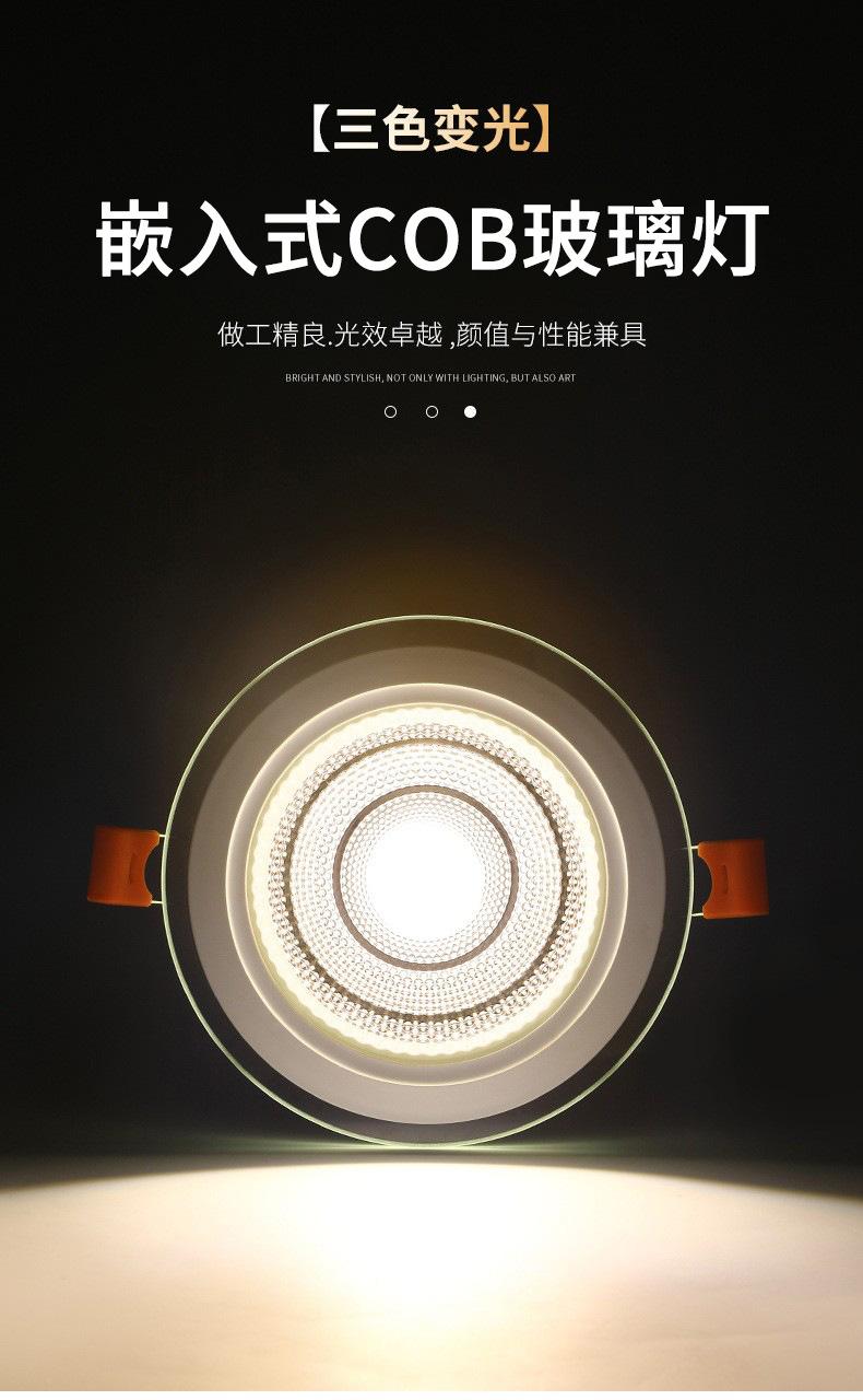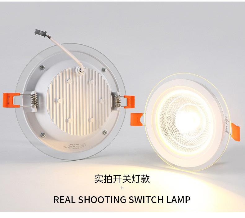 Lámpara de panel de vidrio LED, foco COB, lámpara de techo empotrada, downlight comercial, lámpara de techo con cambio de luz de tres colores, venta al por mayor