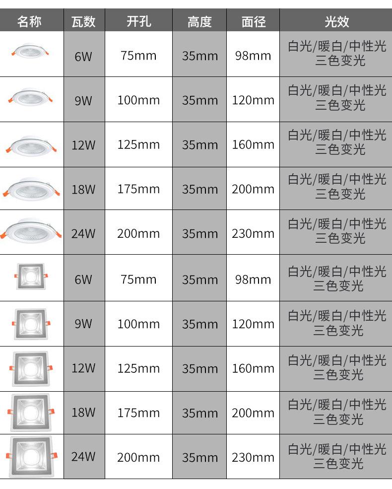 Round 6W surface via 98mm hole 75mm, Round 9W surface via 120mm hole 100mm, Round 12W surface via 160mm hole 1...