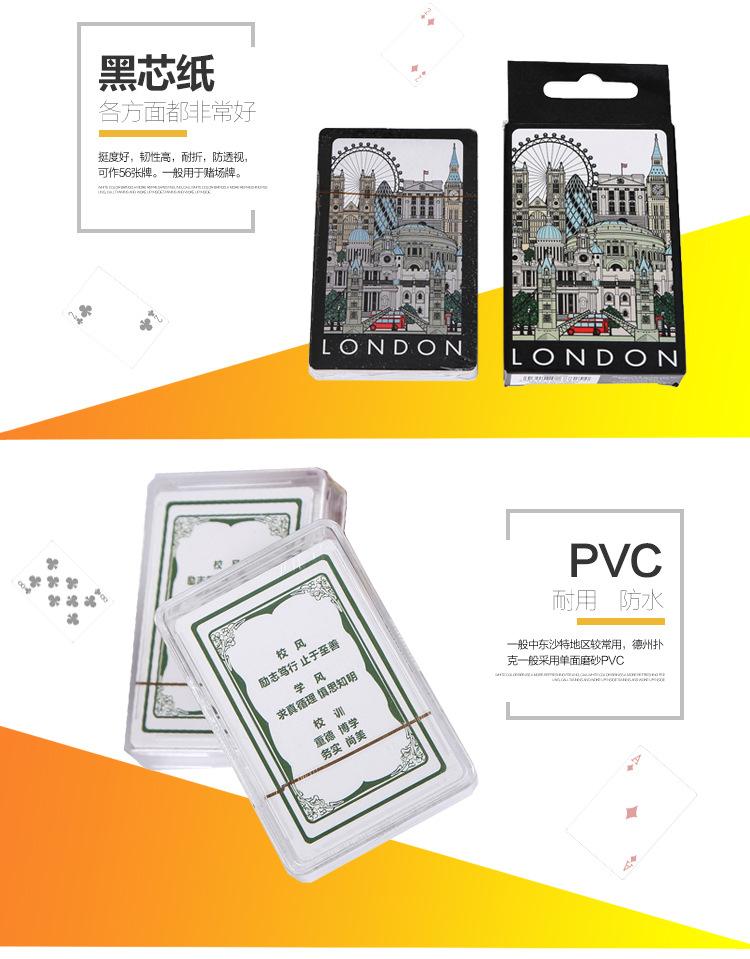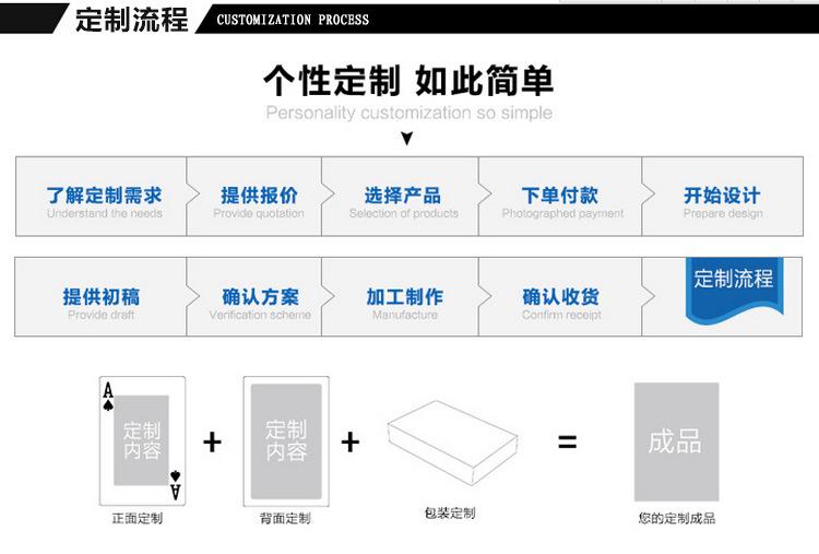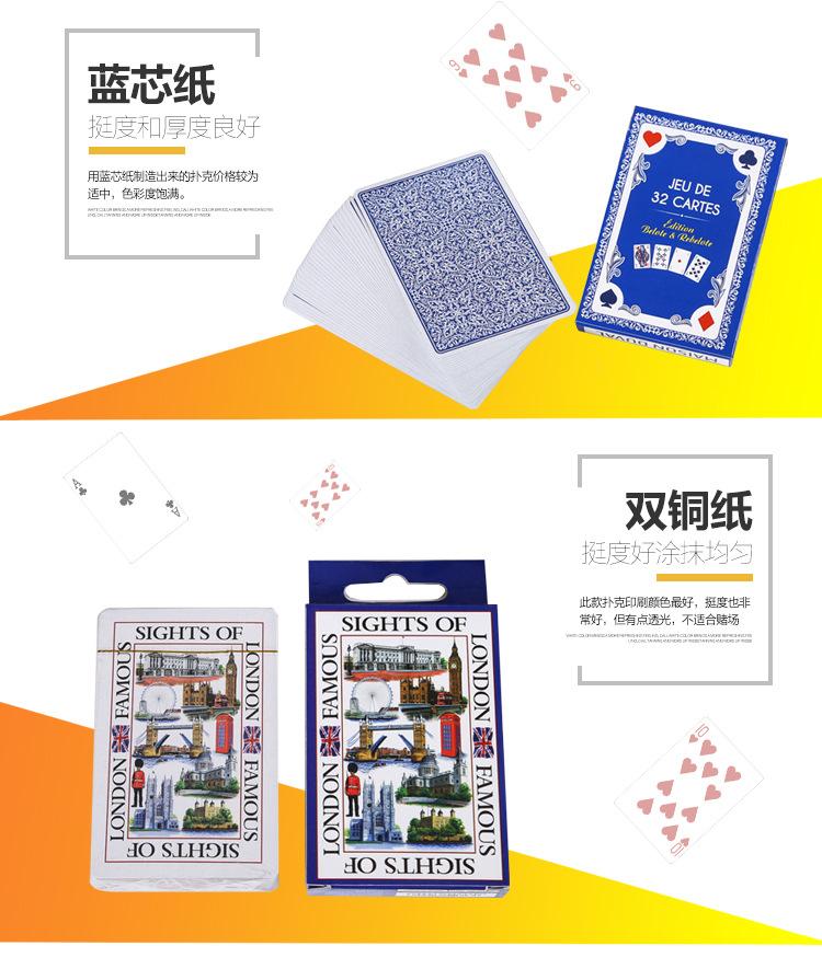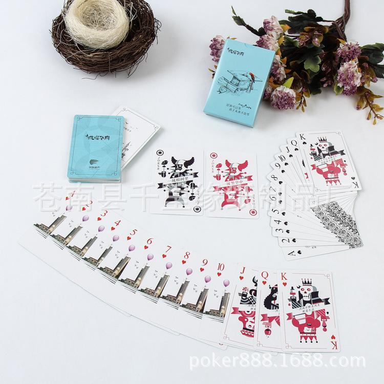 | Una baraja de cartas tiene 54 cartas, 52 de las cuales son cartas regulares y las otras 2 son cartas secundarias (rey y comodín). Las 52 cartas regulares se dividen en grupos de 13 cartas, y cada grupo está representado por cuatro palos: picas, corazones, tréboles y diamantes. Cada palo incluye 13 cartas del 1 al 10 (el 1 generalmente se representa con a) y j, q y k. Hay muchas formas de jugar. El póquer es una herramienta de papel popular para el entretenimiento y el juego. Debido a sus diferentes métodos de juego, comúnmente se le llama cartas de papel, wanliu, majiu, etc., con diferentes títulos. Su nombre estándar póquer es la transliteración de poker. |