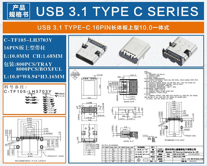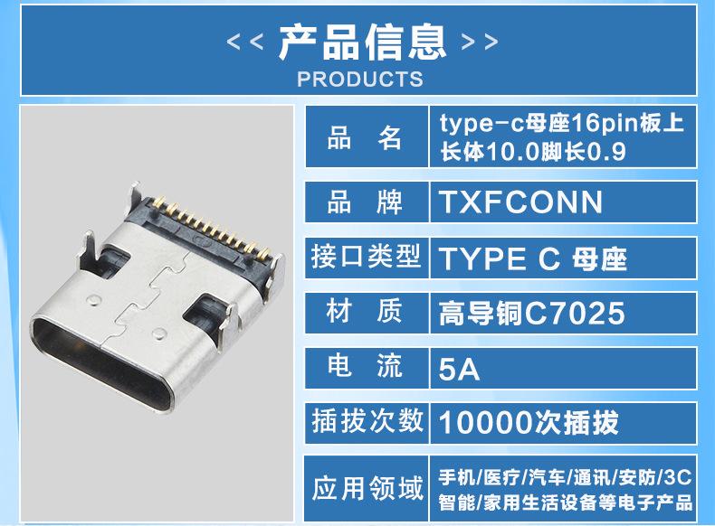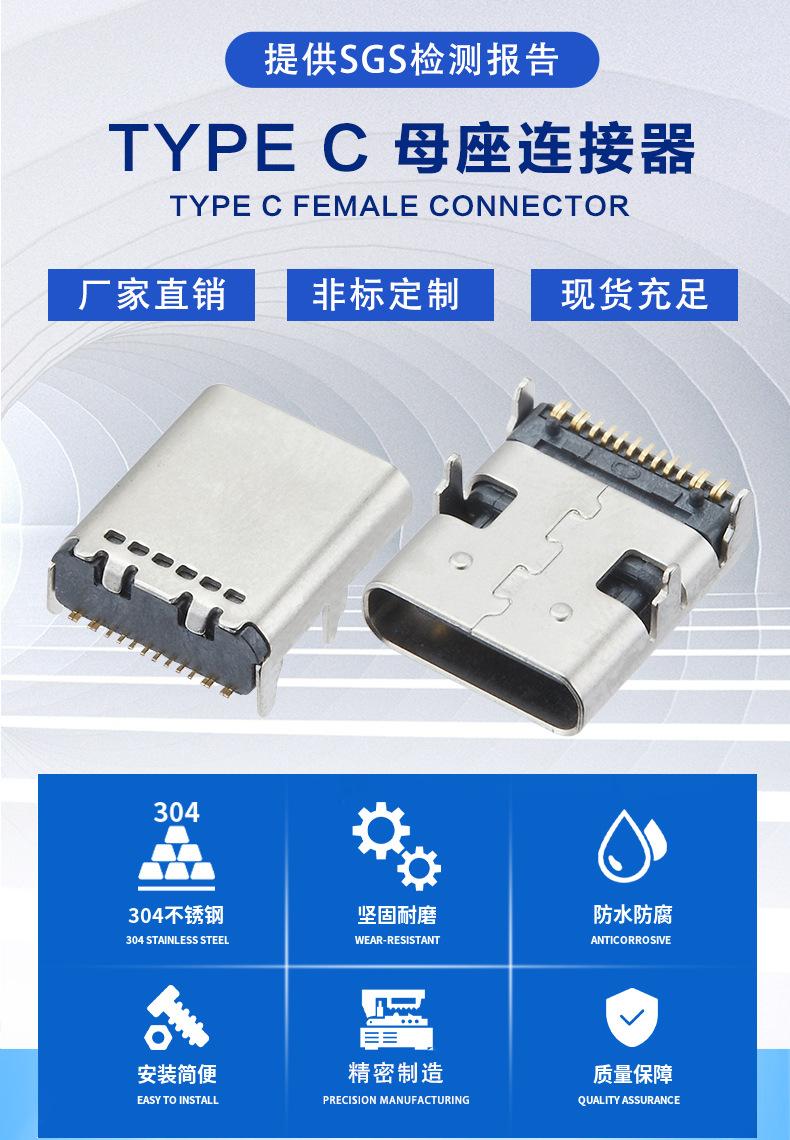 Puerto de transmisión de datos para equipos médicos, conector USB, base hembra tipo C personalizada, cuerpo largo de 16 pines, 10.0 de alta corriente, PD