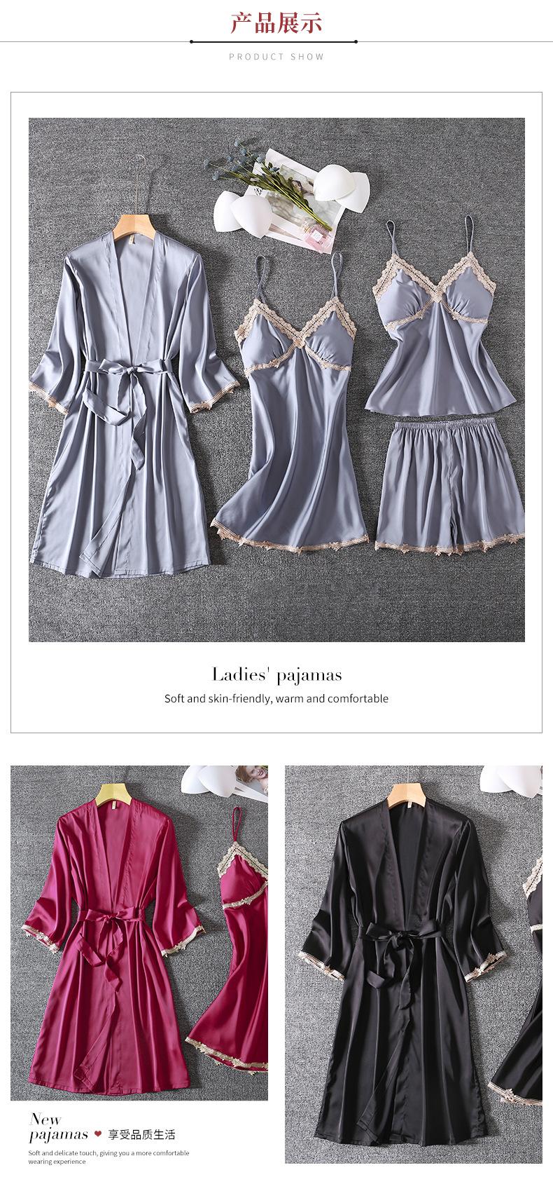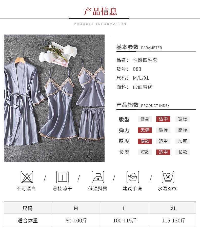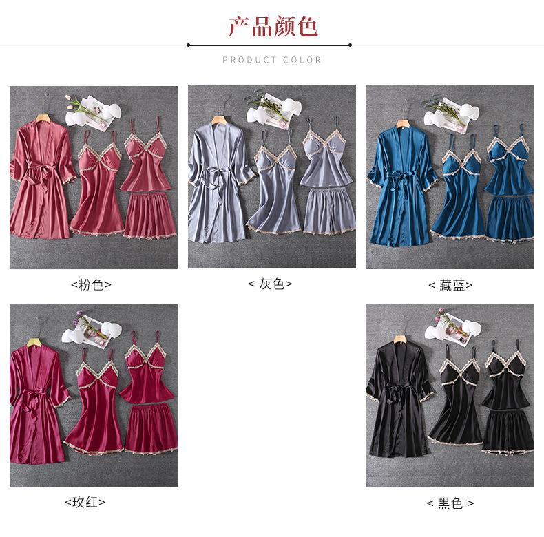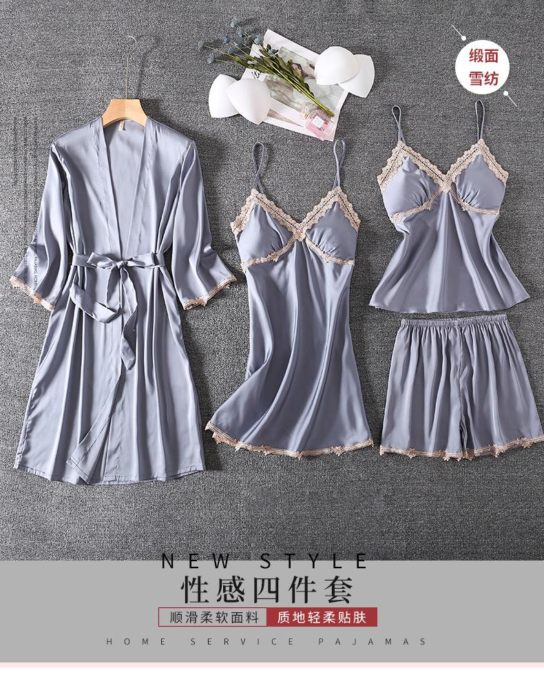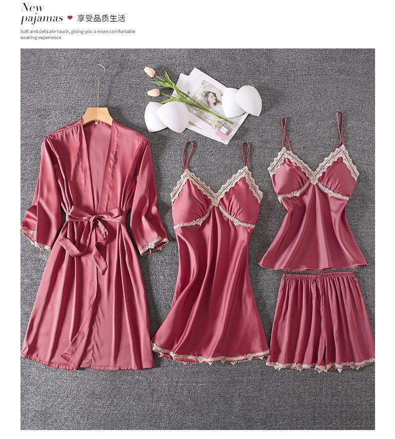 Conjunto de Cuatro Piezas de Camisón de Verano Estilo Coreano Delgado Sexy con Almohadilla en el Pecho, Cuello en V, Mangas Tres Cuartos, Ropa de Salón Cómoda