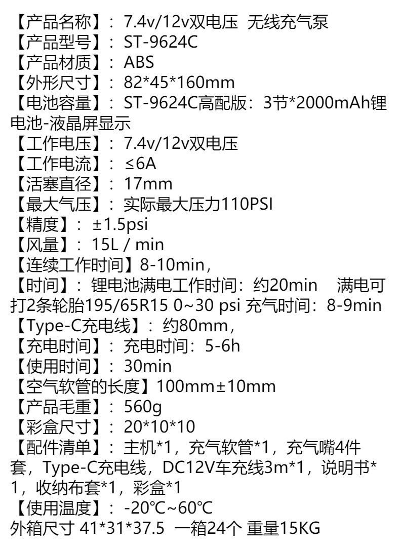 [ST-9624A] Wired air pump, [ST-9624B] wireless air pump + USB, [ST-9624C] wireless air pump + DC + USB
