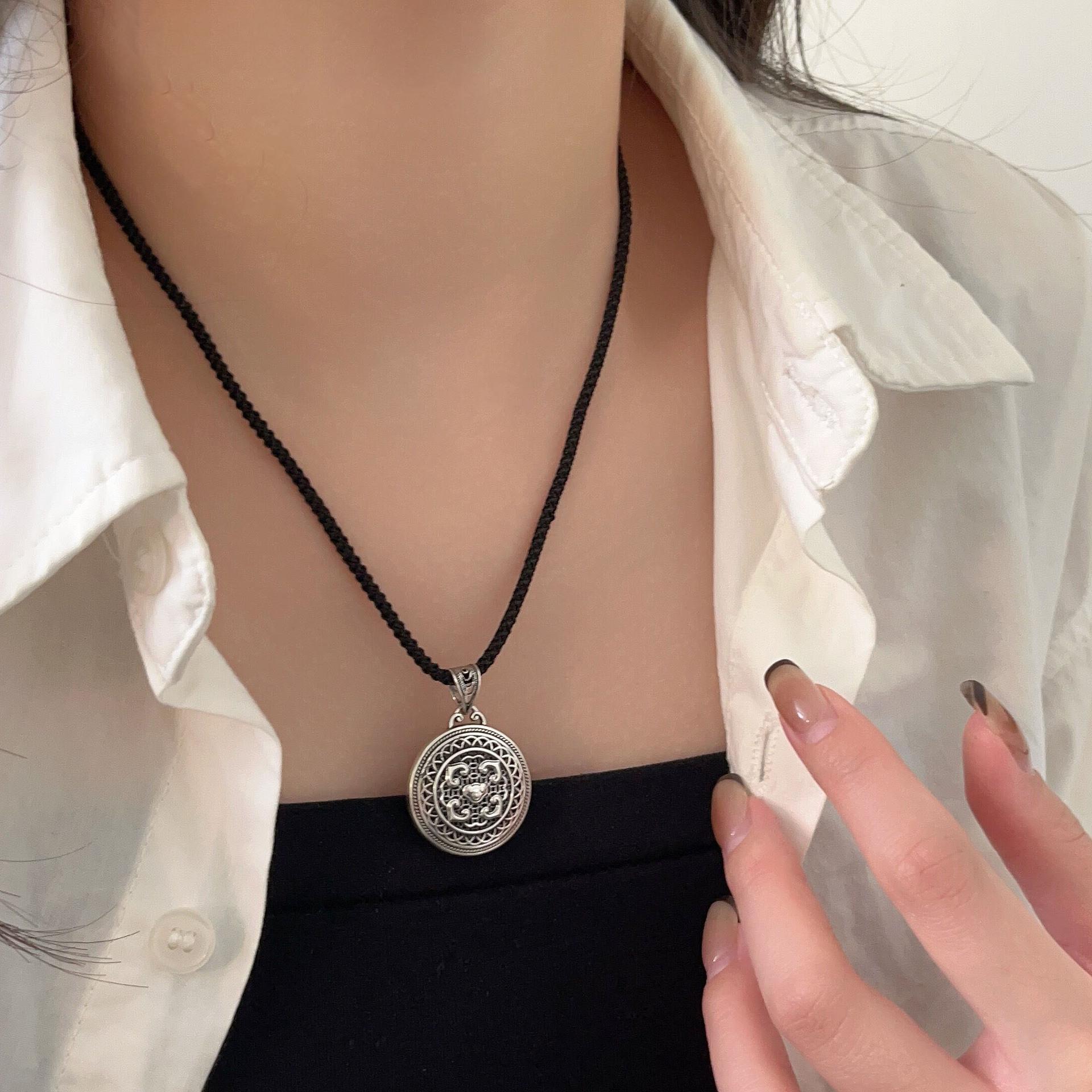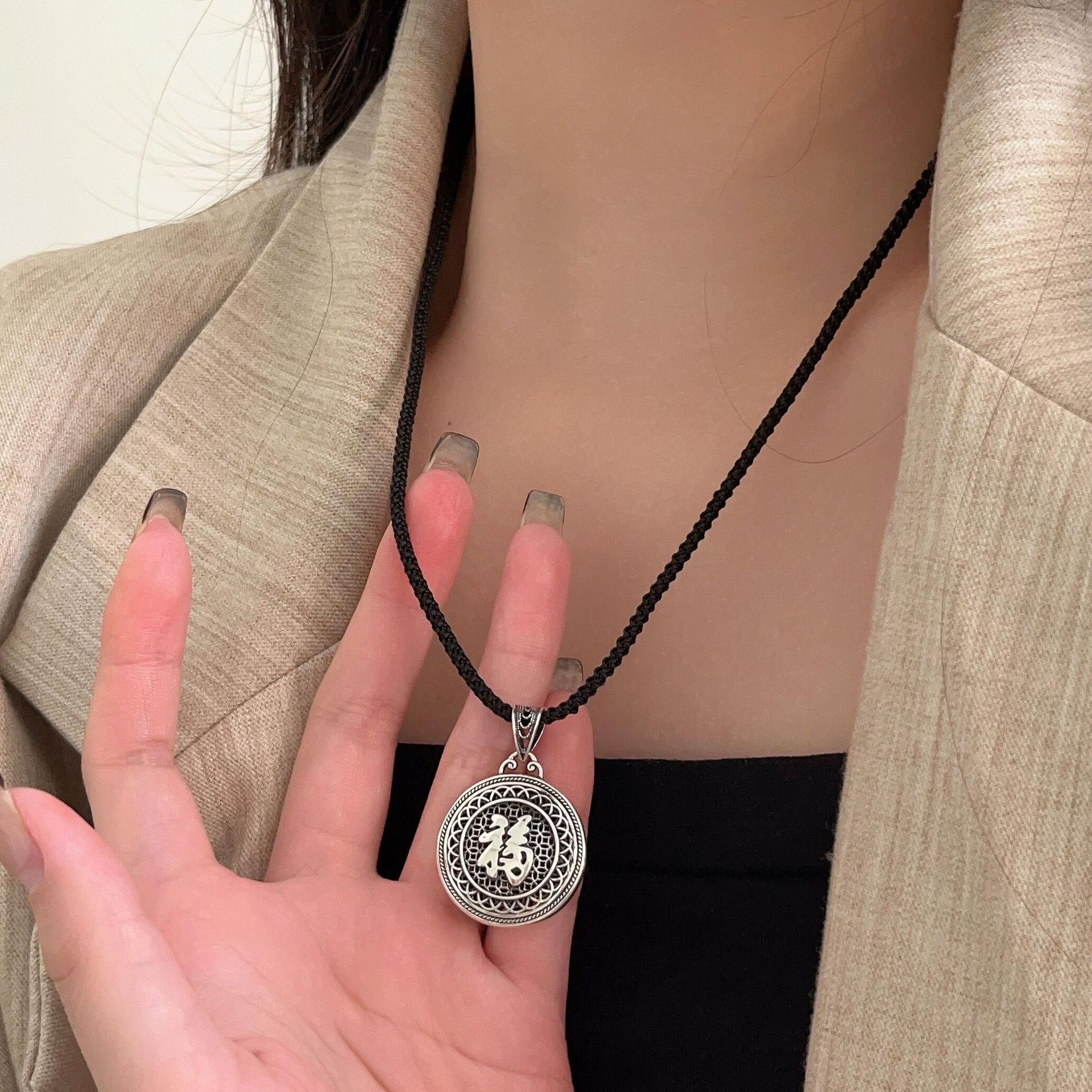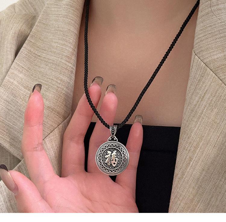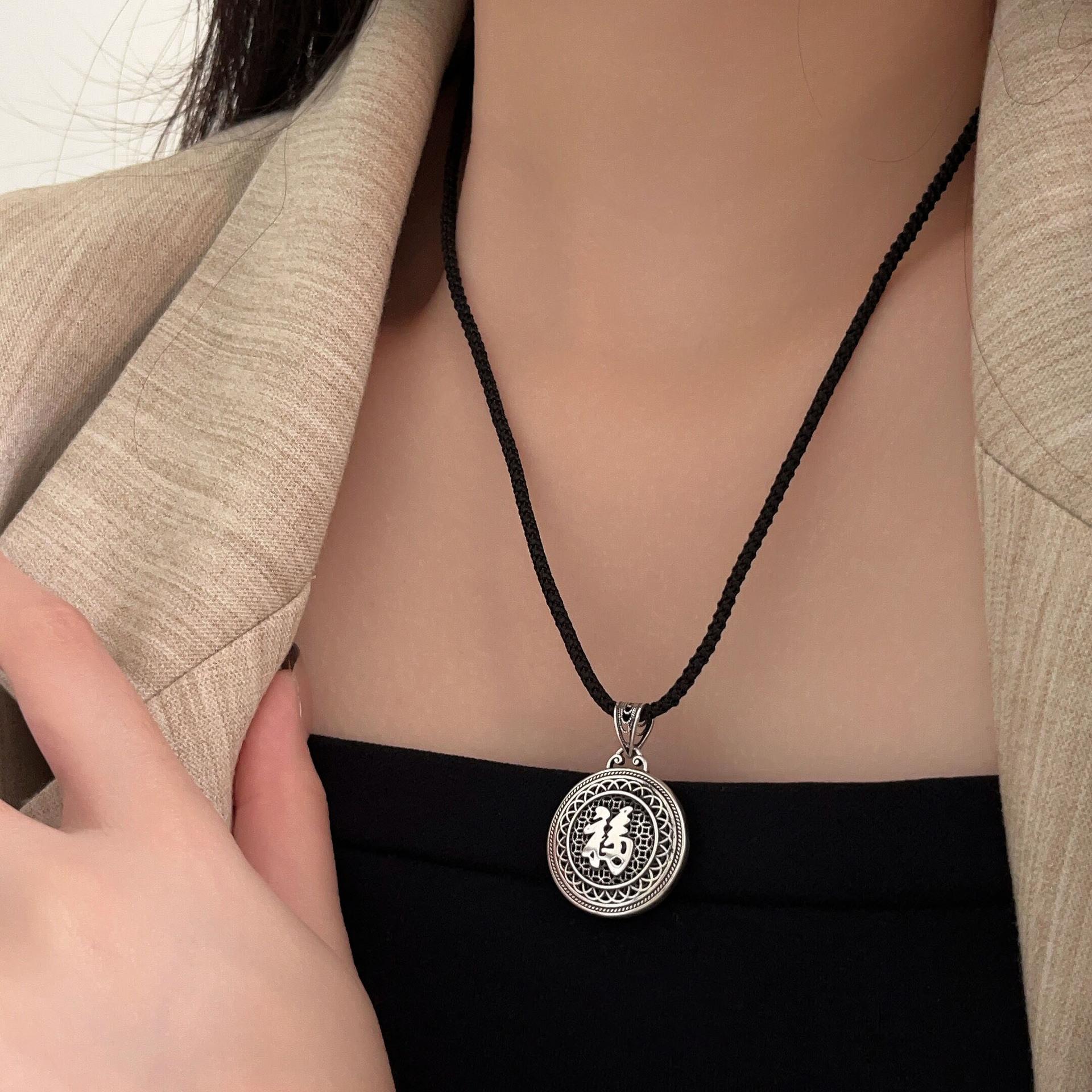 Collar con colgante de plata de ley s925 Ruitai con cuerda negra tejida para hombres y mujeres, estilo chino antiguo, hueco, con carácter fu, cadena de clavícula de estilo nacional.
