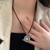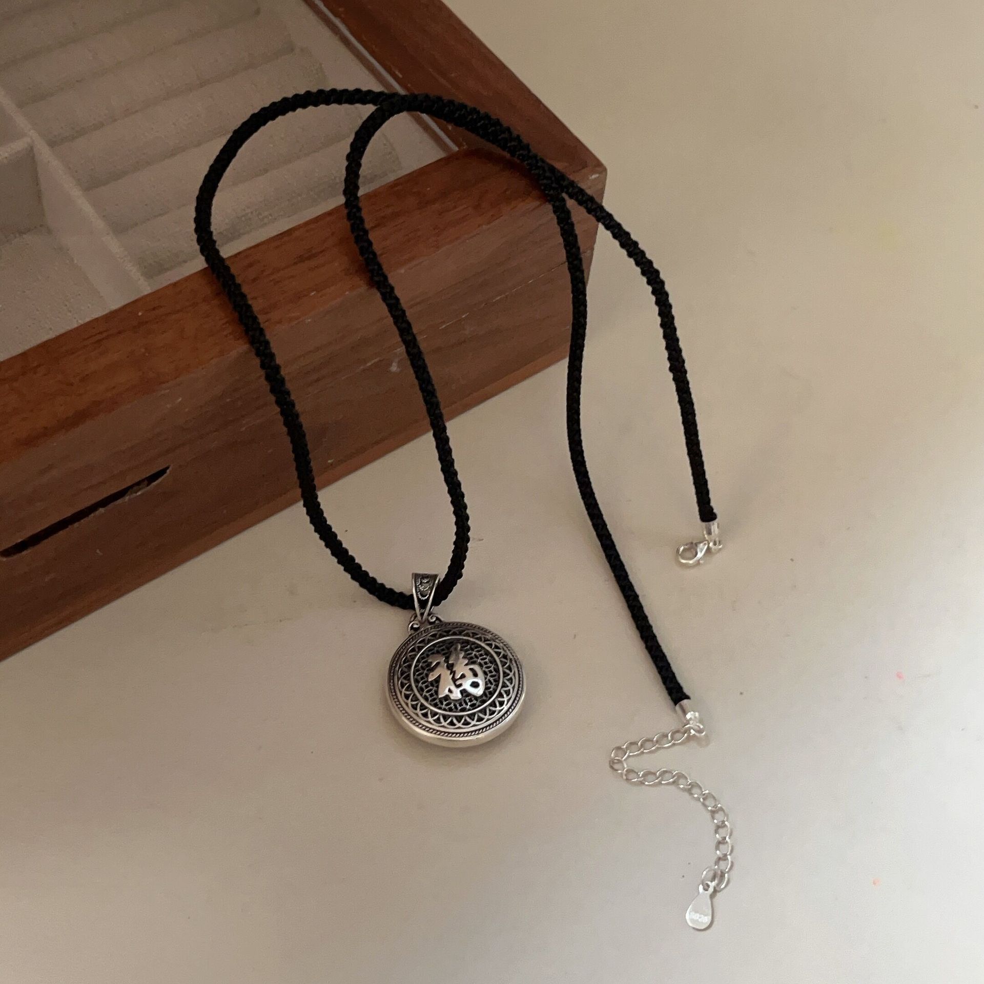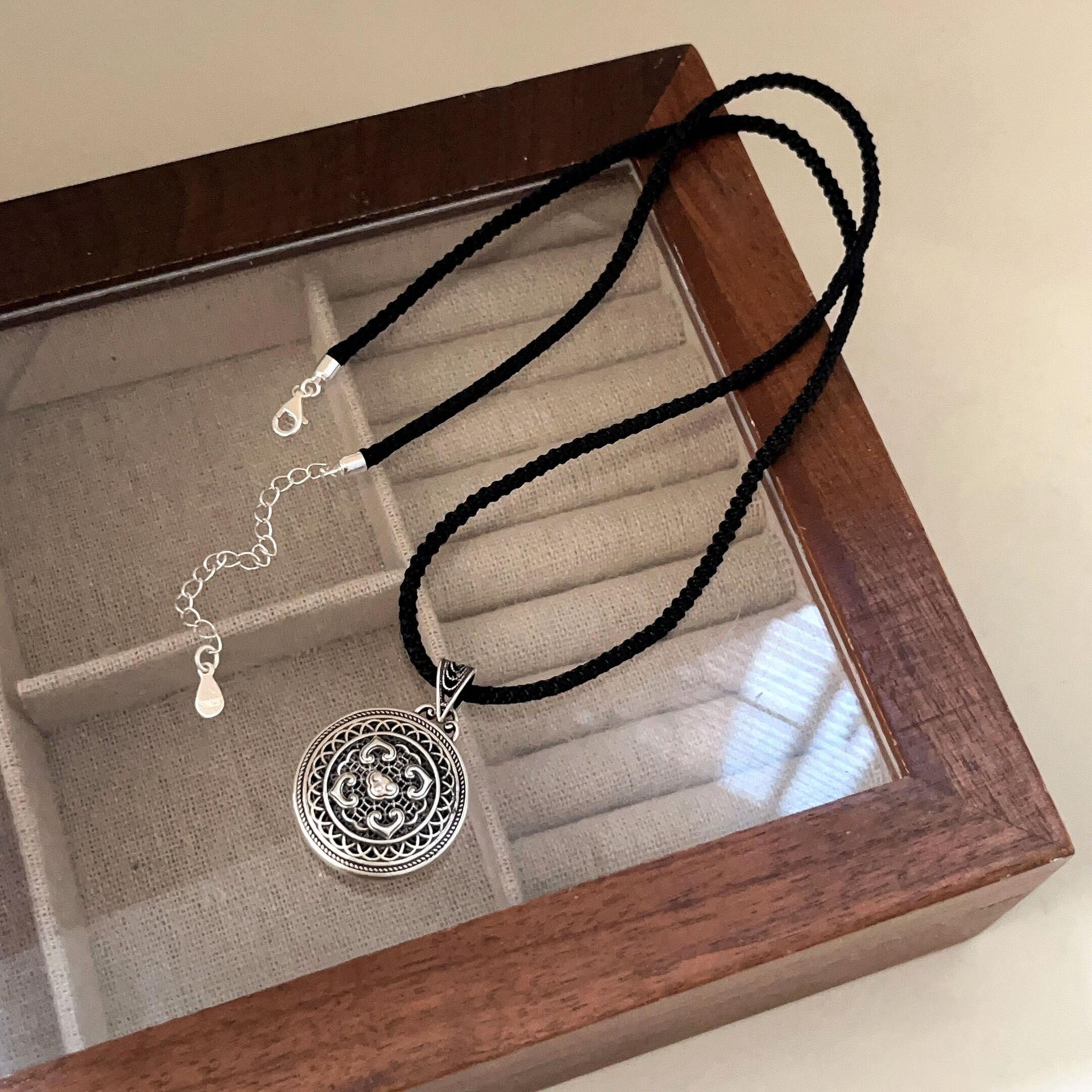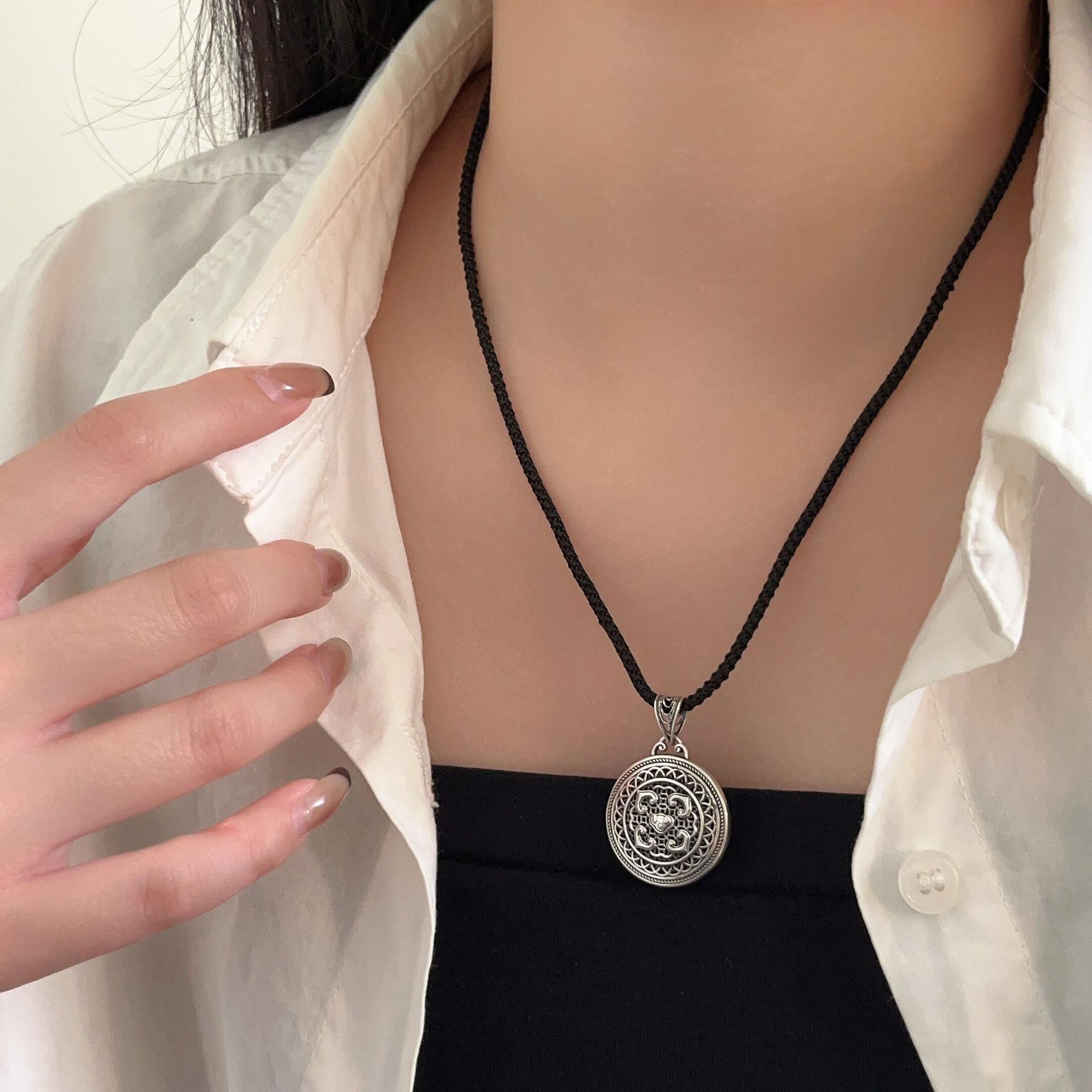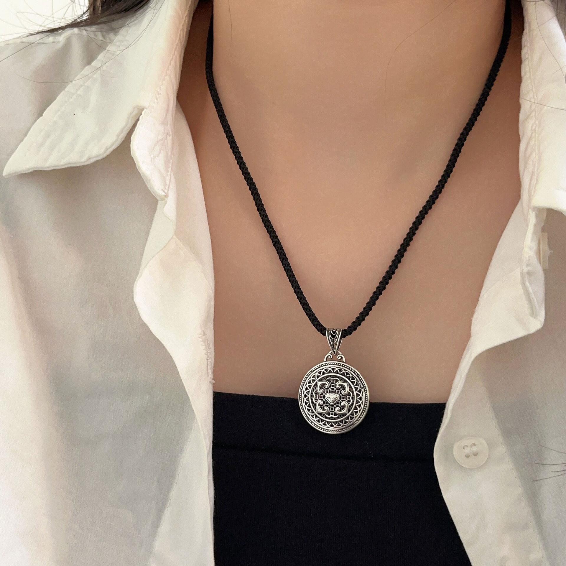 Collar con colgante de plata de ley s925 Ruitai con cuerda negra tejida para hombres y mujeres, estilo chino antiguo, hueco, con carácter fu, cadena de clavícula de estilo nacional.