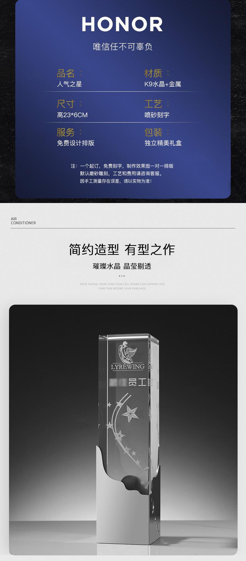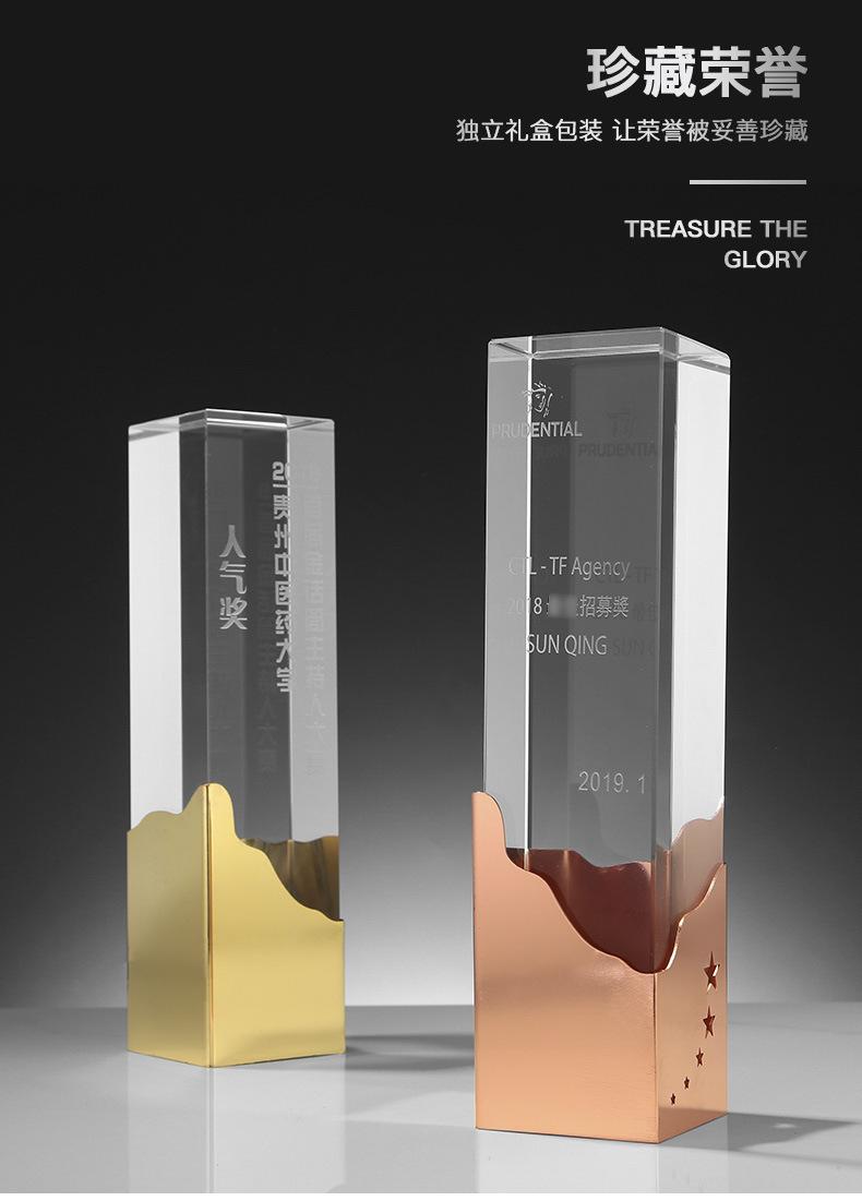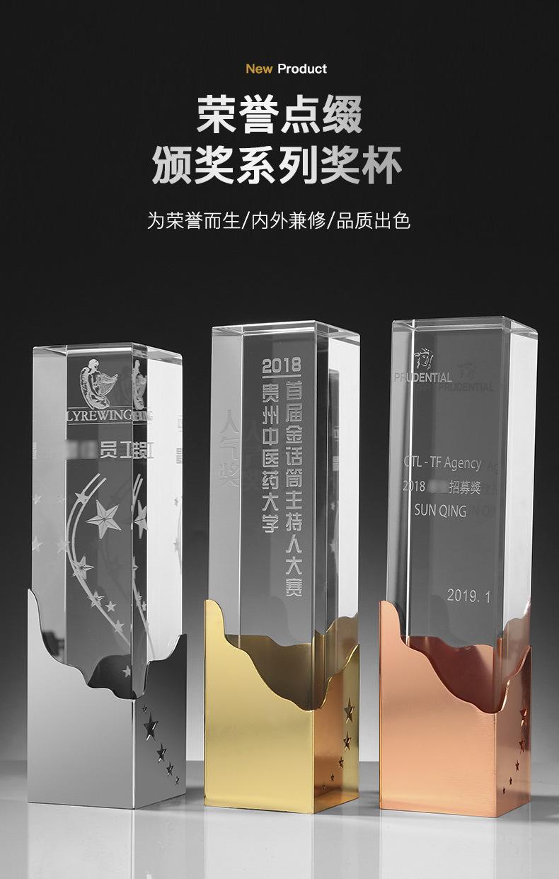 1) El material del trofeo de cristal está hecho de láminas de cristal K9 o placas de colores de varios colores estándar nacionales, que se pueden producir completamente de acuerdo con los requisitos del cliente.