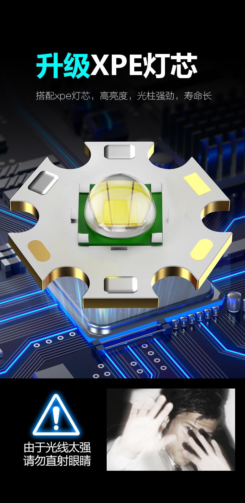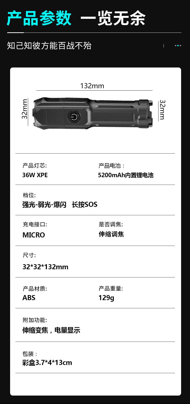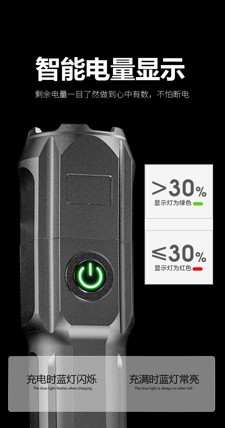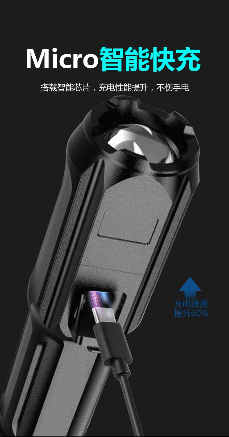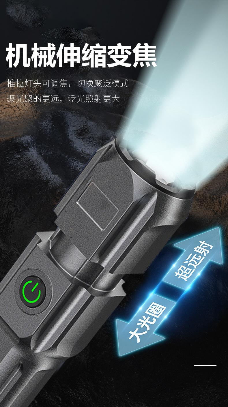 Linterna LED de luz fuerte de largo alcance transfronteriza Carga MICRO zoom telescópico indicador de potencia iluminación exterior luz de trabajo