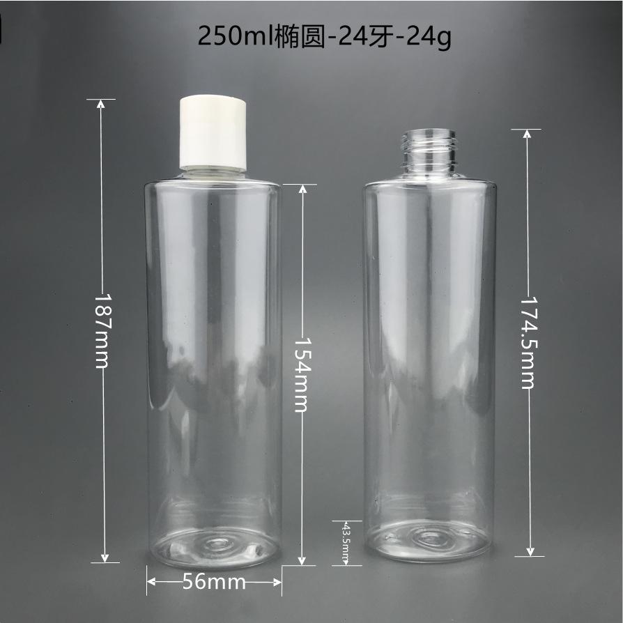 Botella de gel de ducha y champú de 250 ml, venta al por mayor de fábrica, loción transparente, subbotella de plástico PET.