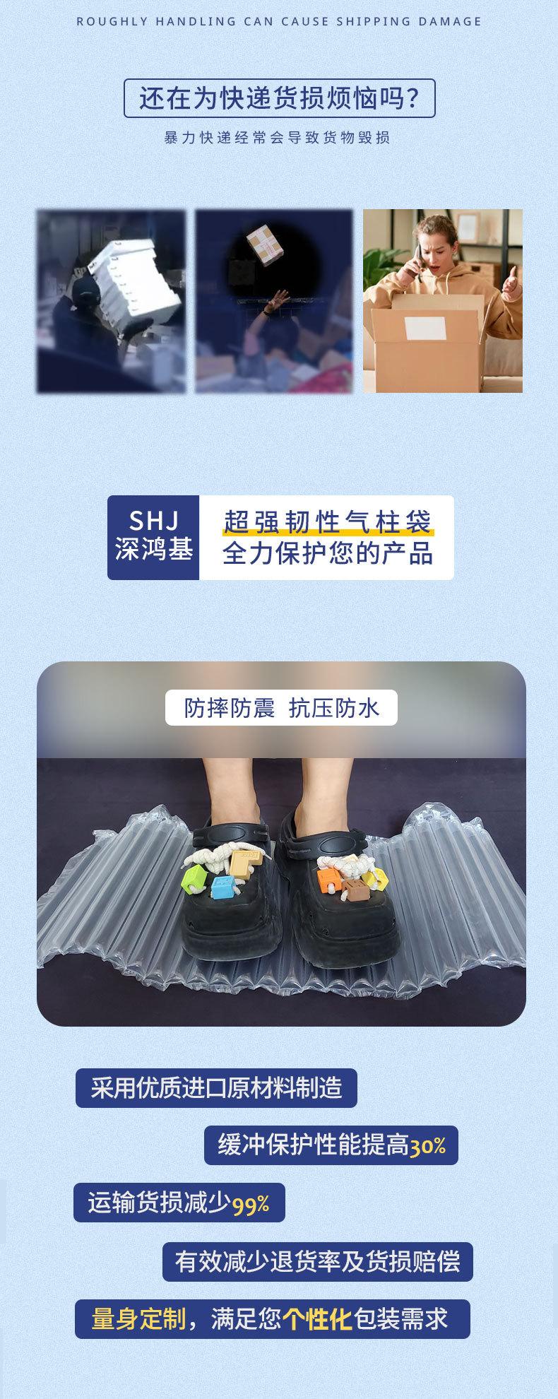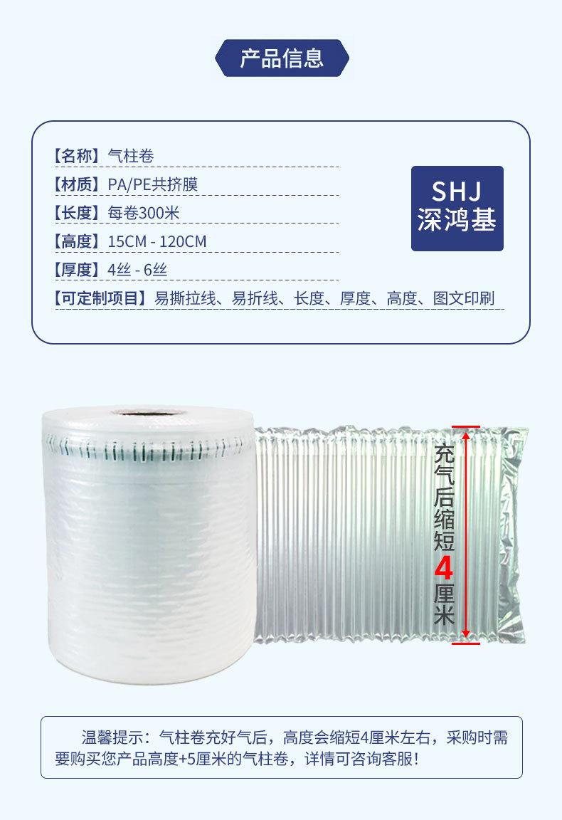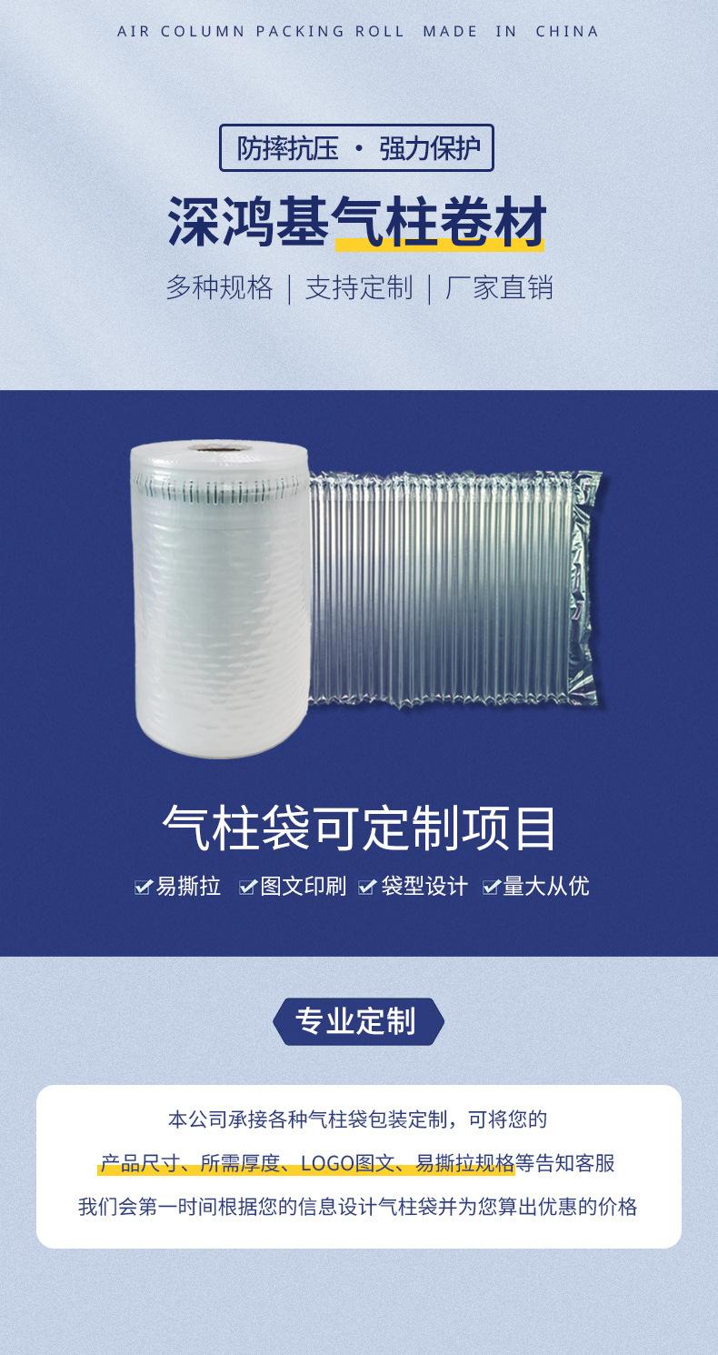 El embalaje en bolsa de columna de aire es adecuado para el embalaje de diversos artículos frágiles y que se rayan fácilmente, como productos de vidrio, productos de cerámica, productos de madera, productos electrónicos, como: jade, joyas, vino tinto, cosméticos, marcos de fotos, artesanías, leche en polvo, teléfonos móviles, computadoras, etc.