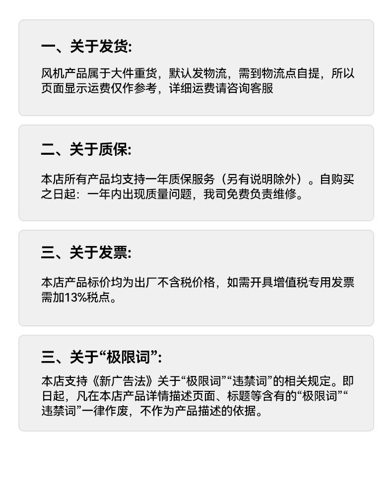 Acerca del flete: Debido al alto peso y volumen del ventilador, el sistema no puede calcular el flete con precisión. El flete está incluido en Jiangsu, Zhejiang, Shanghái y otras ciudades, y la logística también en otras zonas. Por lo tanto, el flete que se muestra en esta página es solo una referencia. Para obtener información detallada sobre el flete, contacte con el servicio de atención al cliente.