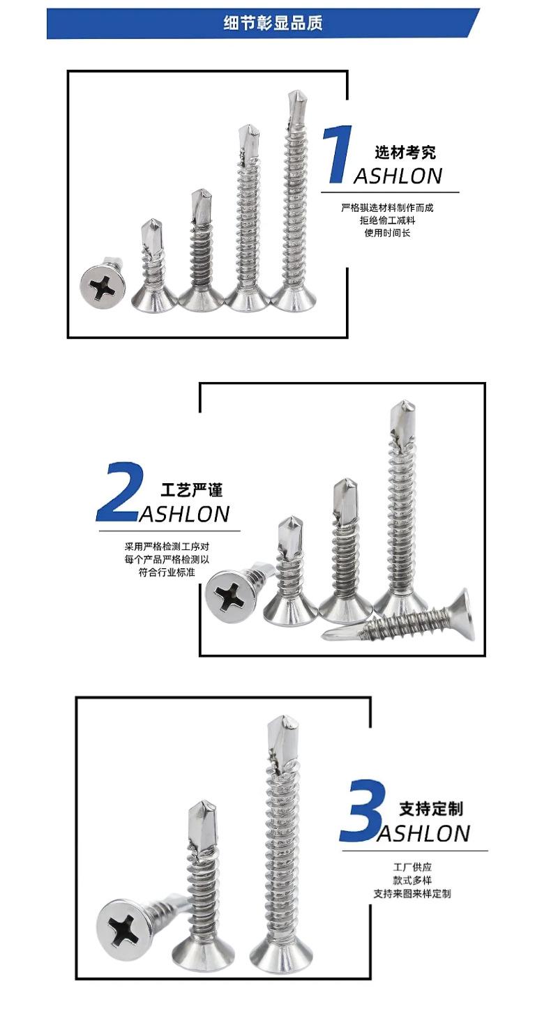 Acero inoxidable cabeza avellanada cola de taladro 410 Cruz cabeza plana tornillo autorroscante galvanizado clavo autoperforante cola de milano rosca M4.2M4.8