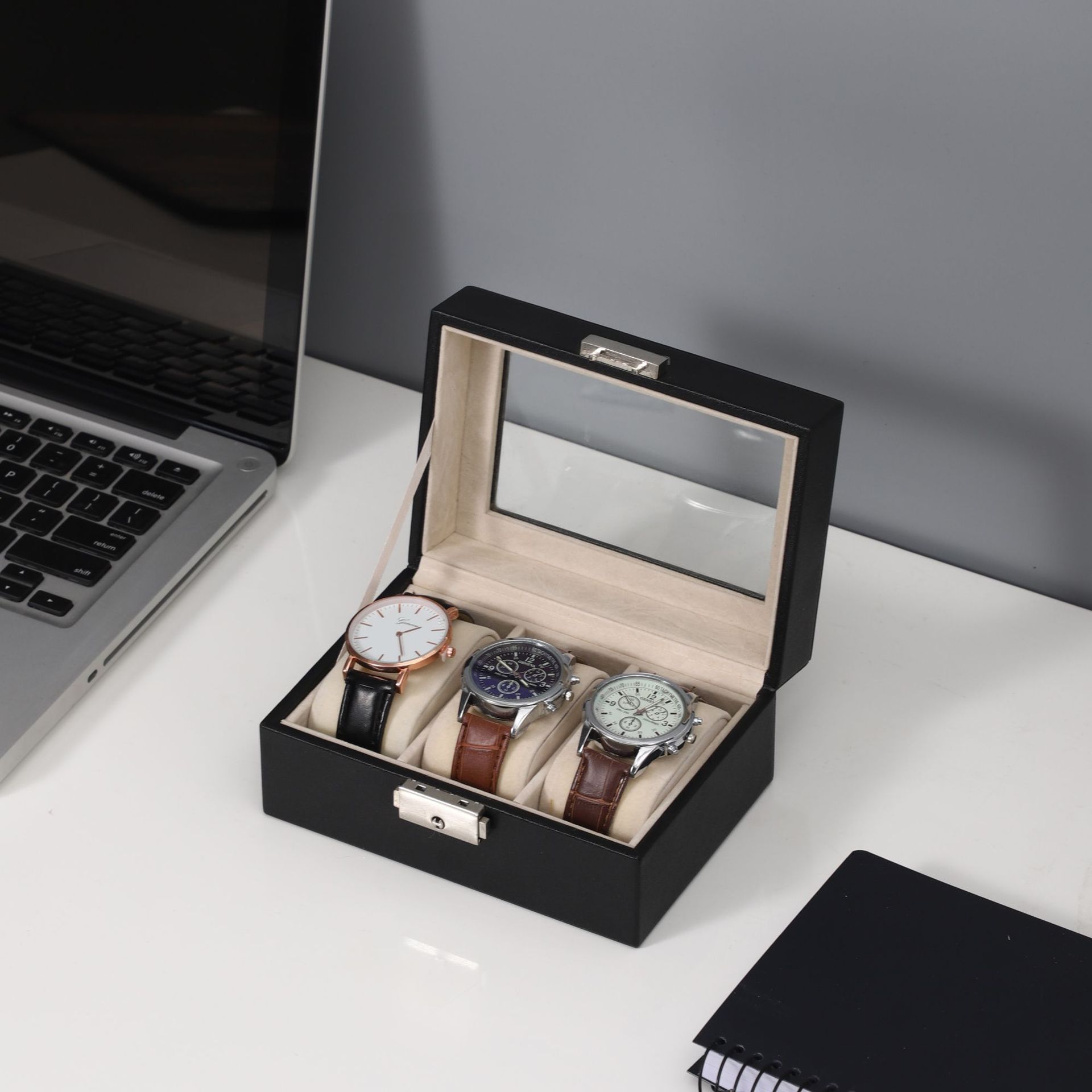 Caja de almacenamiento de joyas para relojes de 3 piezas de cuero PU en stock, caja de almacenamiento con ventana, exhibición de relojes de 3 piezas, exclusiva transfronteriza de moda