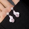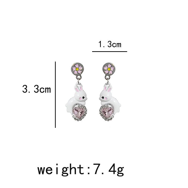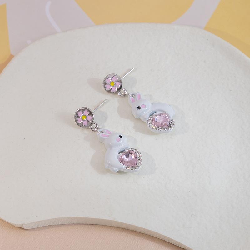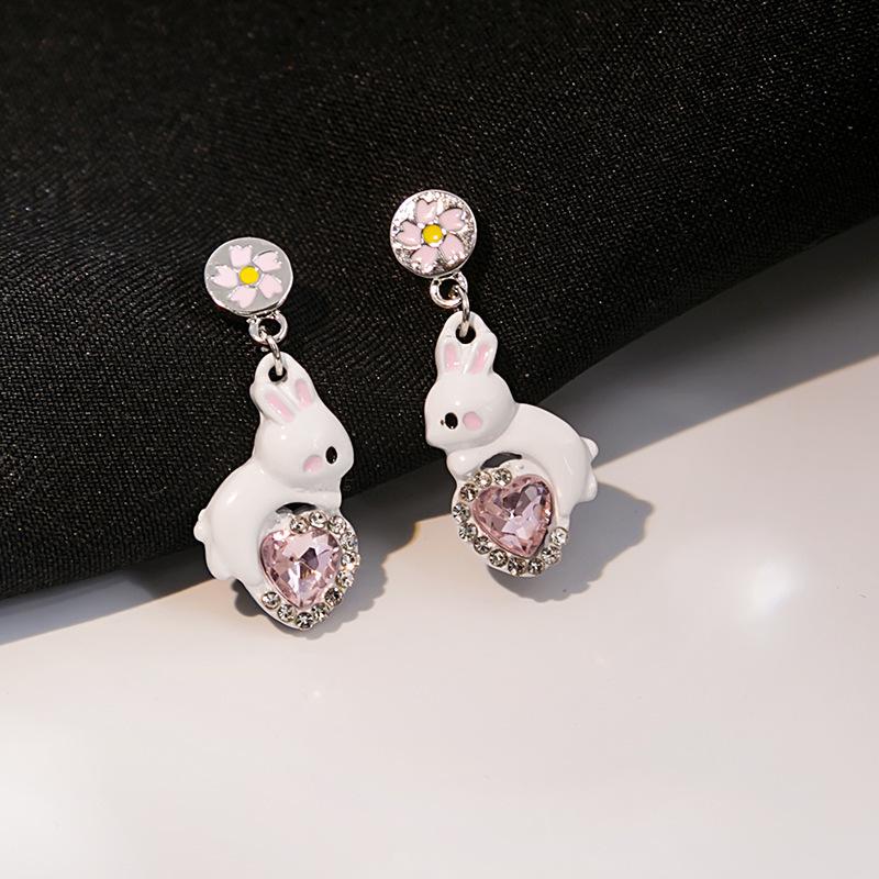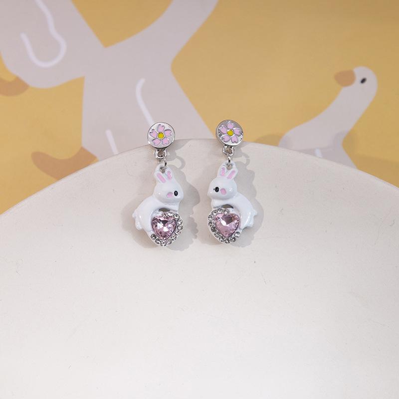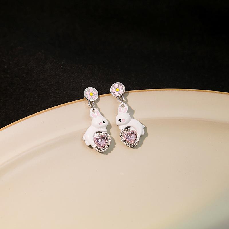 Pendientes de aguja de plata con forma de conejito blanco lechoso, bonitos y bonitos, con flores incrustadas con diamantes, para mujer.