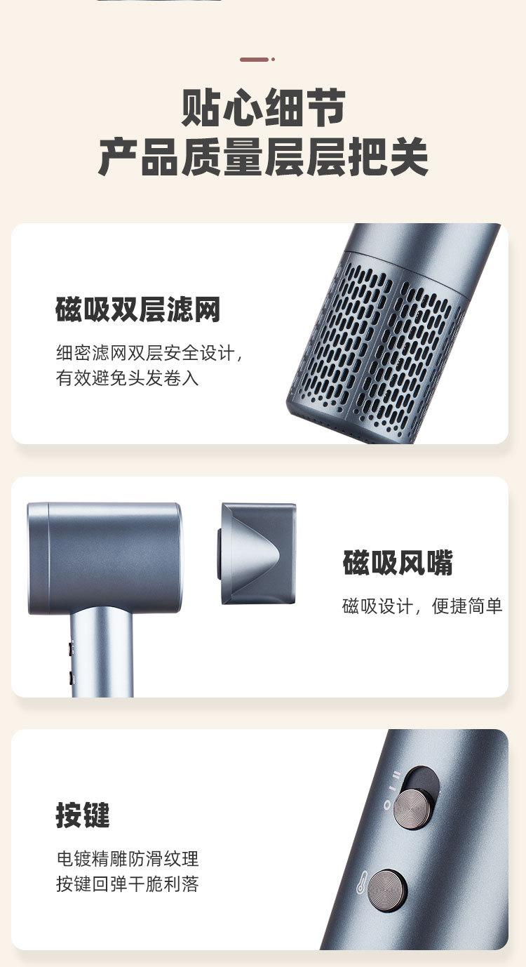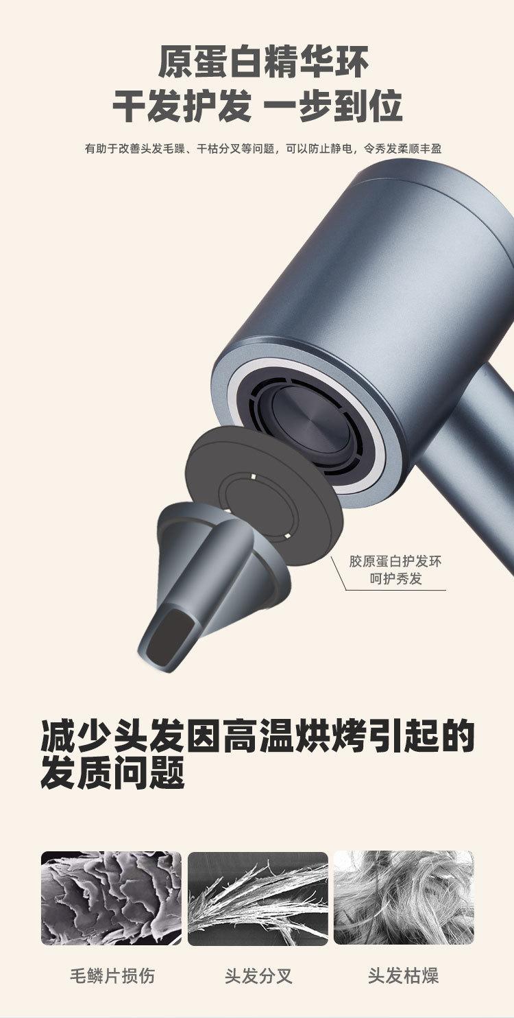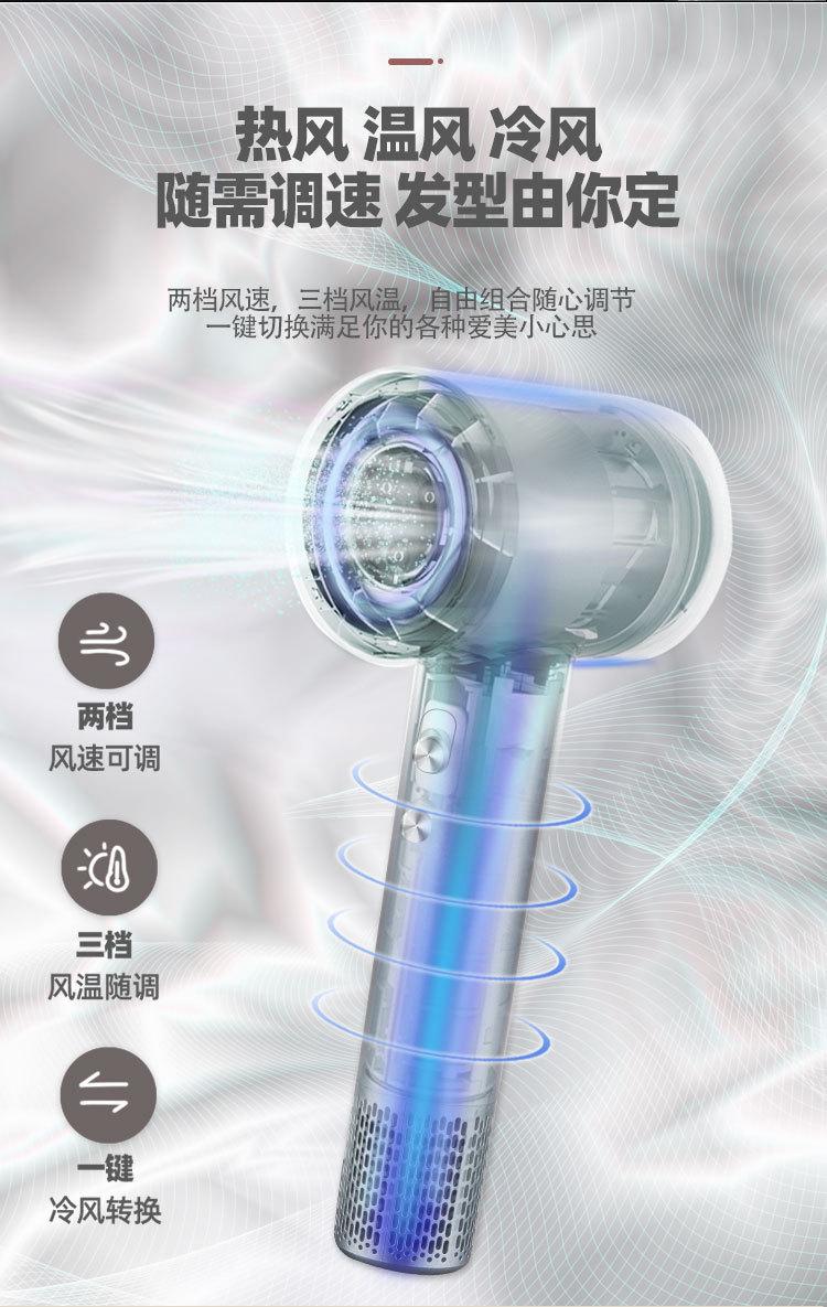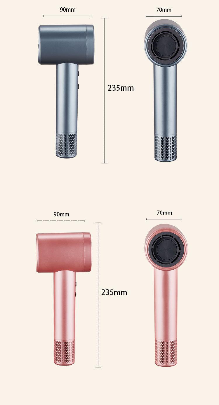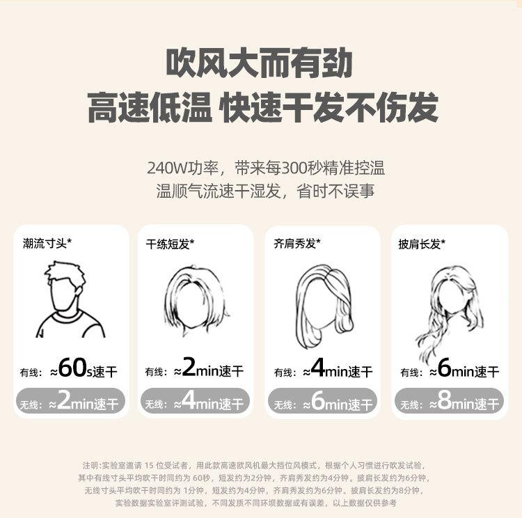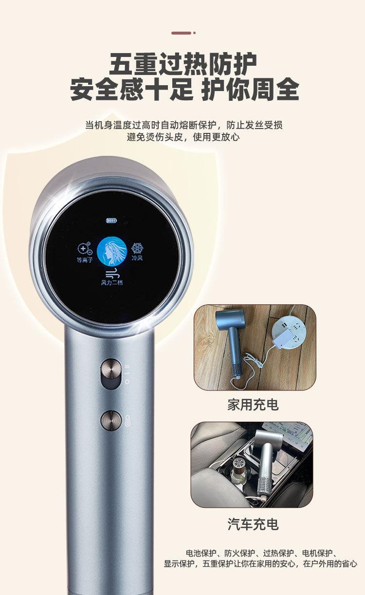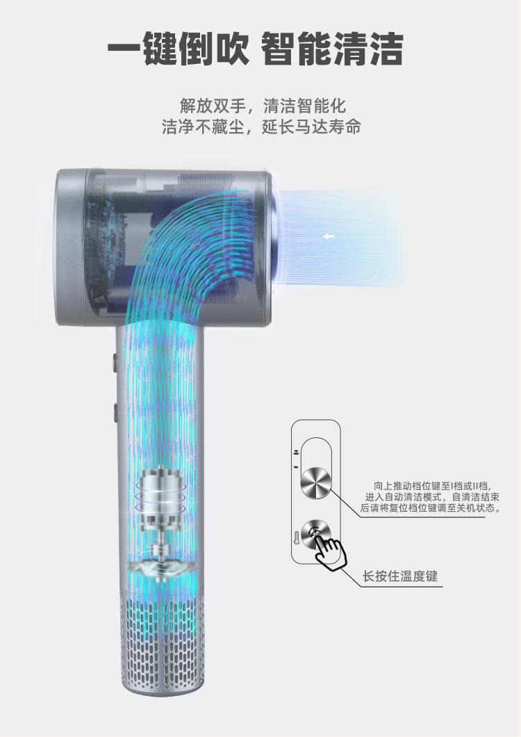 Engranaje de viento frío 1 (viento frío), velocidad 45000 rpm, descarga continua durante aproximadamente 130 minutos; engranaje de viento frío 2 (viento frío), velocidad 95000 rpm, descarga continua durante aproximadamente 80 minutos; 3. Engranaje de viento caliente 1 (viento caliente 50℃), velocidad 45000 rpm, potencia 240w, descarga continua durante aproximadamente 12 minutos; 4. Engranaje de viento caliente 2 (viento cálido 40℃), velocidad 95000 rpm, descarga continua durante aproximadamente 12 minutos