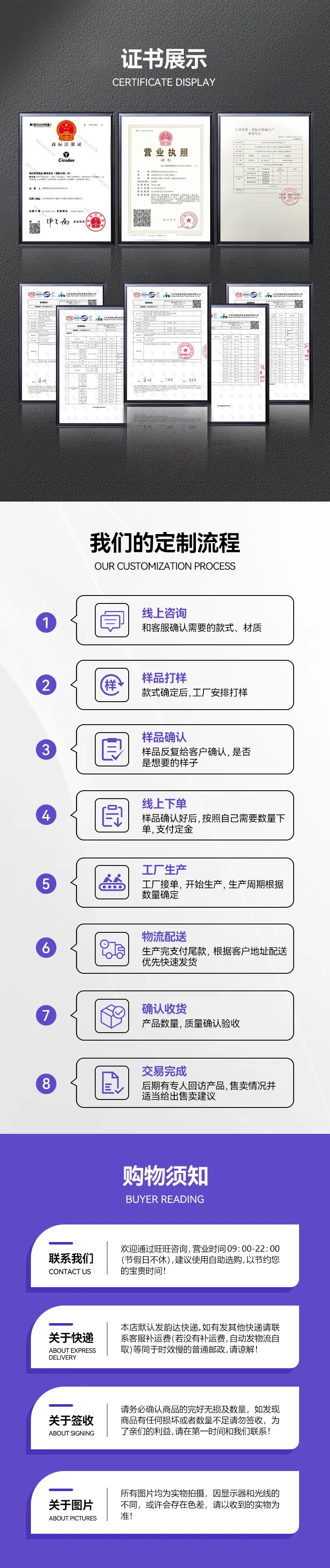 Nuestra empresa ofrece cotizaciones y personalización de muestras para ventas nacionales e internacionales, procesamiento OEM y OEM, y admite lotes mixtos (mayoristas grandes y pequeños) con descuentos por cantidad. ¡Bienvenidos a colaborar con nuevos y antiguos clientes!