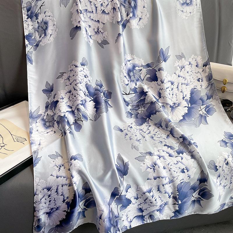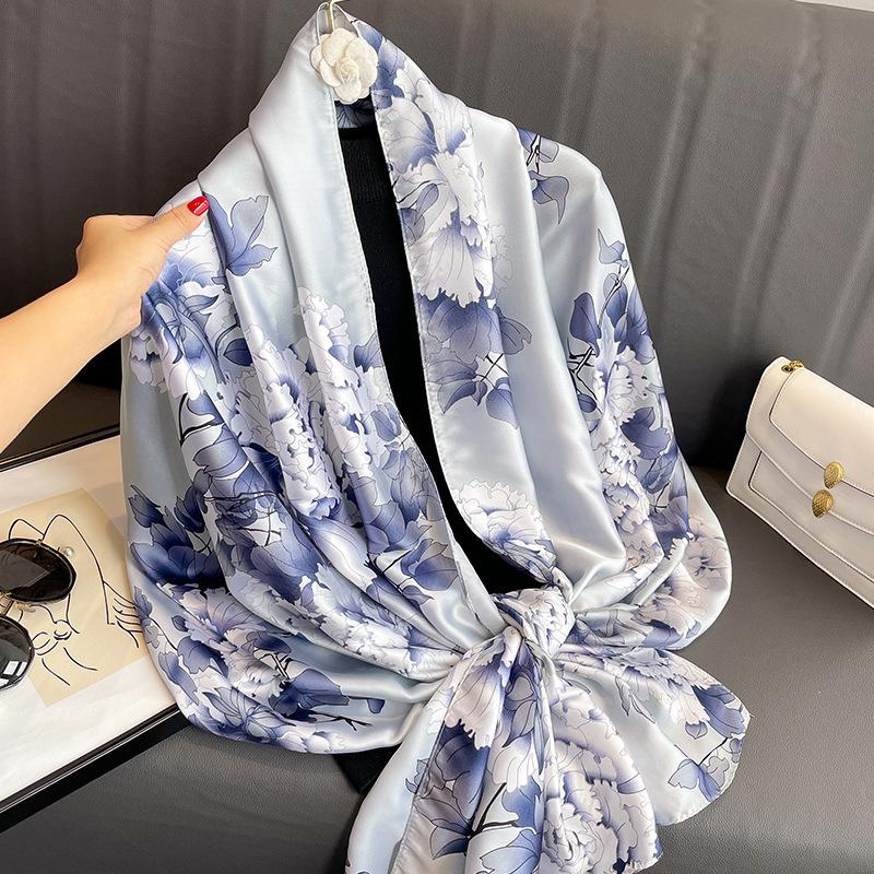 Nueva moda para exteriores bufanda estampada de flores frescas que combina con todo viaje protección solar satén bufanda larga chal para mujer