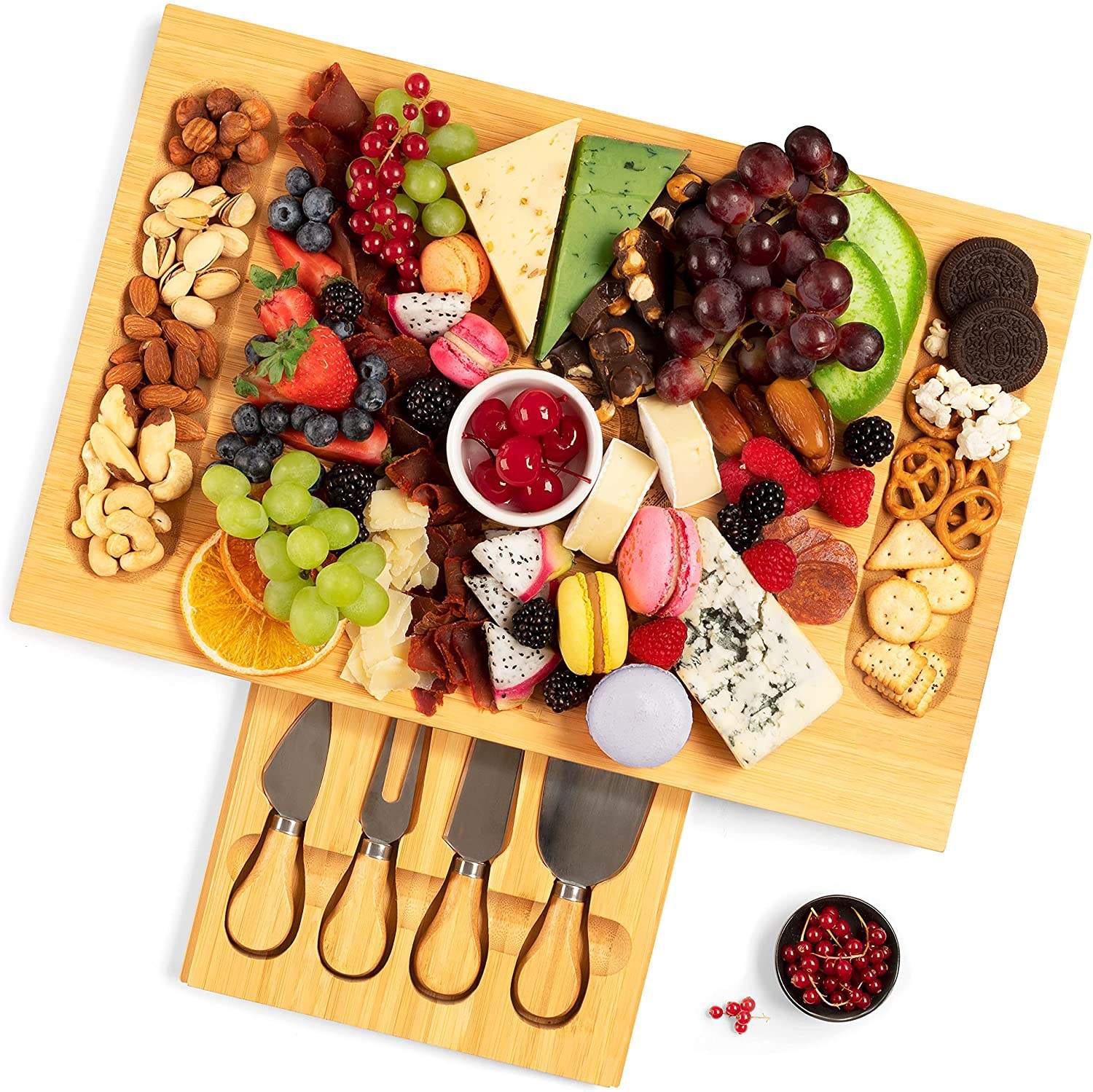 Tabla de quesos de bambú con cajón, juego de cuchillos para queso, color primario, multicolor opcional