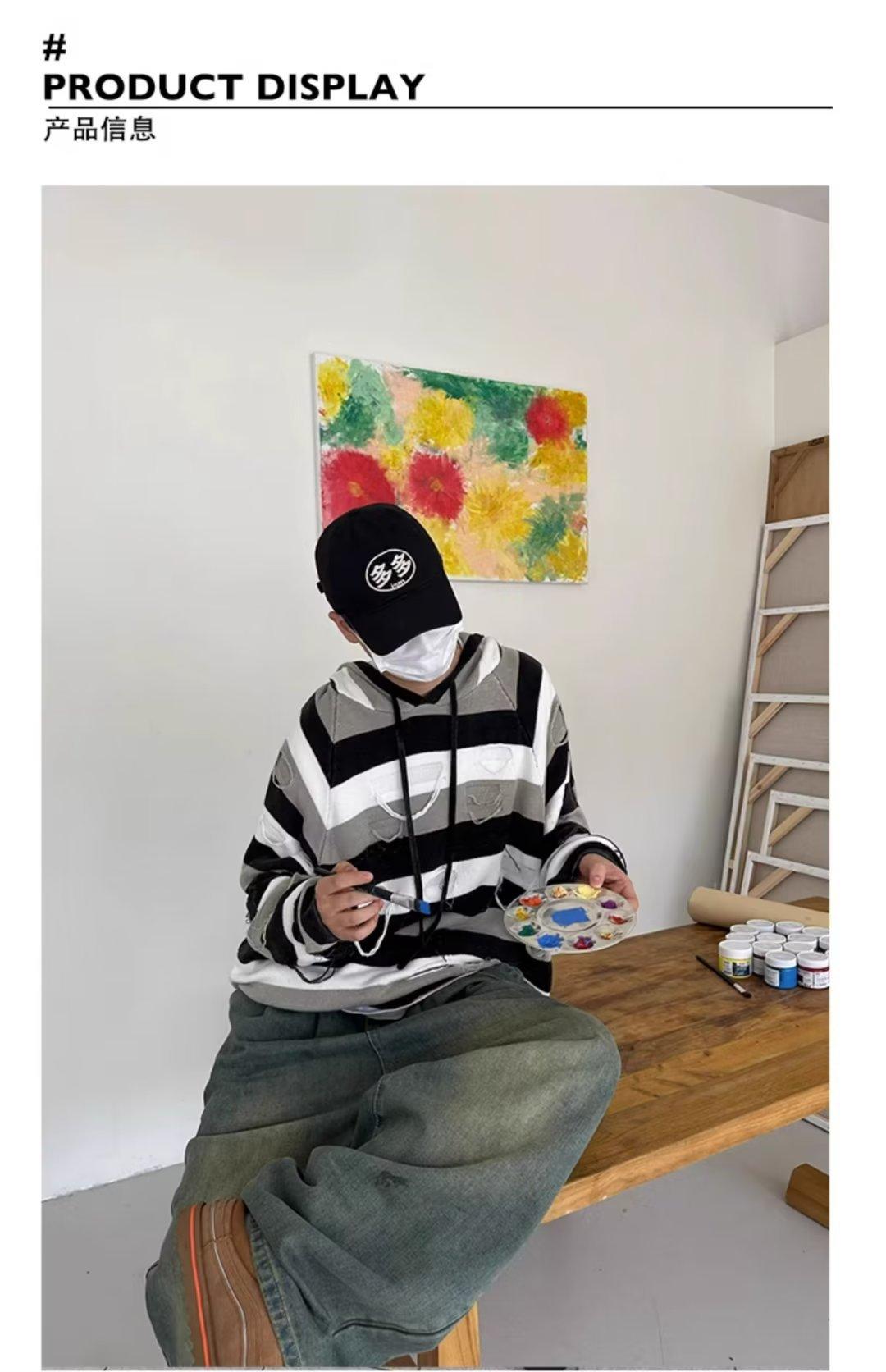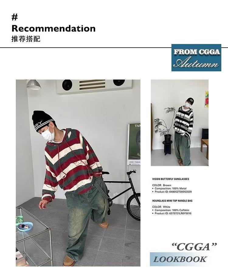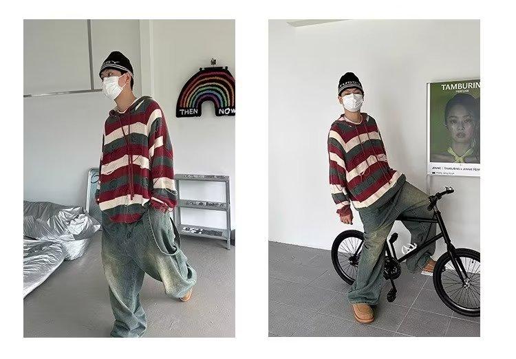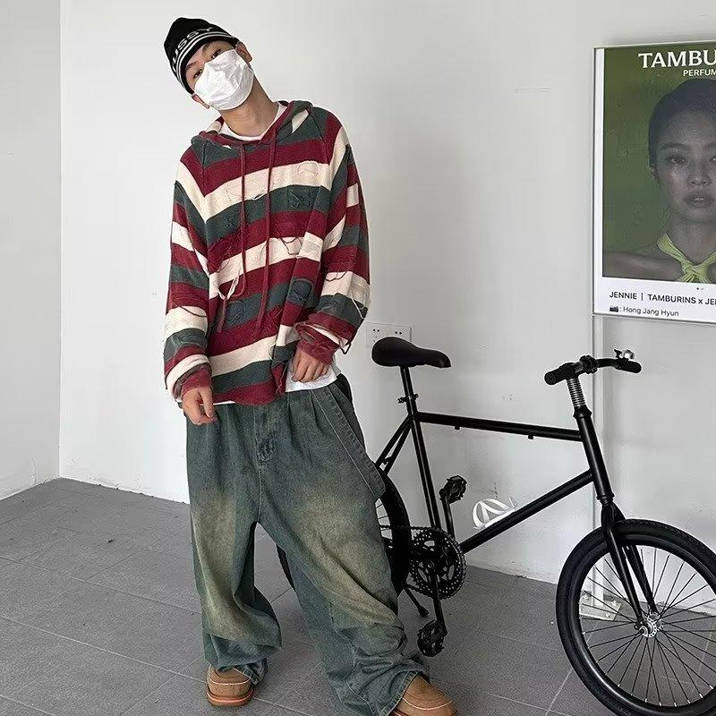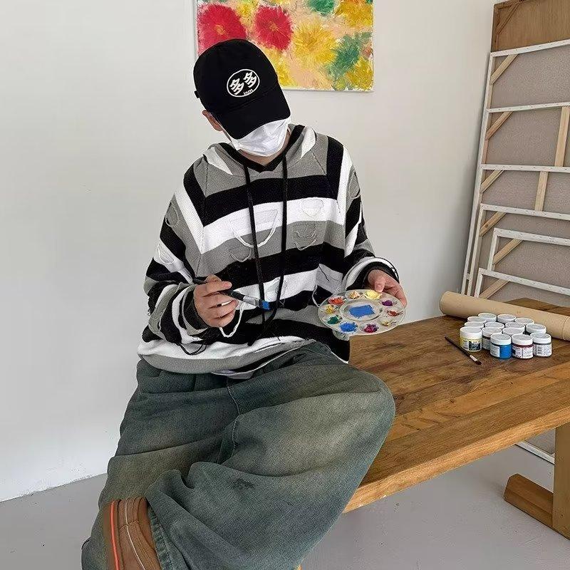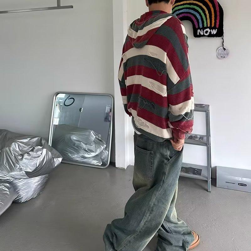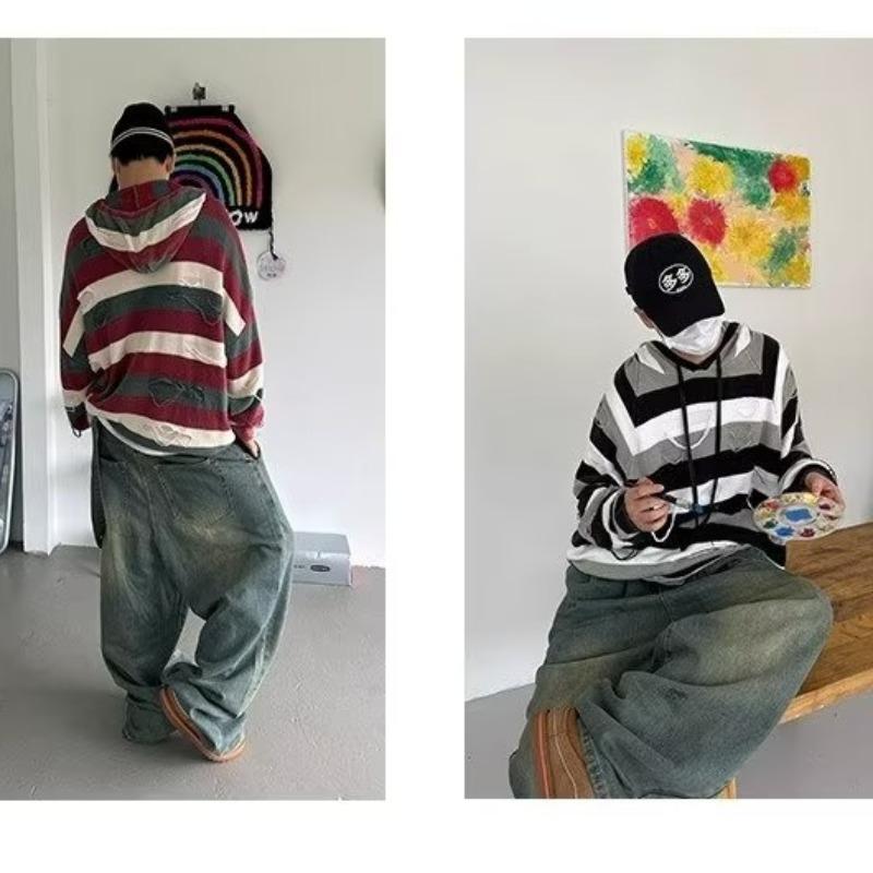 Suéter con capucha para otoño e invierno, suéter de marca de moda estadounidense para hombre, suéter holgado con rayas retro a la moda.