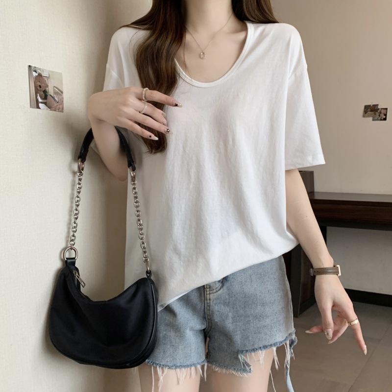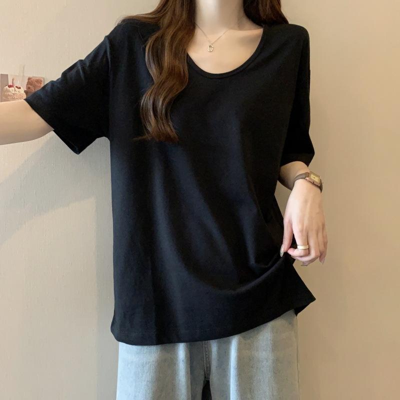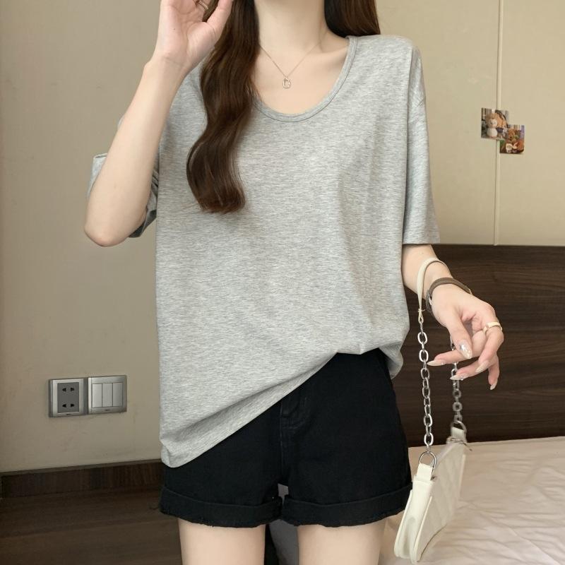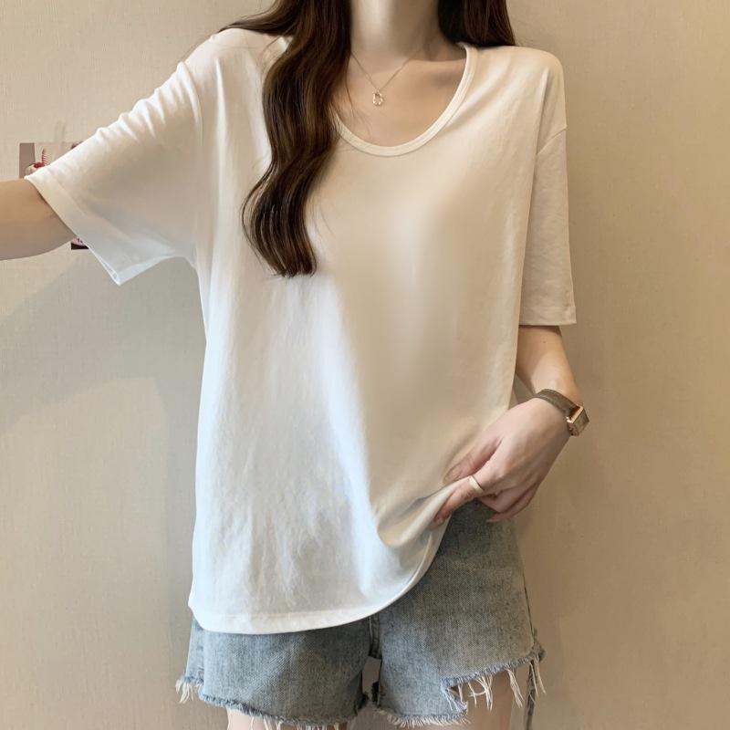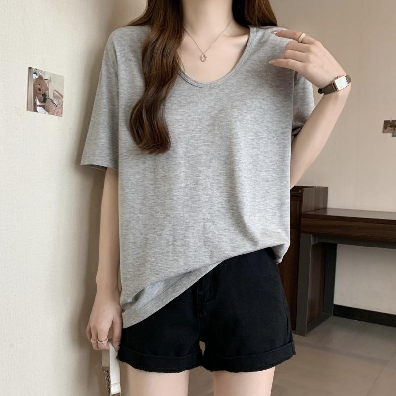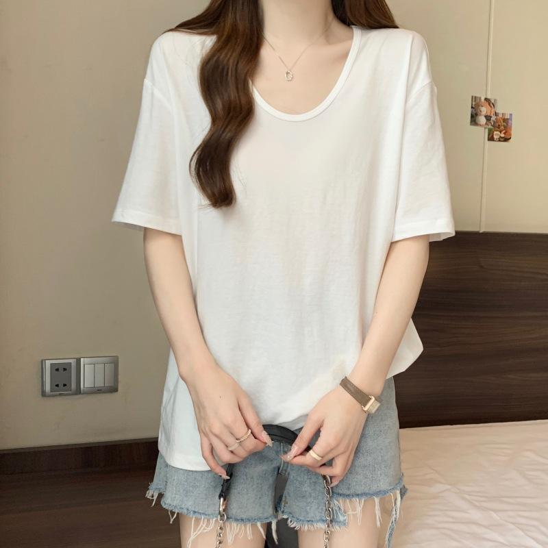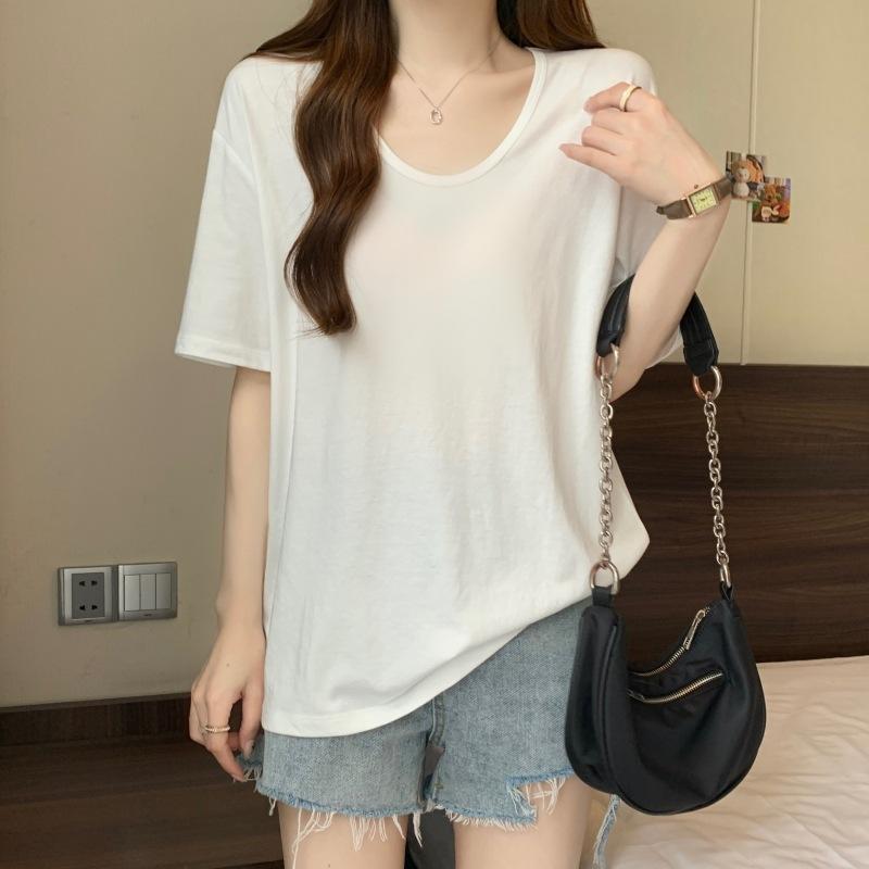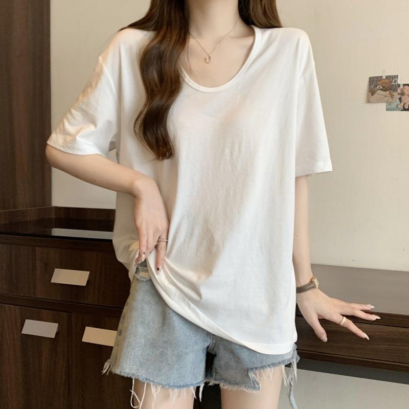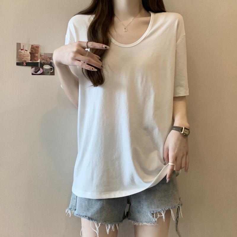 Compra Camiseta de Algodón Puro de Manga Corta para Mujer Color Puro Verano 2025 Nuevo Delgada Cuello U Holgada Casual Estilo Coreano Top Sencillo Venta al por Mayor al por mayor en Joom.pro