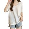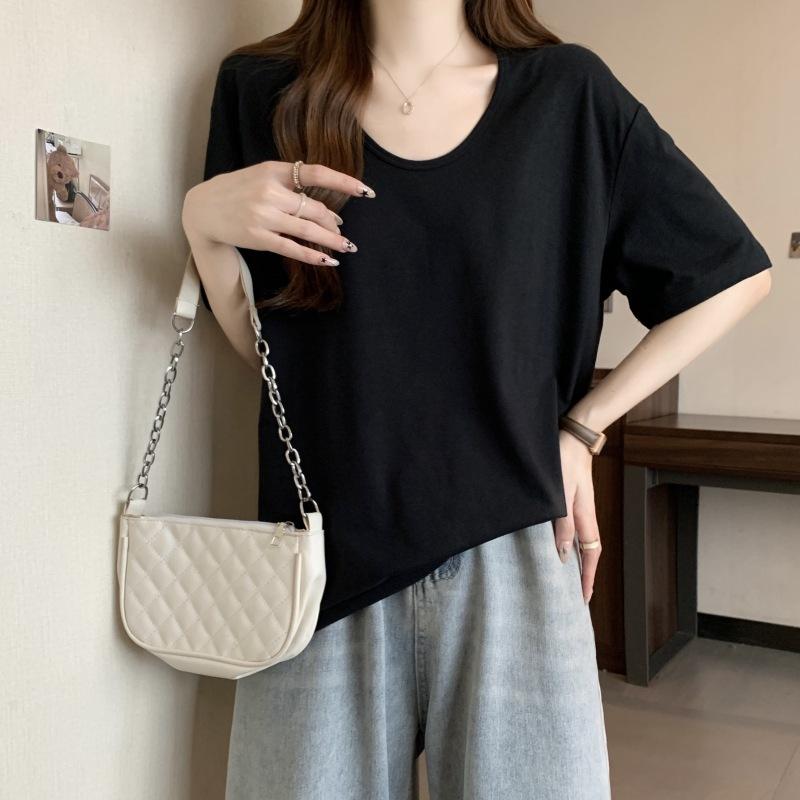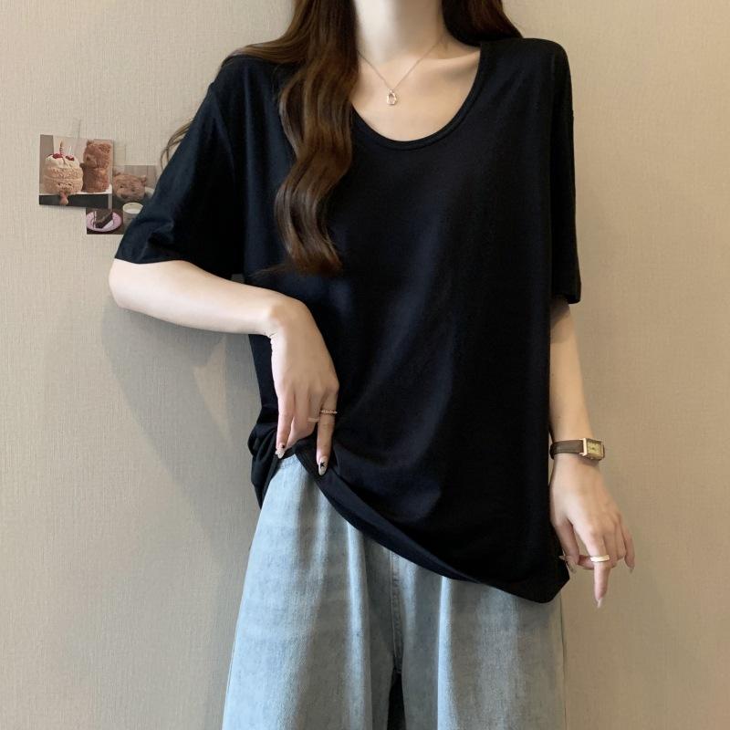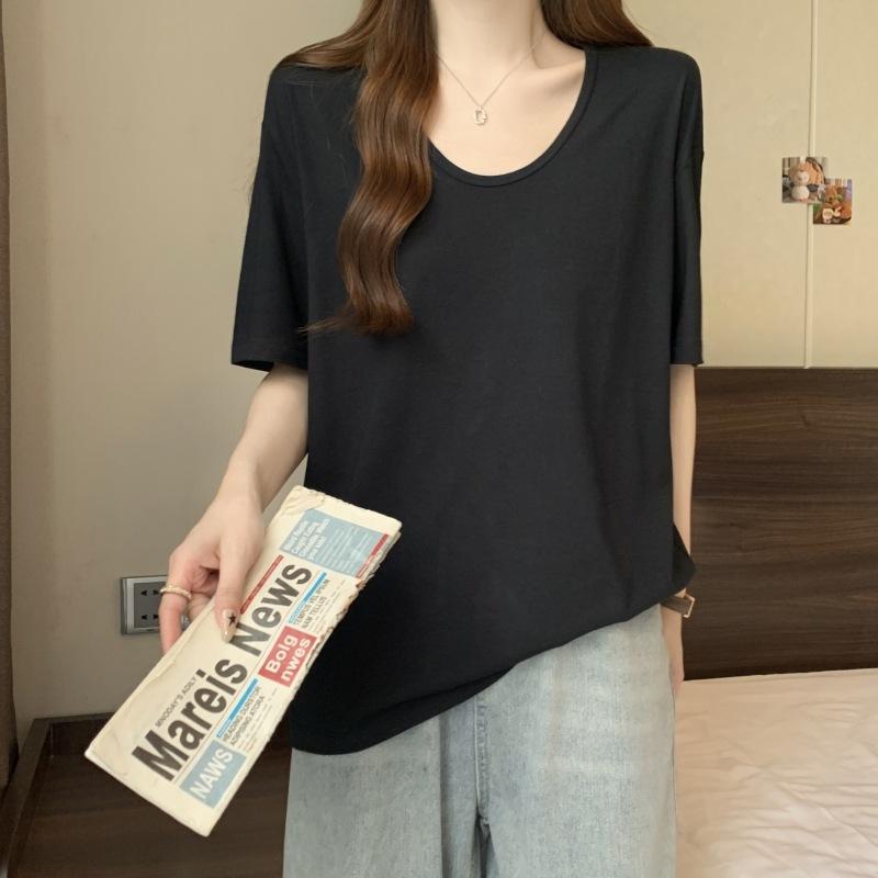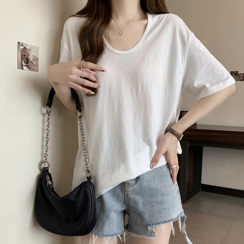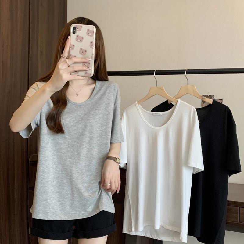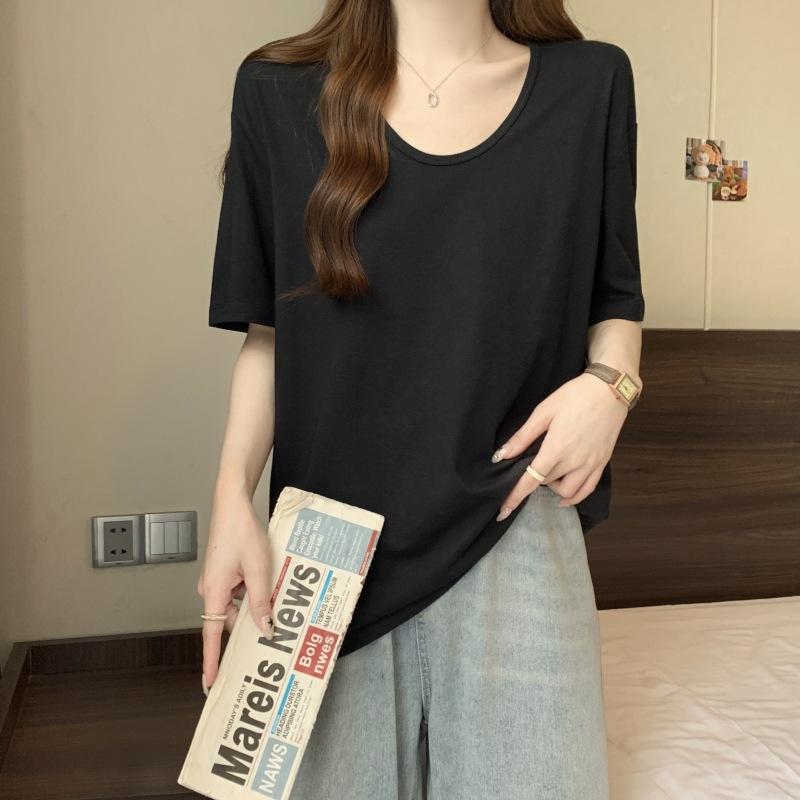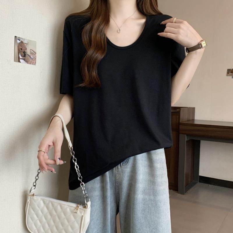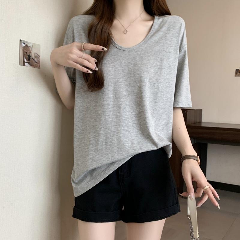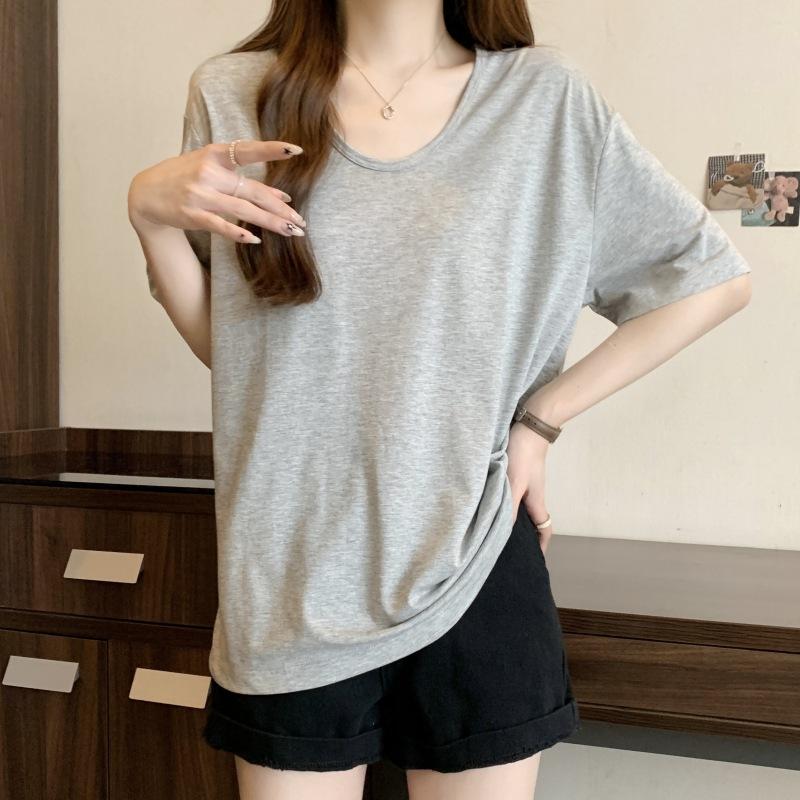 Compra Camiseta de Algodón Puro de Manga Corta para Mujer Color Puro Verano 2025 Nuevo Delgada Cuello U Holgada Casual Estilo Coreano Top Sencillo Venta al por Mayor al por mayor en Joom.pro