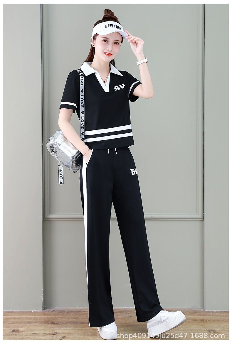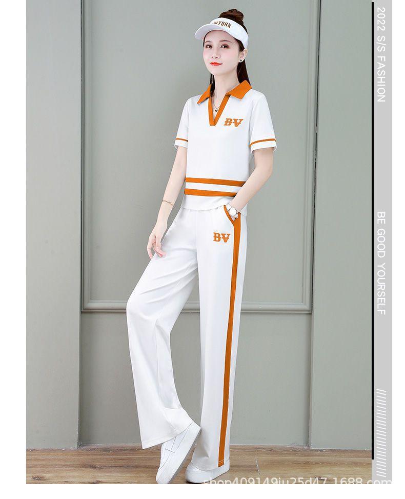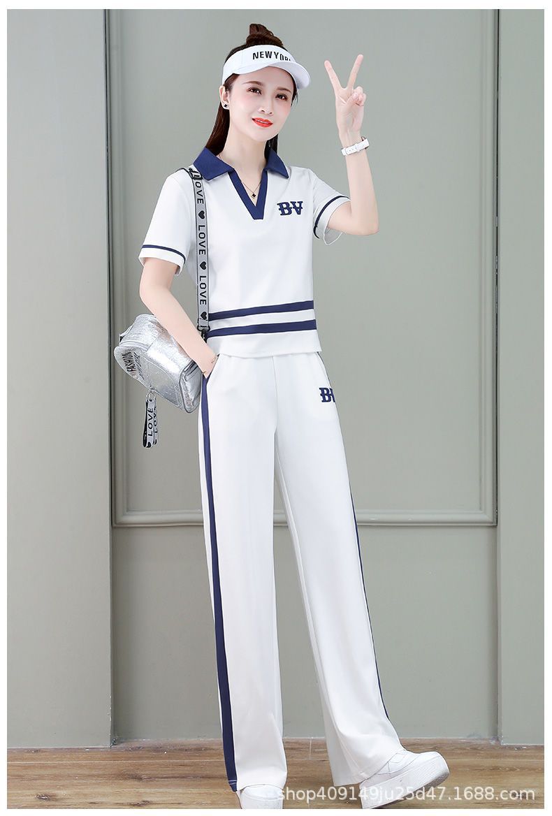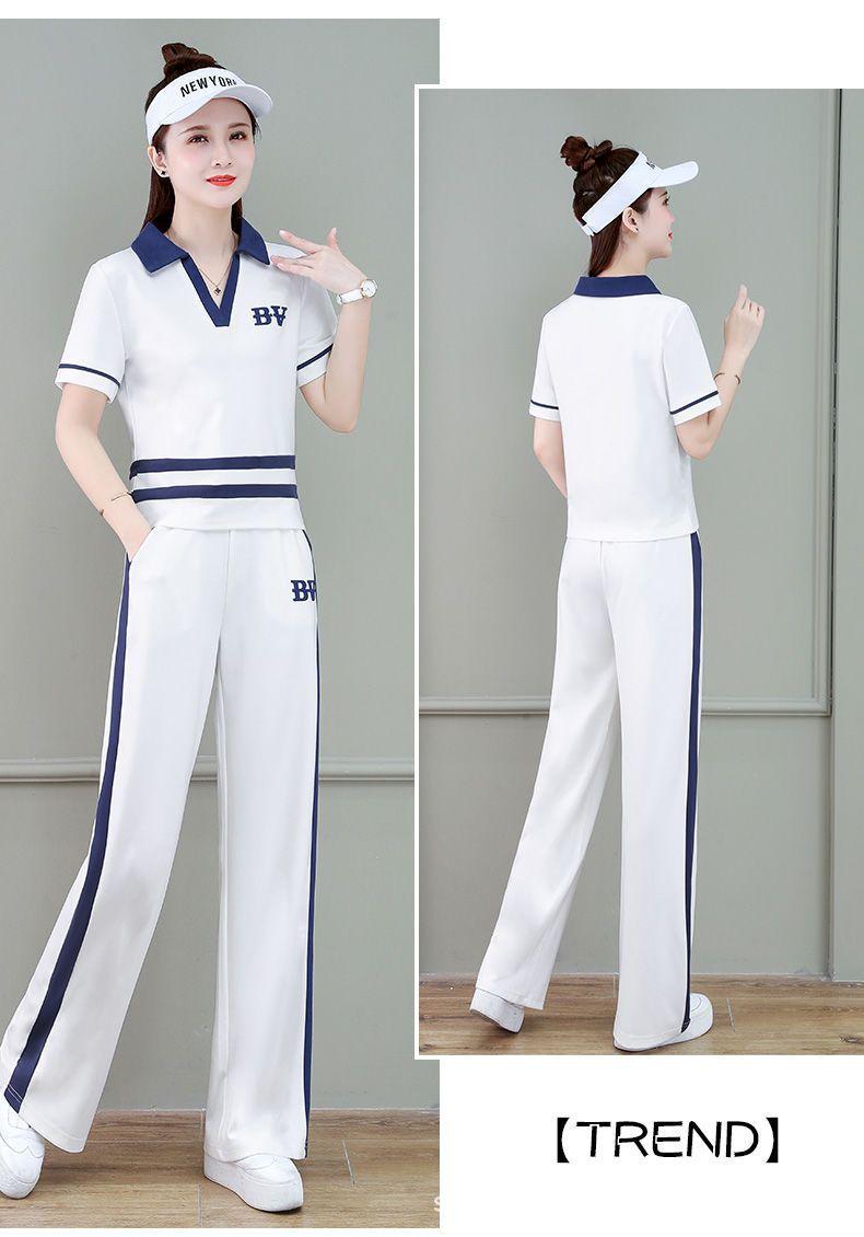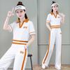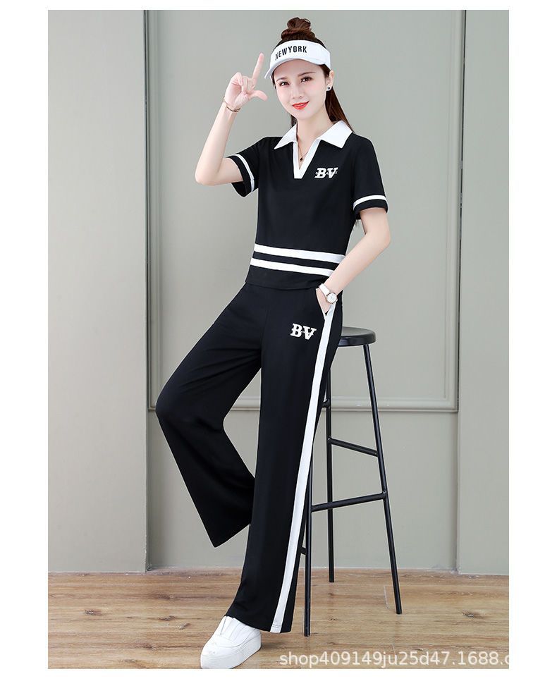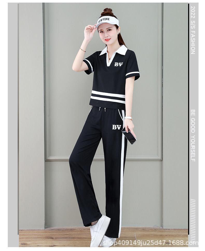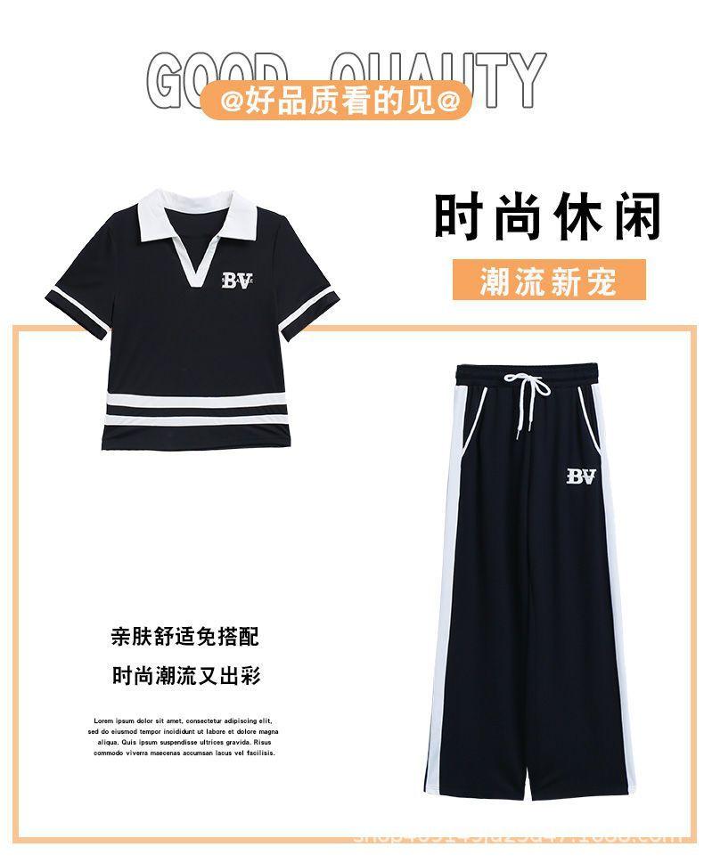 Traje deportivo informal de moda de verano 2024, camiseta de manga corta con solapa para mujer, pantalones anchos de estilo occidental antiedad, conjunto de dos piezas