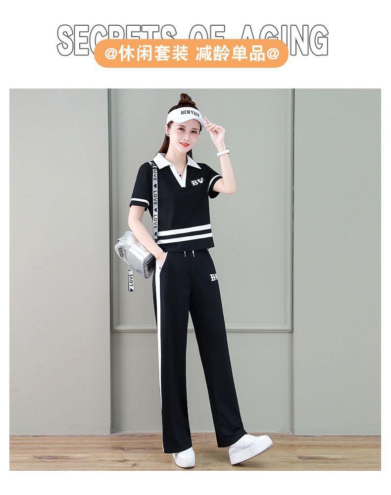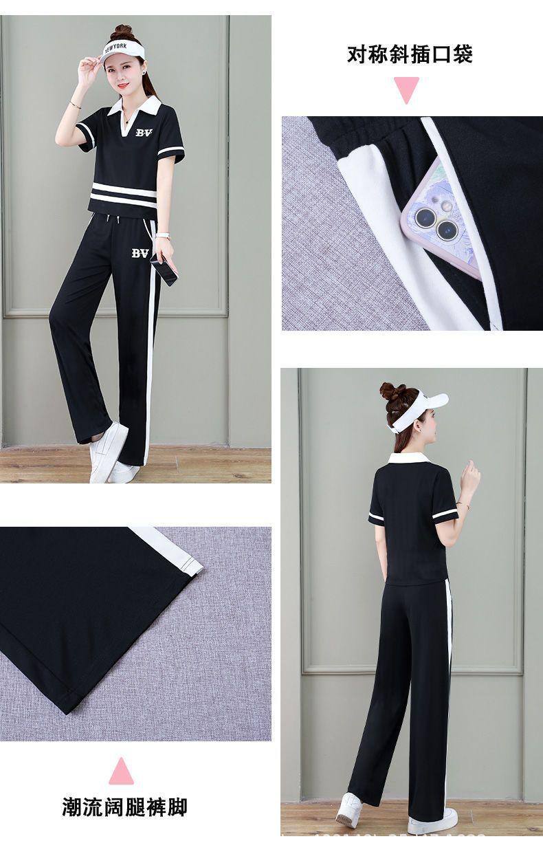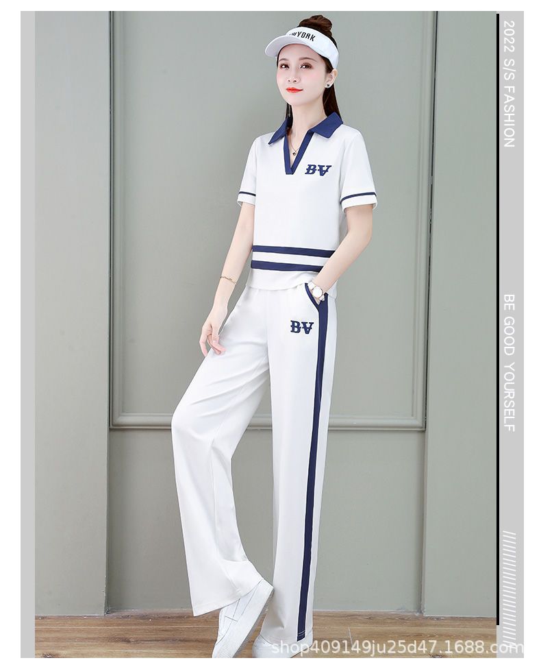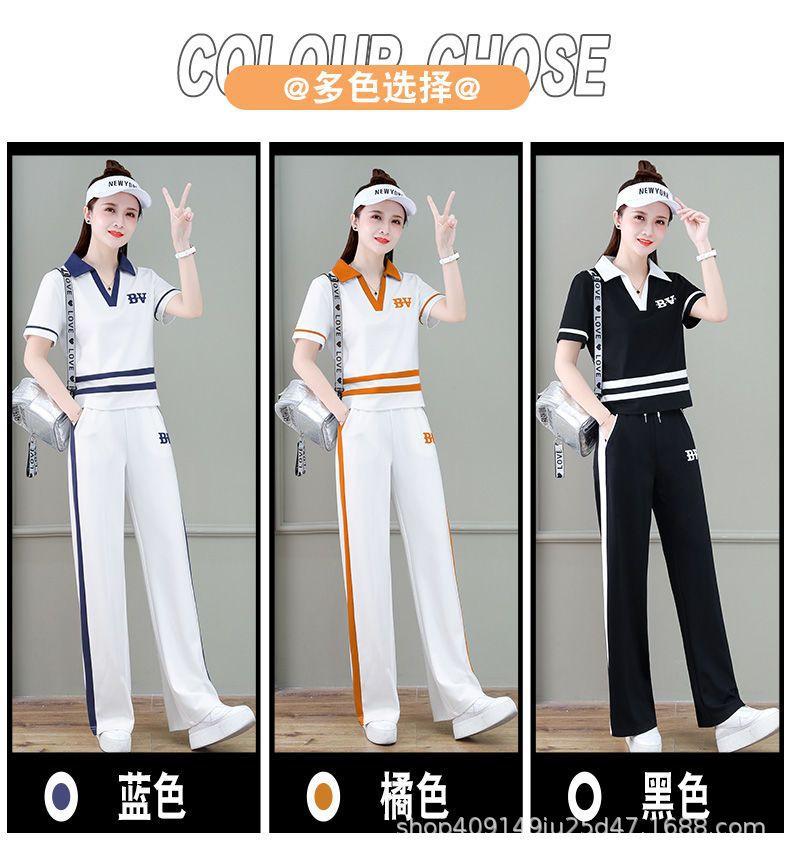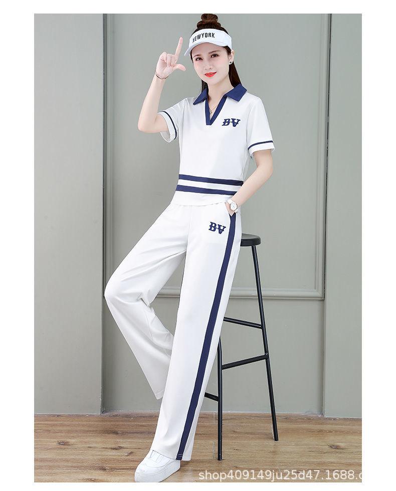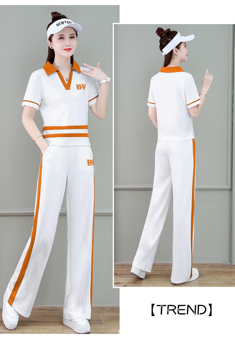 Traje deportivo informal de moda de verano 2024, camiseta de manga corta con solapa para mujer, pantalones anchos de estilo occidental antiedad, conjunto de dos piezas