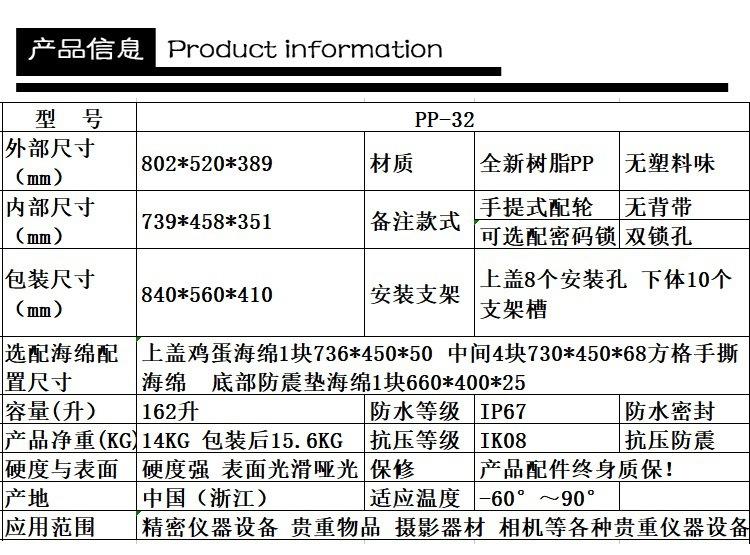 Caja externa de seguridad de plástico PP-32 con esponja, caja protectora de plástico, caja para instrumentos de herramientas de equipo grande