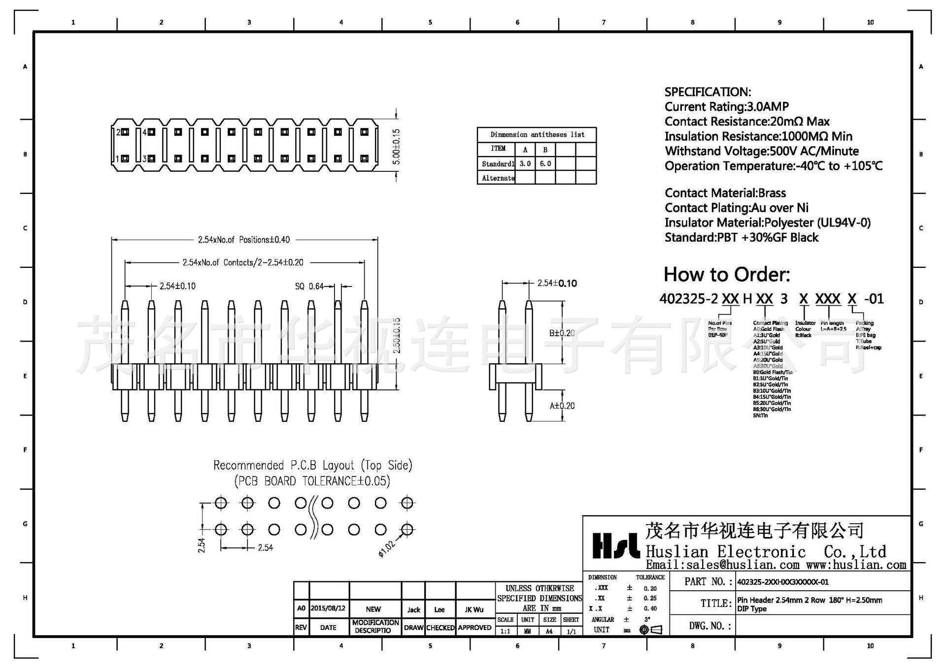 Conector de pines rectos de doble fila de 2.54 mm, placa de enchufe de 180 grados, pin de placa a placa H = 2.5 mm, pin vertical
