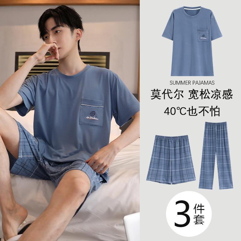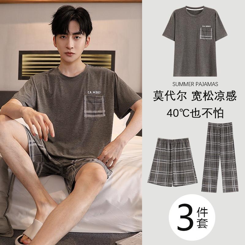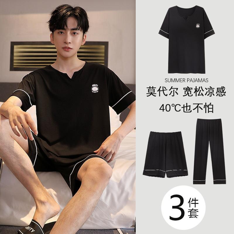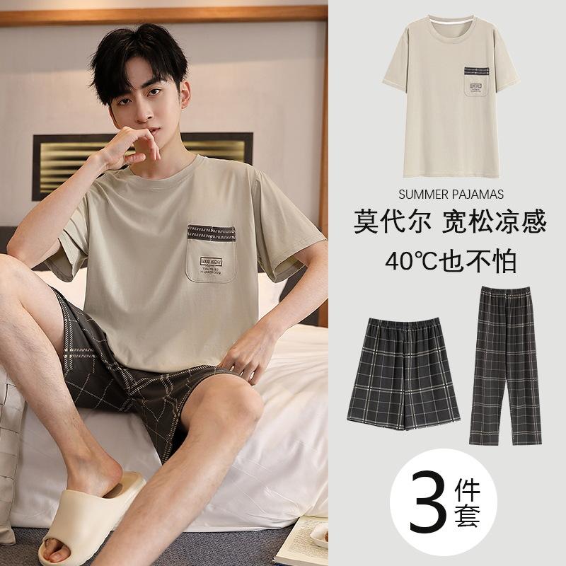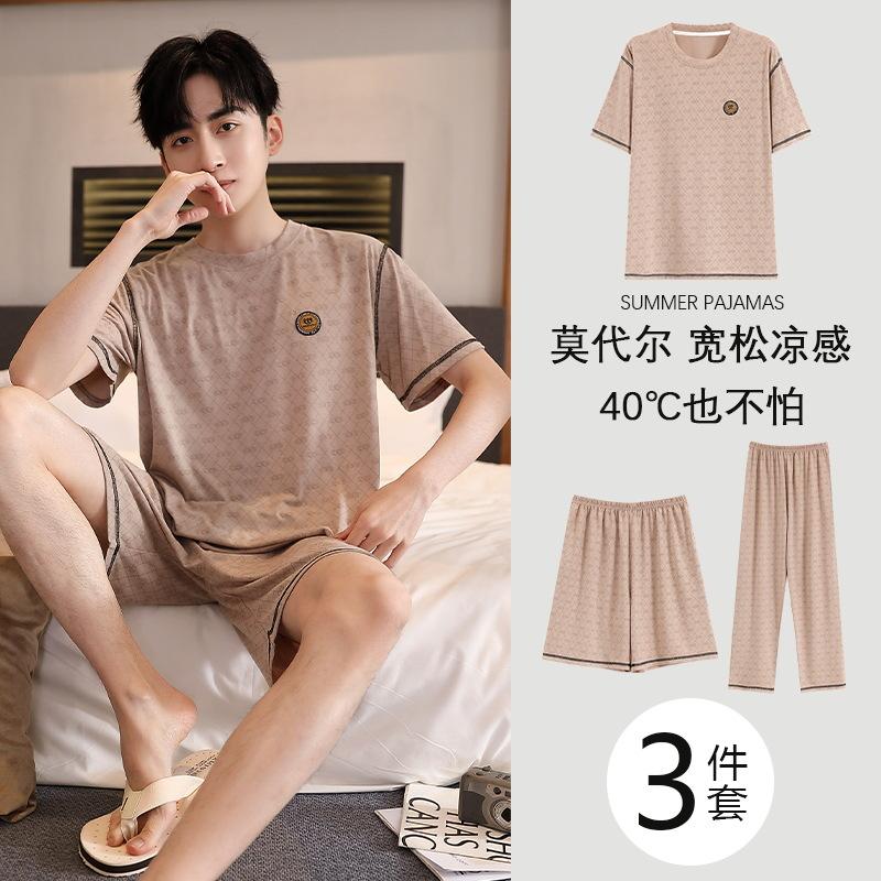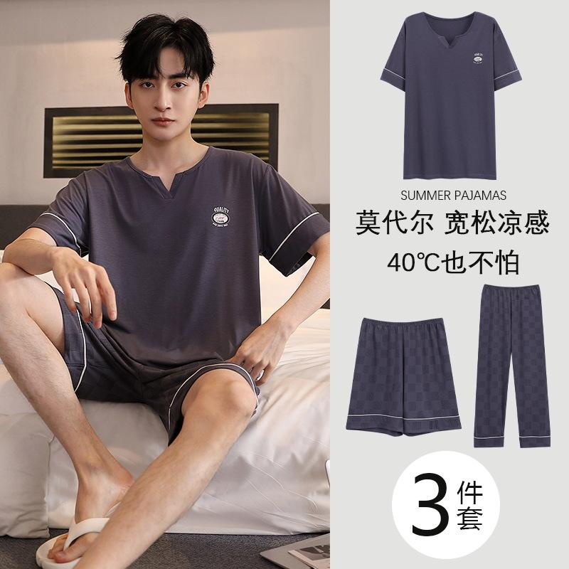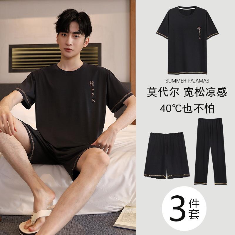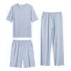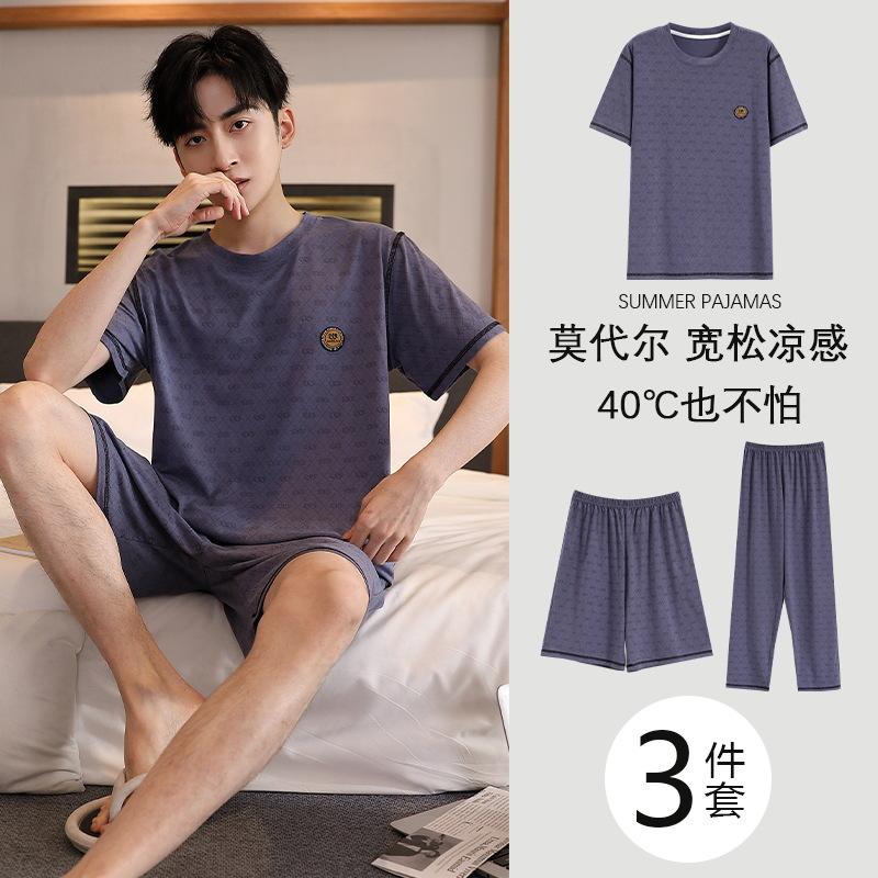 Pijama de verano para hombre, de manga corta, de modal, con pantalones finos, conjunto de tres piezas, de seda de hielo, talla grande