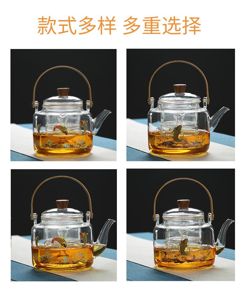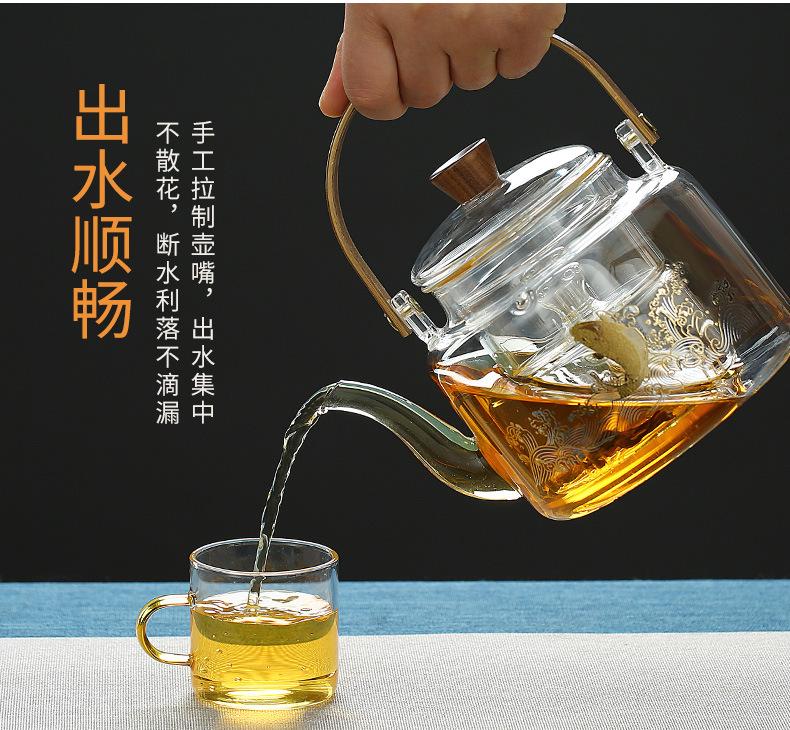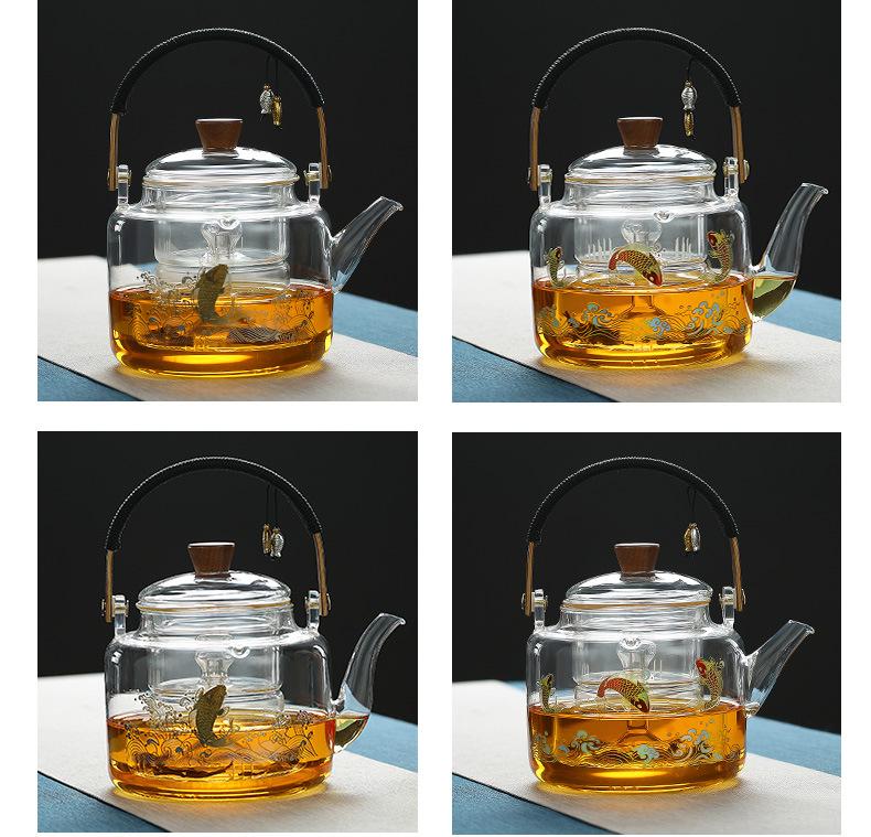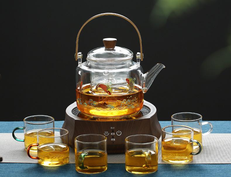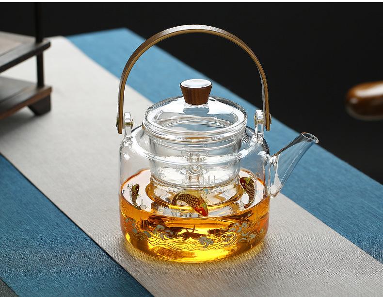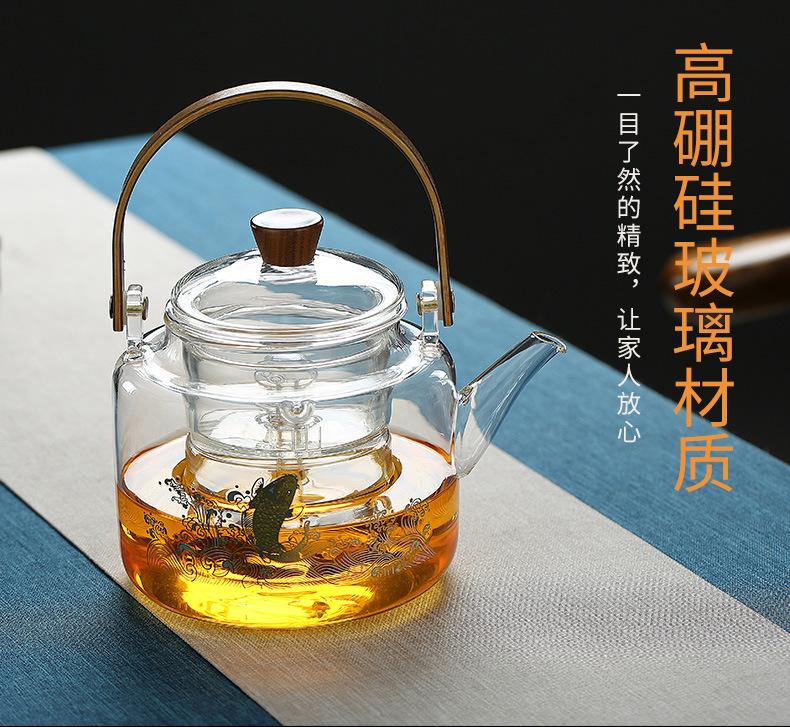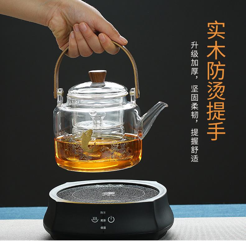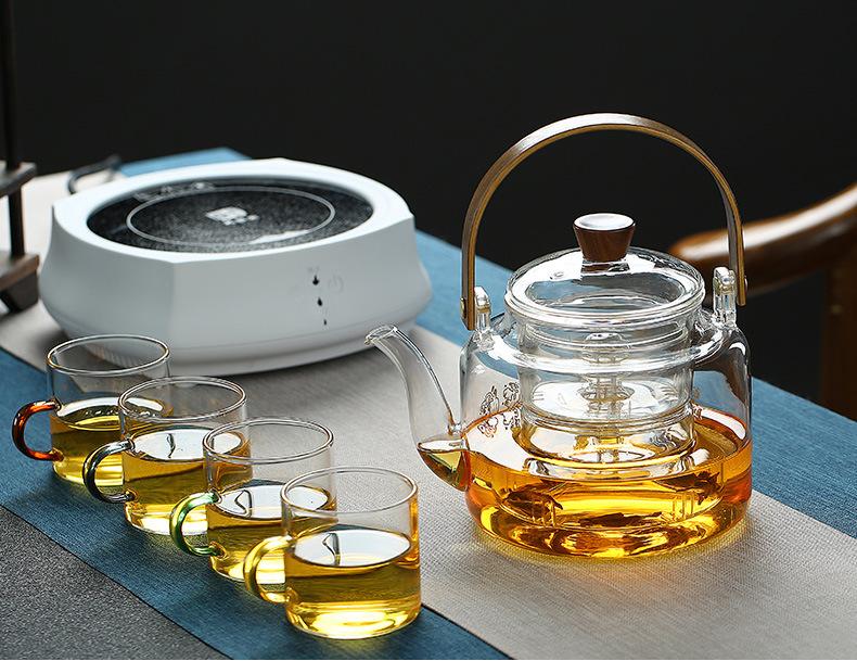 Tetera de vidrio con viga elevadora al por mayor, tetera para hervir té, tetera para cocinar, olla doble para cocinar, tetera integrada, tetera de punto