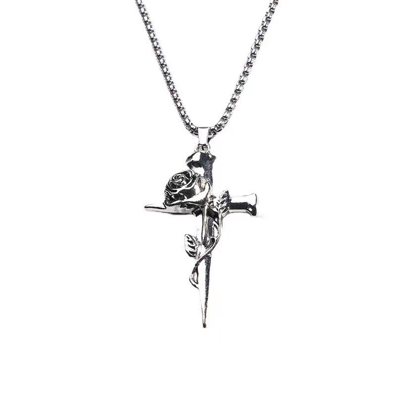 Collar largo con colgante de aleación de cruz rosa vintage para hombre y mujer, estilo hipster, estilo hip hop
