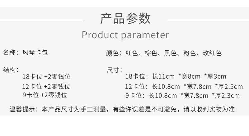 Black-Debit 9, Coffee-Card 9, Rose Red-Card 9, Black -18, Coffee-Card 18, Rose Red-Card 18