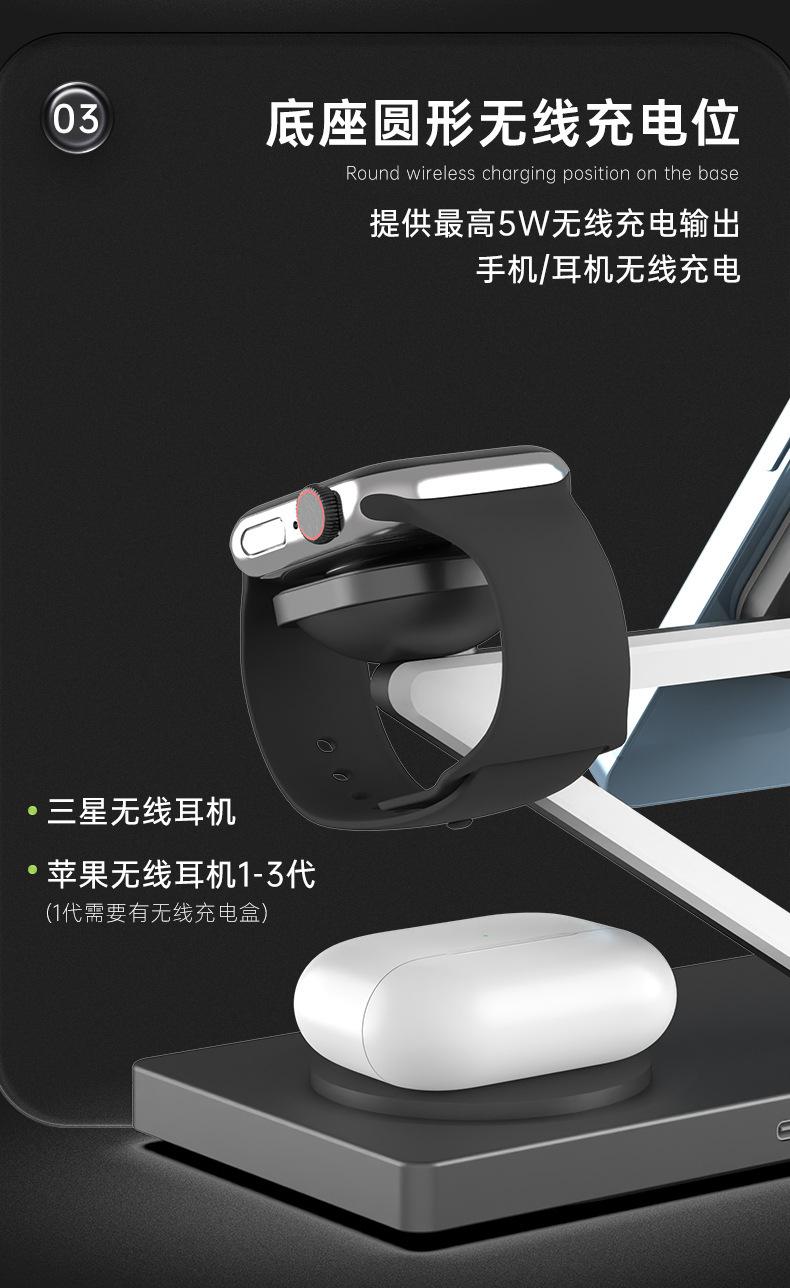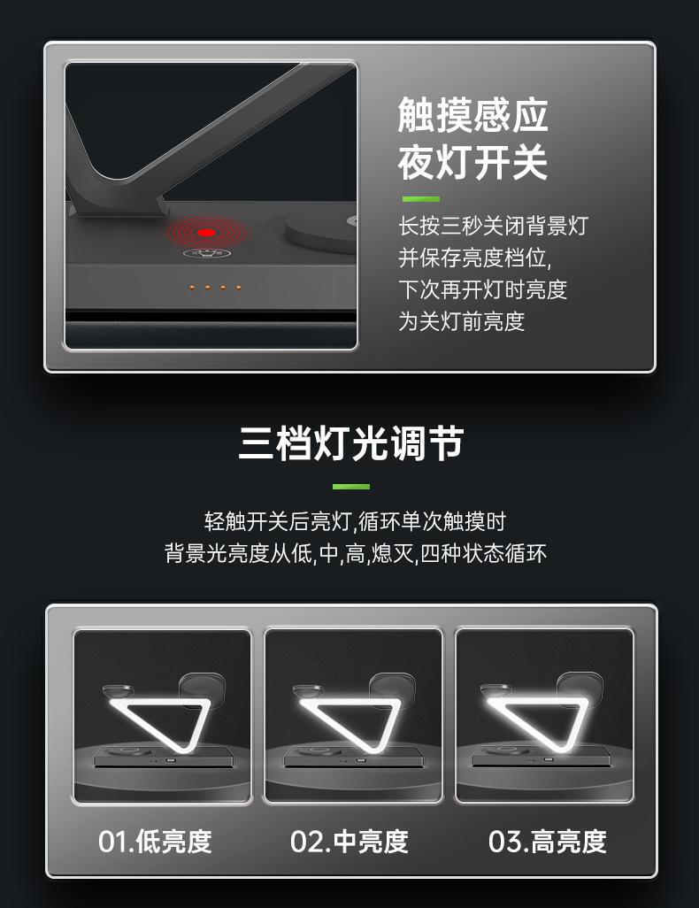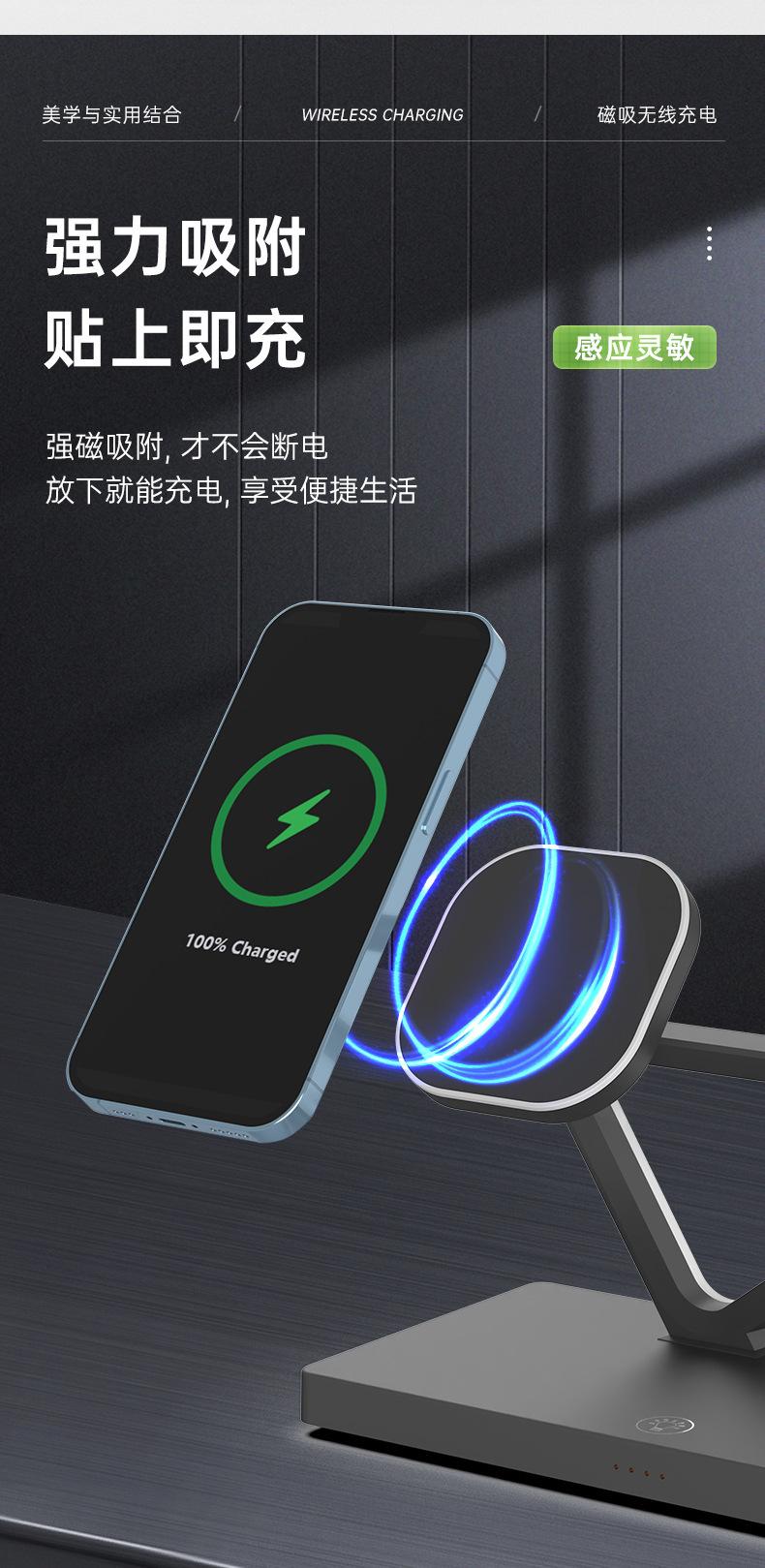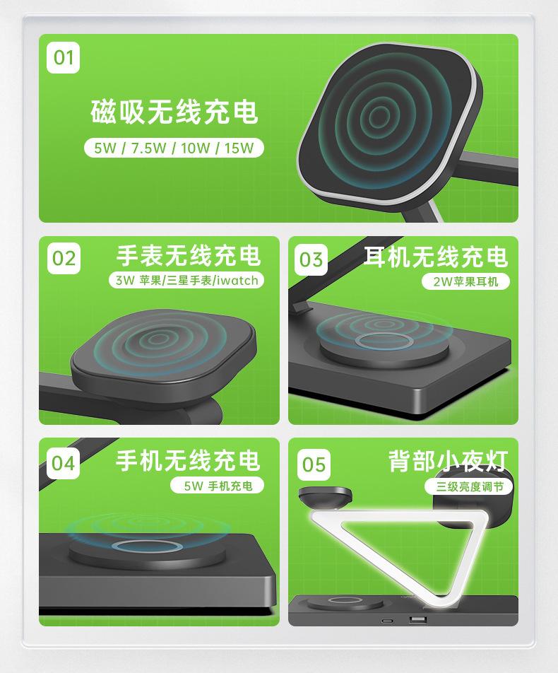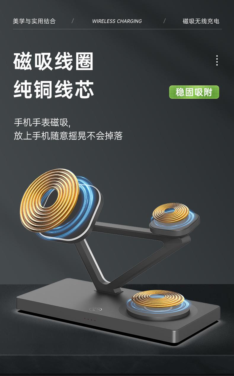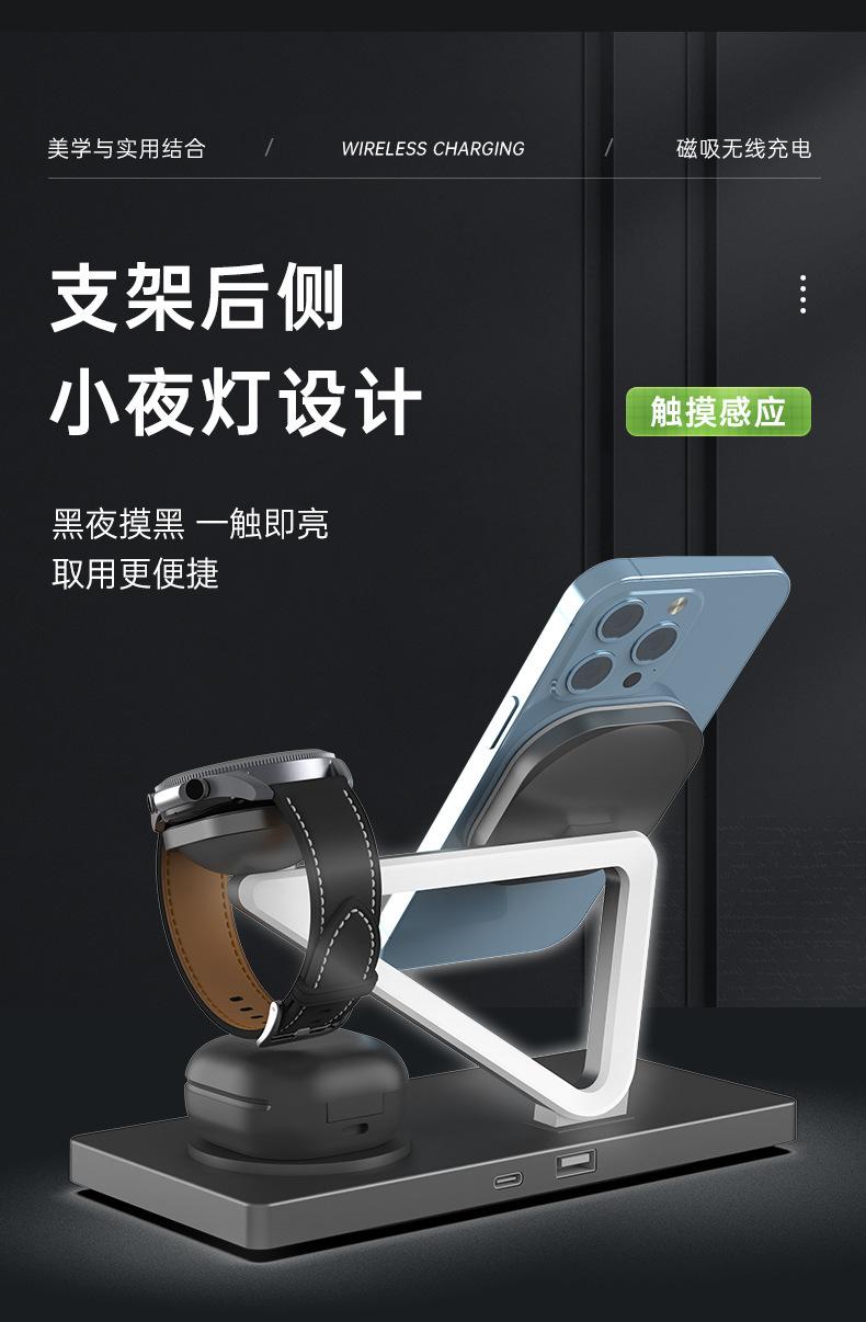 Cargador inalámbrico tres en uno con luz nocturna transfronteriza, soporte de escritorio para teléfono móvil, reloj, auriculares, cargador magnético