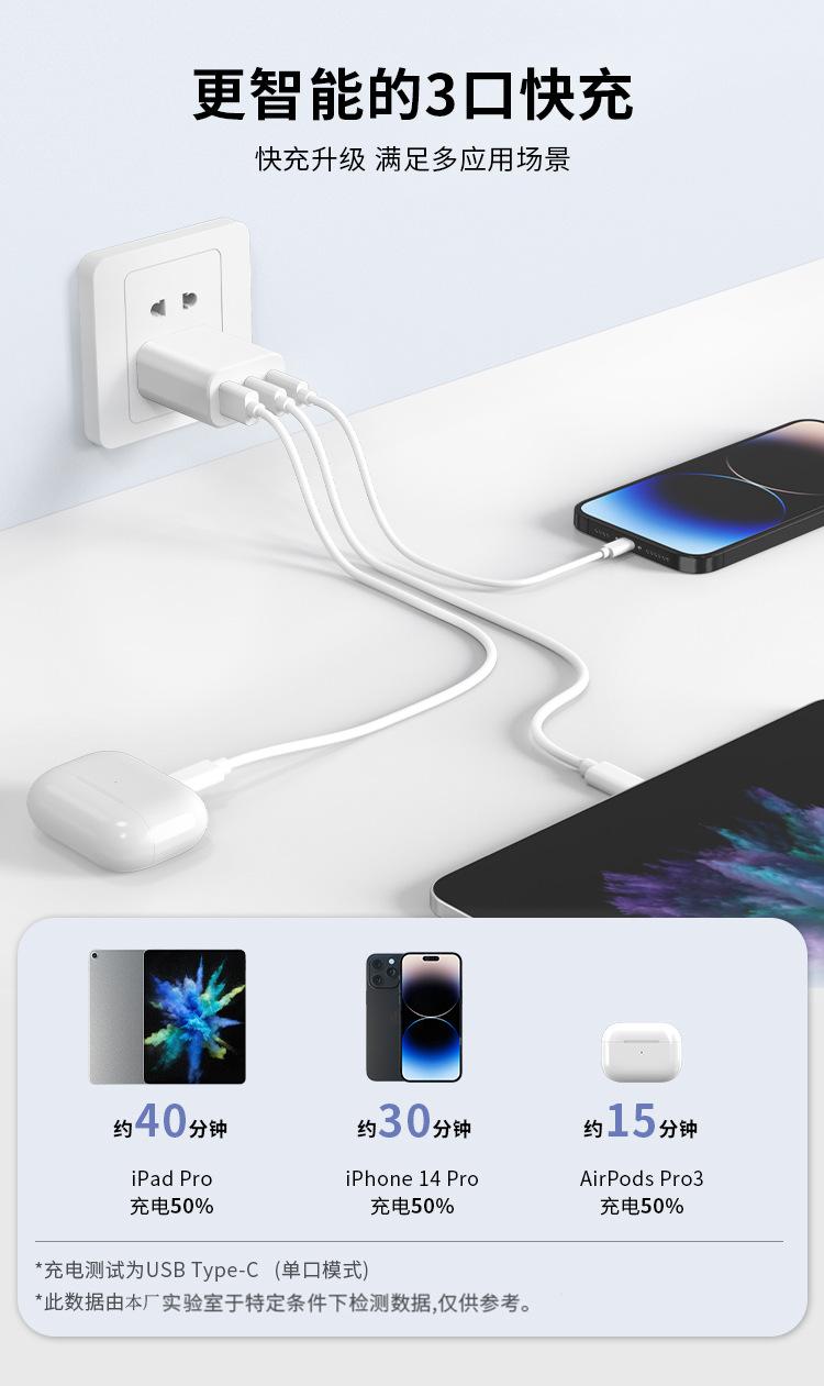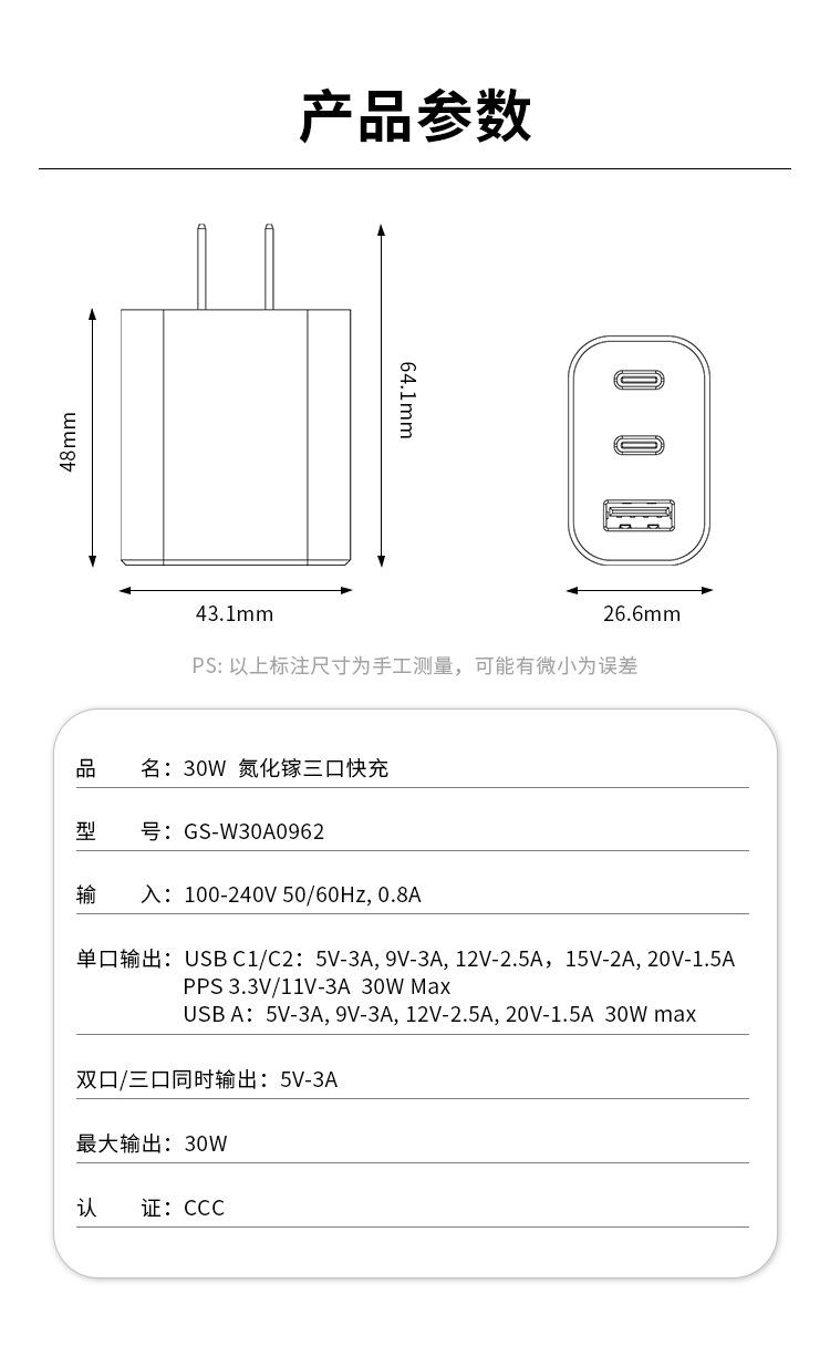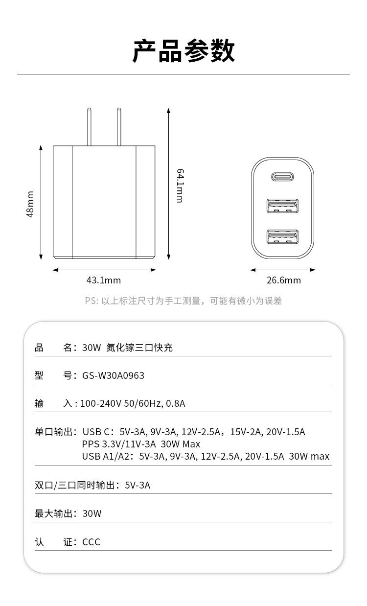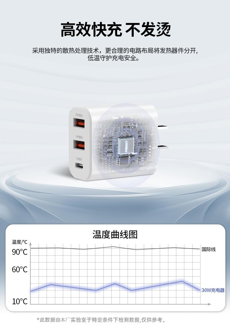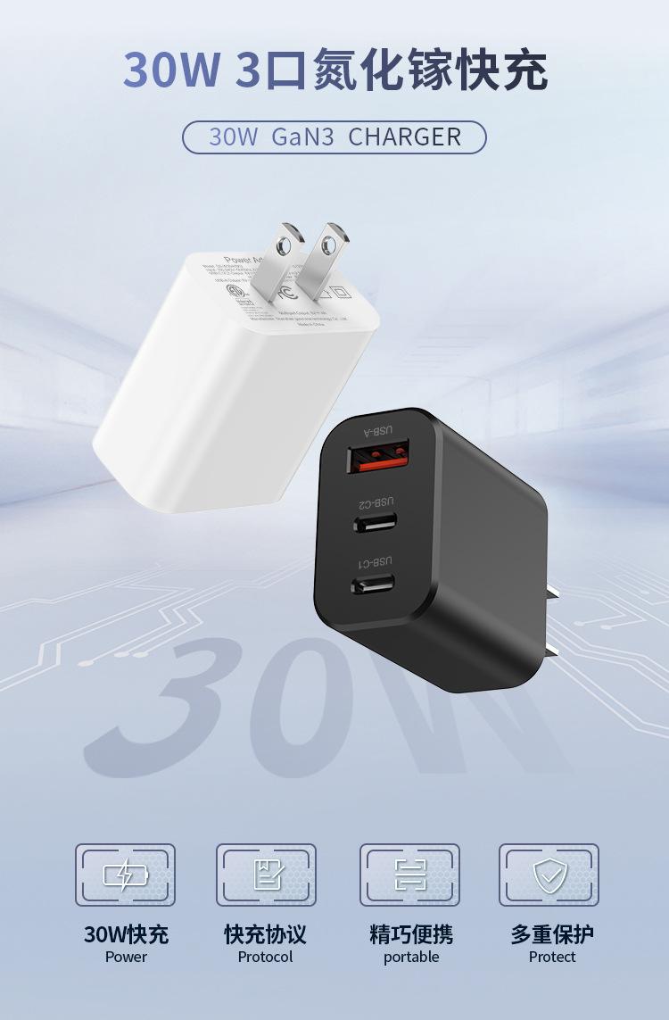 Cargador GaN 2C + A multipuerto PD30W US ETL Cargador mediano 3C 2A + C Cargador para teléfono móvil QC30W
