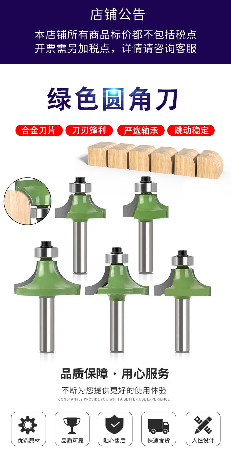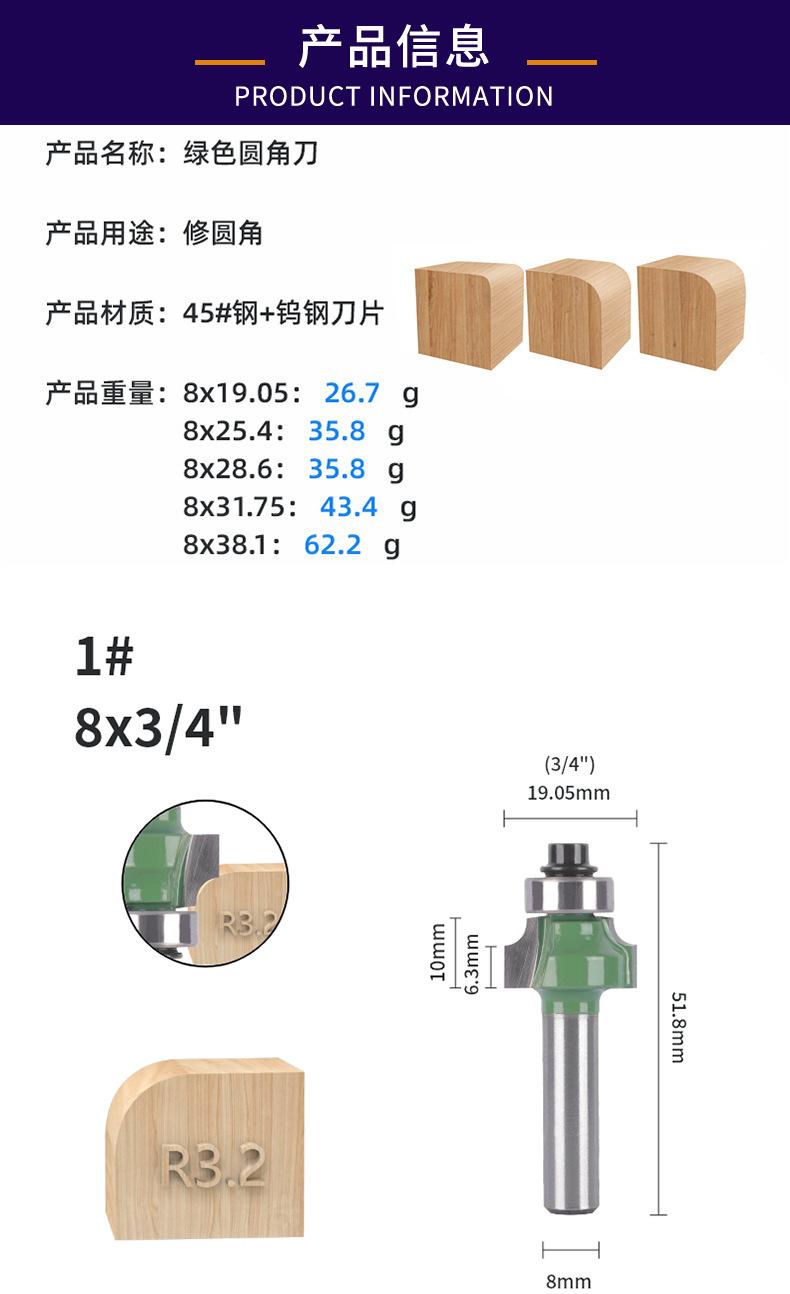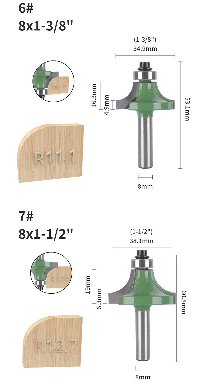 Cortador de ángulo redondo 8 mango verde juego de 5 piezas aleación de acero de tungsteno cortador de ángulo redondo biselado fresa para carpintería