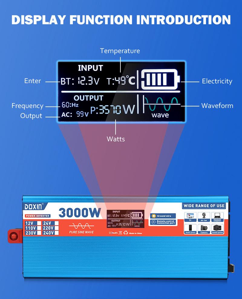 Venta caliente transfronteriza onda sinusoidal pura 3000W Pantalla LCD inteligente Monitoreo fotovoltaico RV fuente de alimentación inversor esencial con control remoto