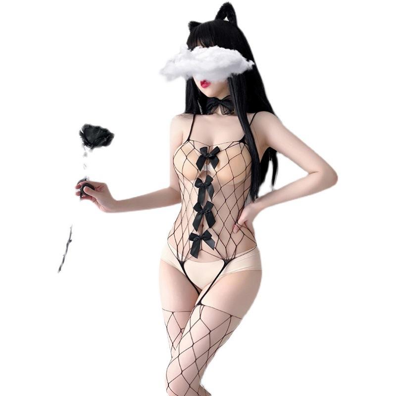 Medias de red con lazo para mujer, lencería sexy de cuerpo completo con entrepierna abierta, fáciles de insertar, finas de verano de una pieza, con tirantes huecos.