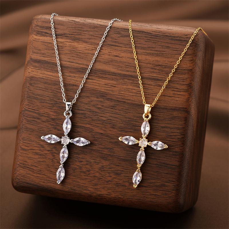 Collar de Cruz Transfronterizo Europeo y Americano de Venta Caliente Moda Micro-Incrustado Collar de Cruz para Mujer Cadena de Clavícula Moderna de Lujo Ligero Cadena de Clavícula de Acero de Titanio de Alta Gama