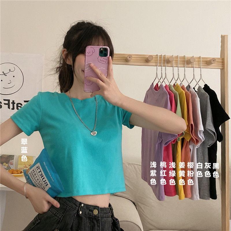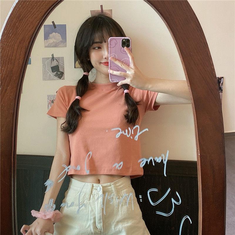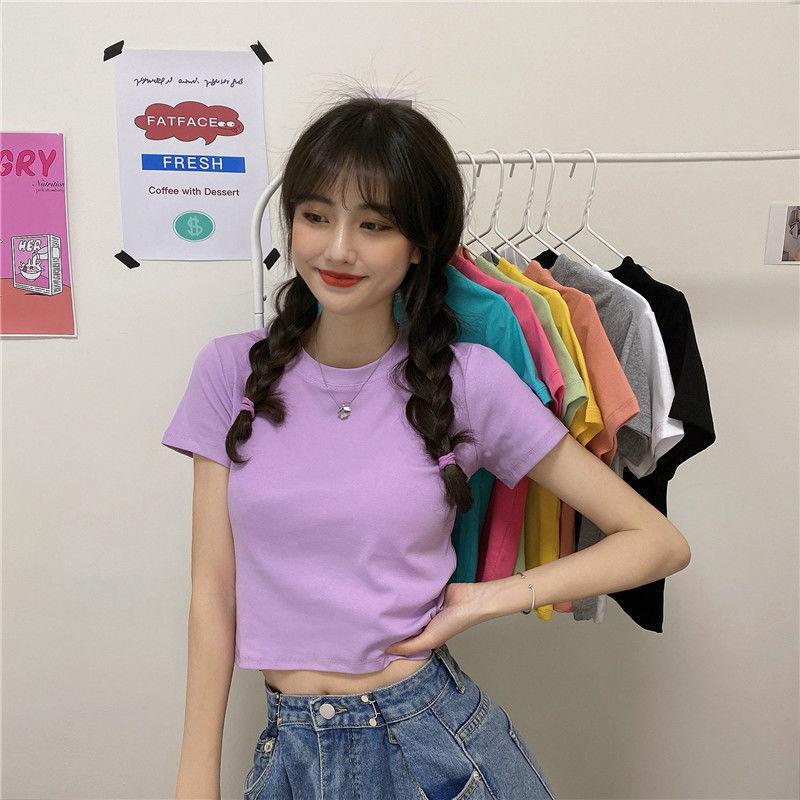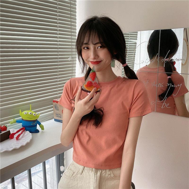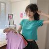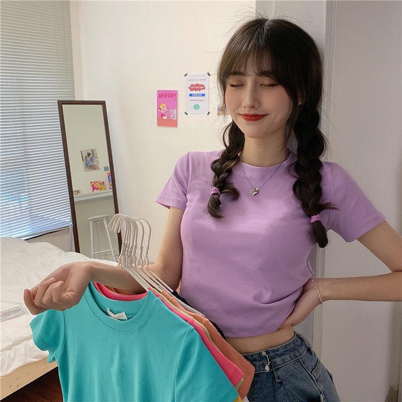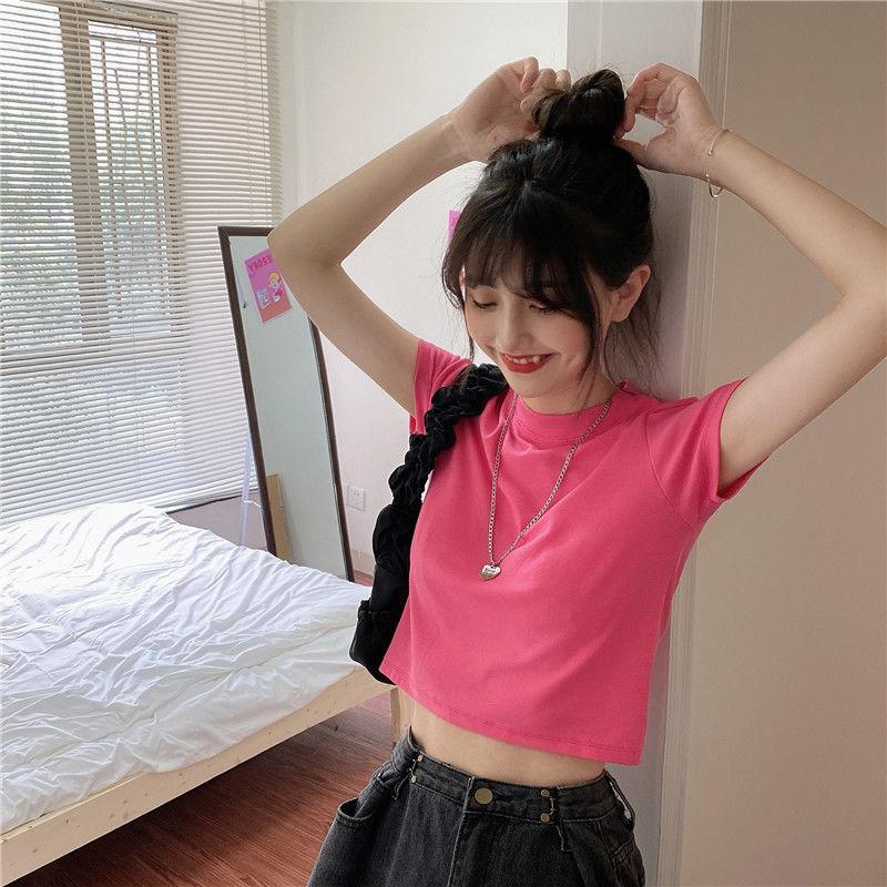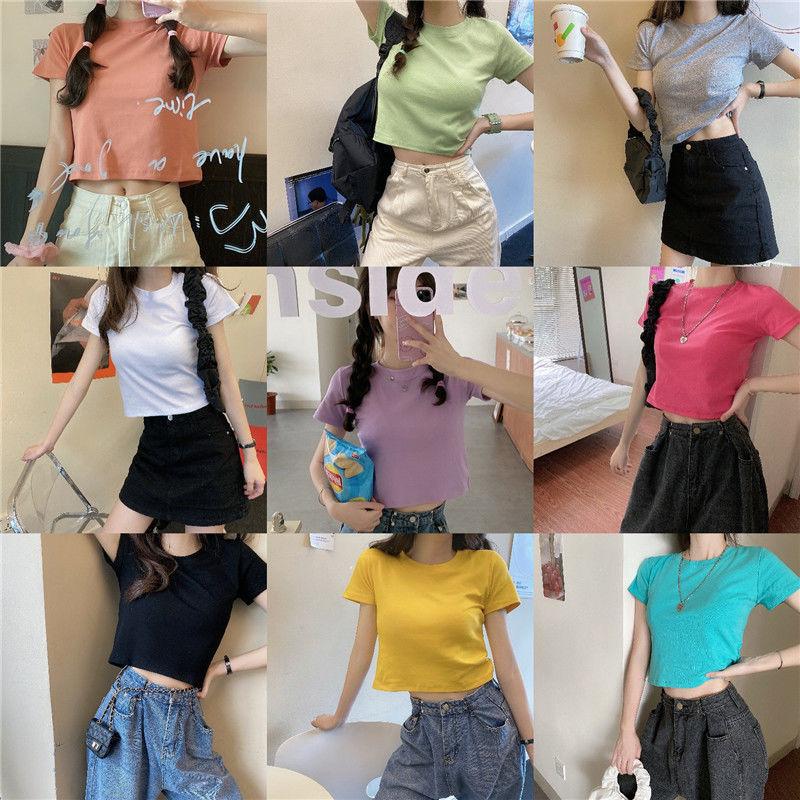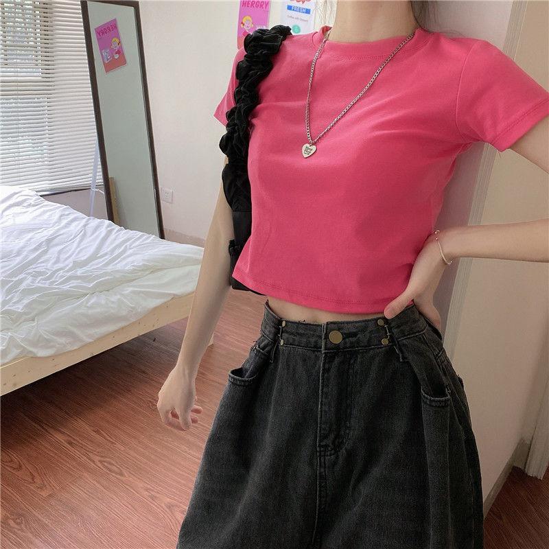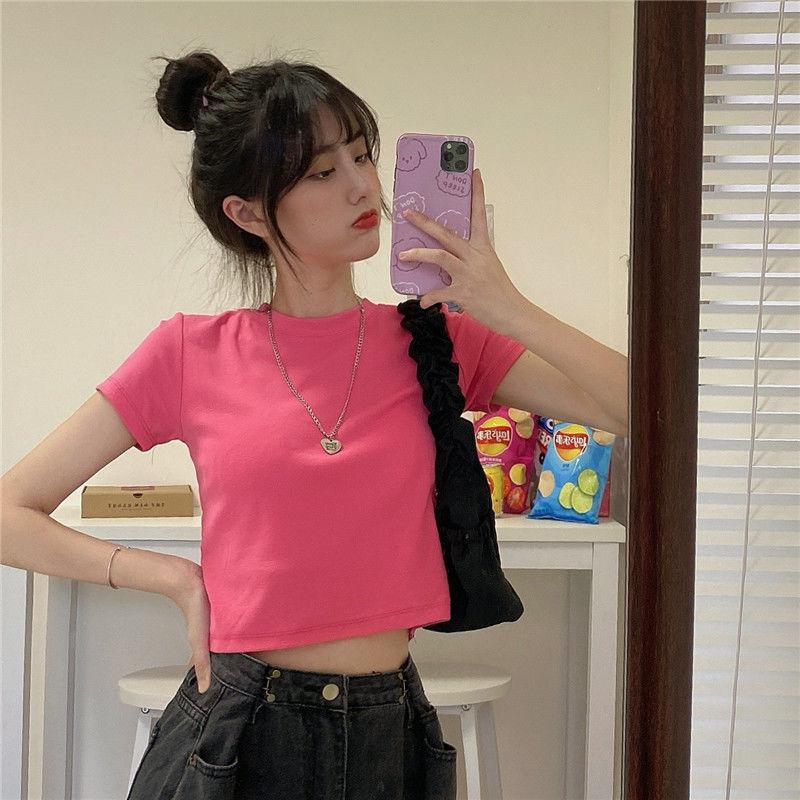 Camiseta de Manga Corta con Cuello Redondo Corto Color Caramelo para Mujer Verano 2025 Estilo Coreano Ropa de Mujer Comercio Exterior Tops de Mujer al Por Mayor