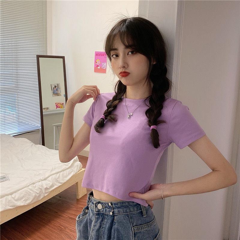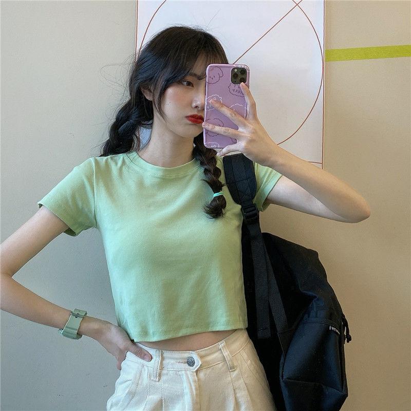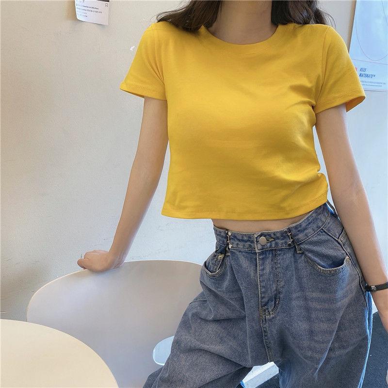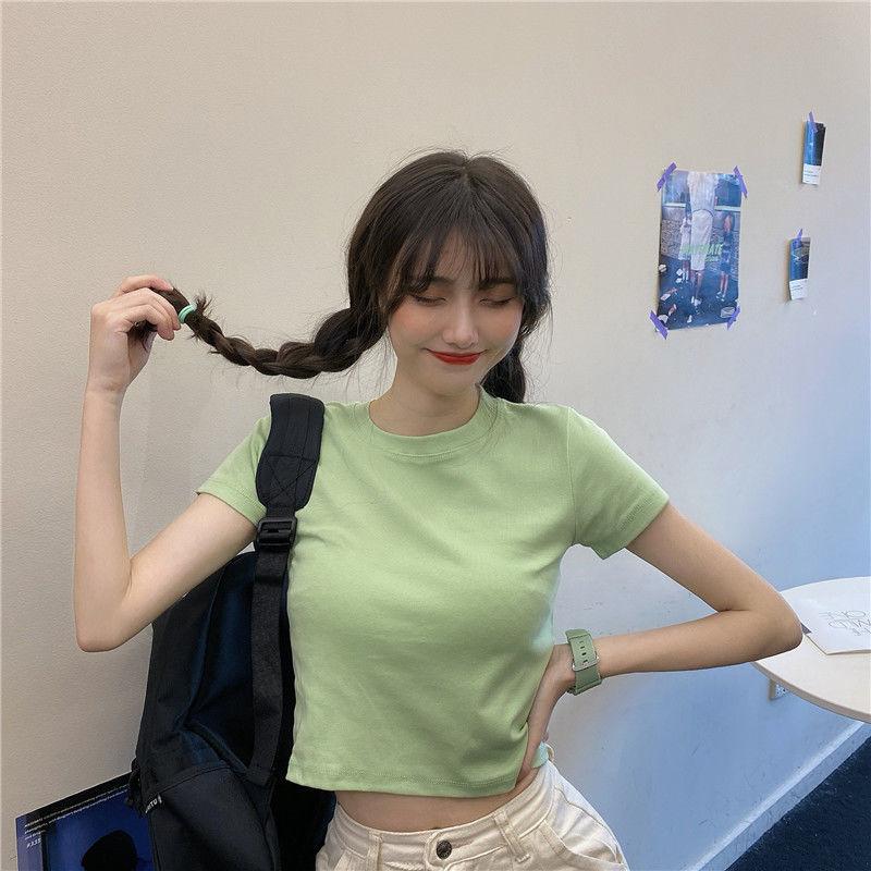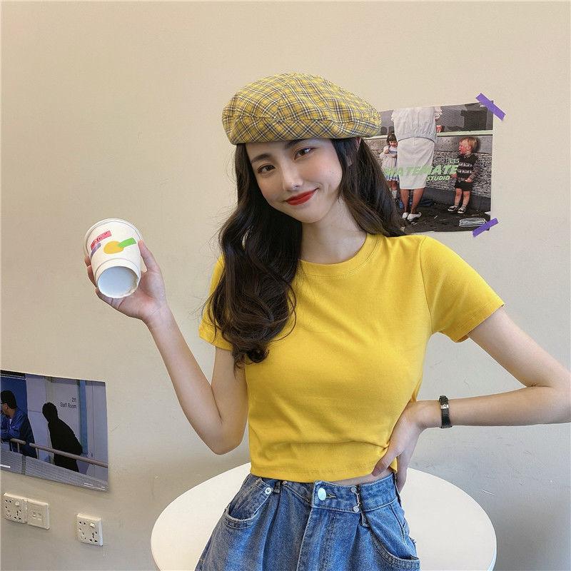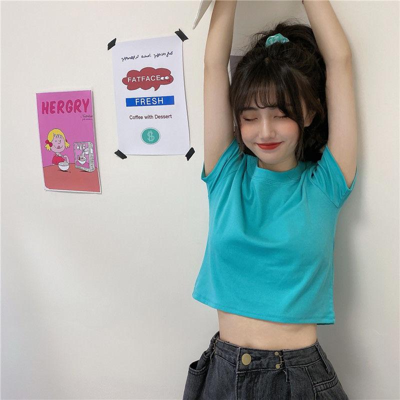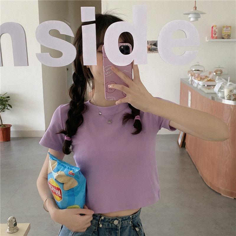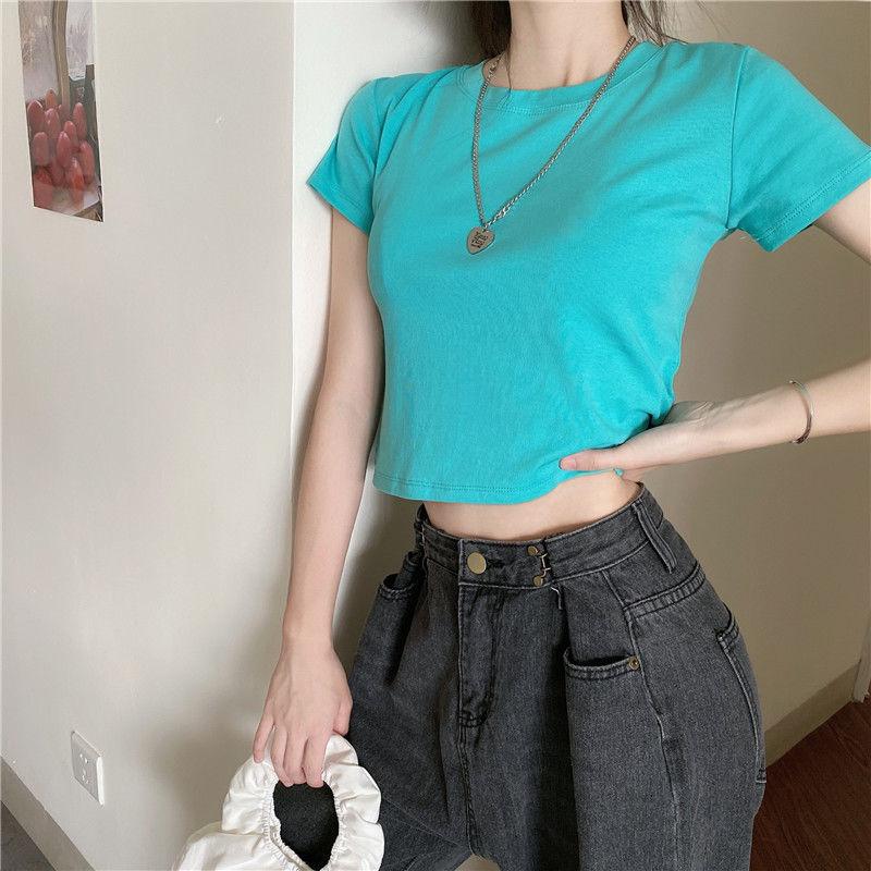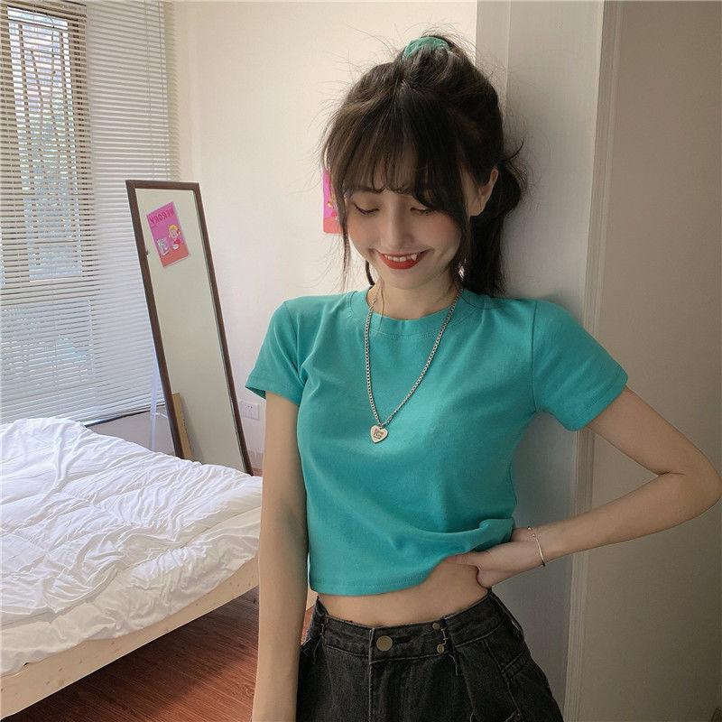 Camiseta de Manga Corta con Cuello Redondo Corto Color Caramelo para Mujer Verano 2025 Estilo Coreano Ropa de Mujer Comercio Exterior Tops de Mujer al Por Mayor