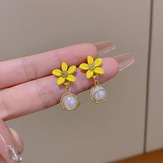 Pendientes de plata S925 con forma de flor de aguja y perla para mujer, pequeños, sencillos y de estilo frío, de alta gama, con un toque de bosque de hadas.