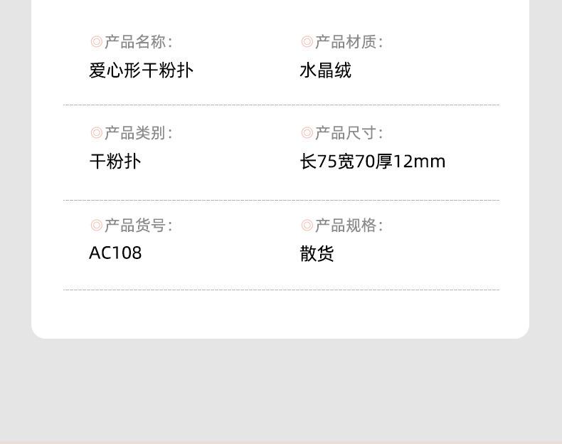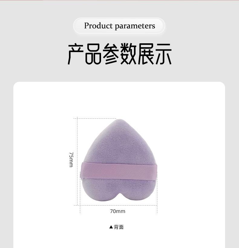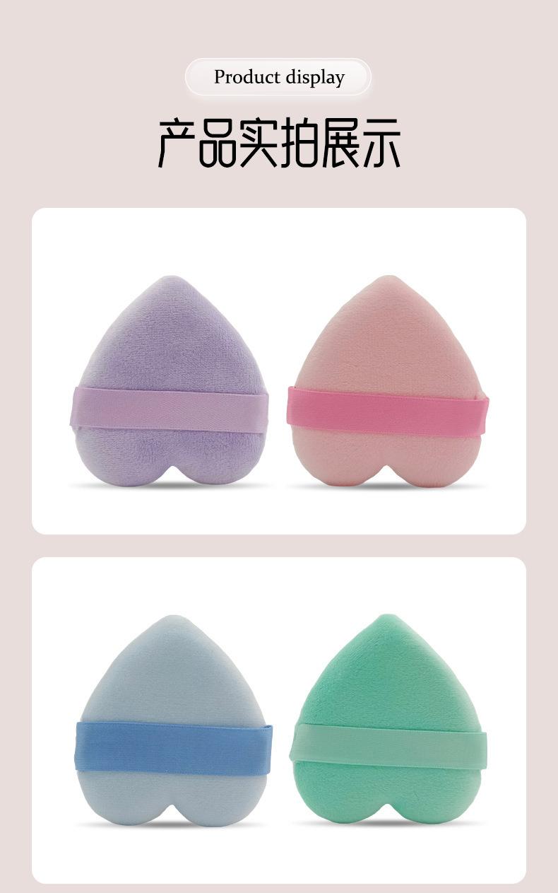 La borla de polvo flocada en forma de corazón para polvo seco es producida por [Suministros Cosméticos Dongguan Chuangmei]. El color, la forma, el empaque y el LOGO se pueden personalizar para la entrega. Para la personalización, por favor contacte al servicio al cliente