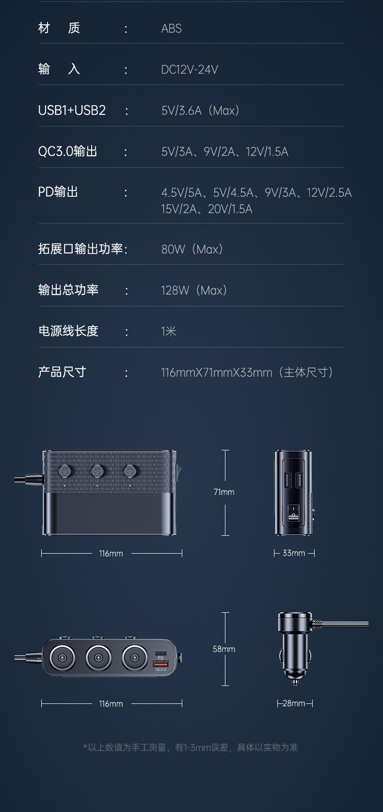 Potencia total: 128W Longitud de la línea: 1 metro USB1/USB2: 5 V/3,6 A (máx.) |